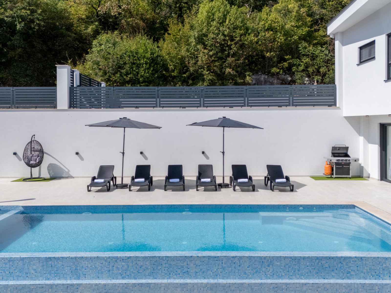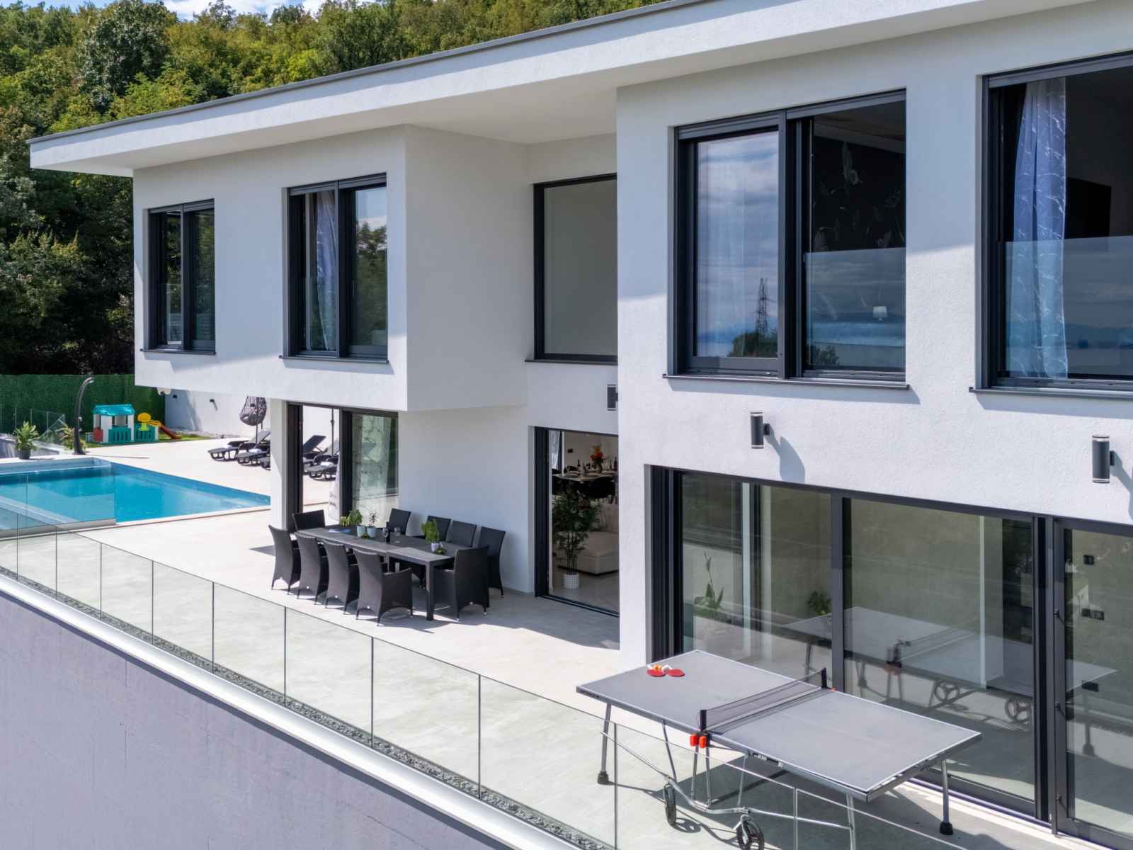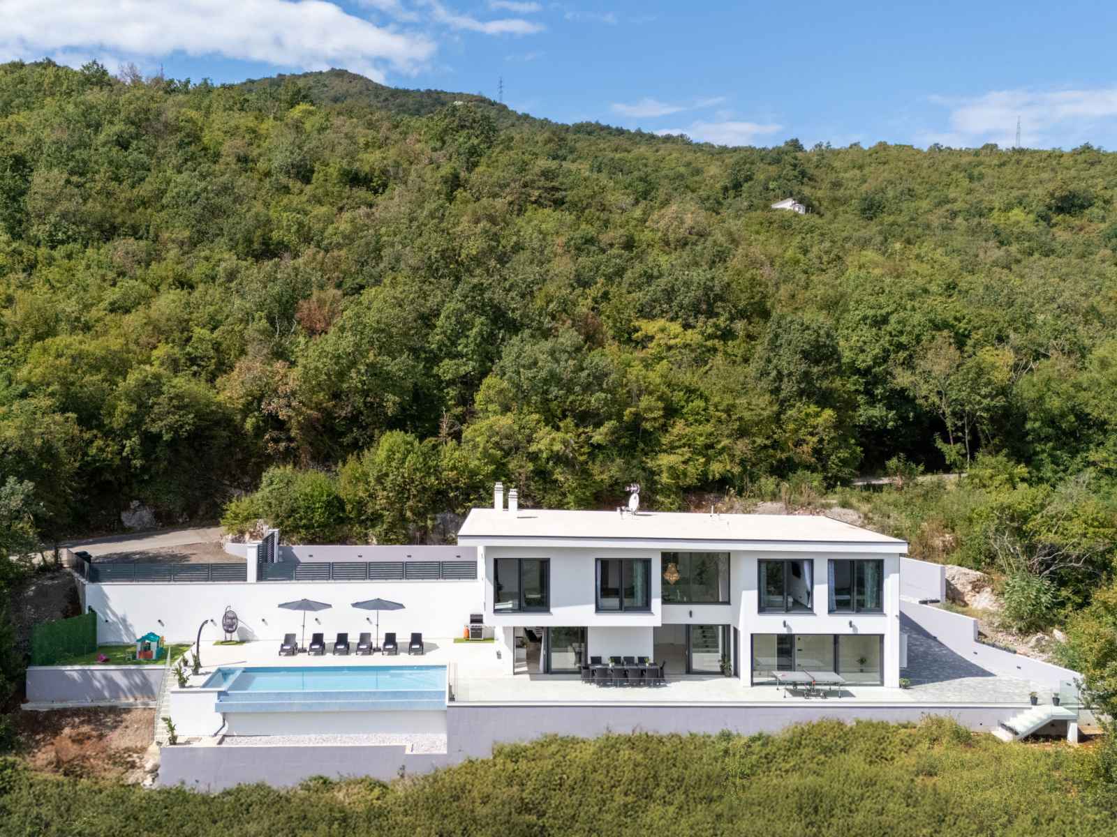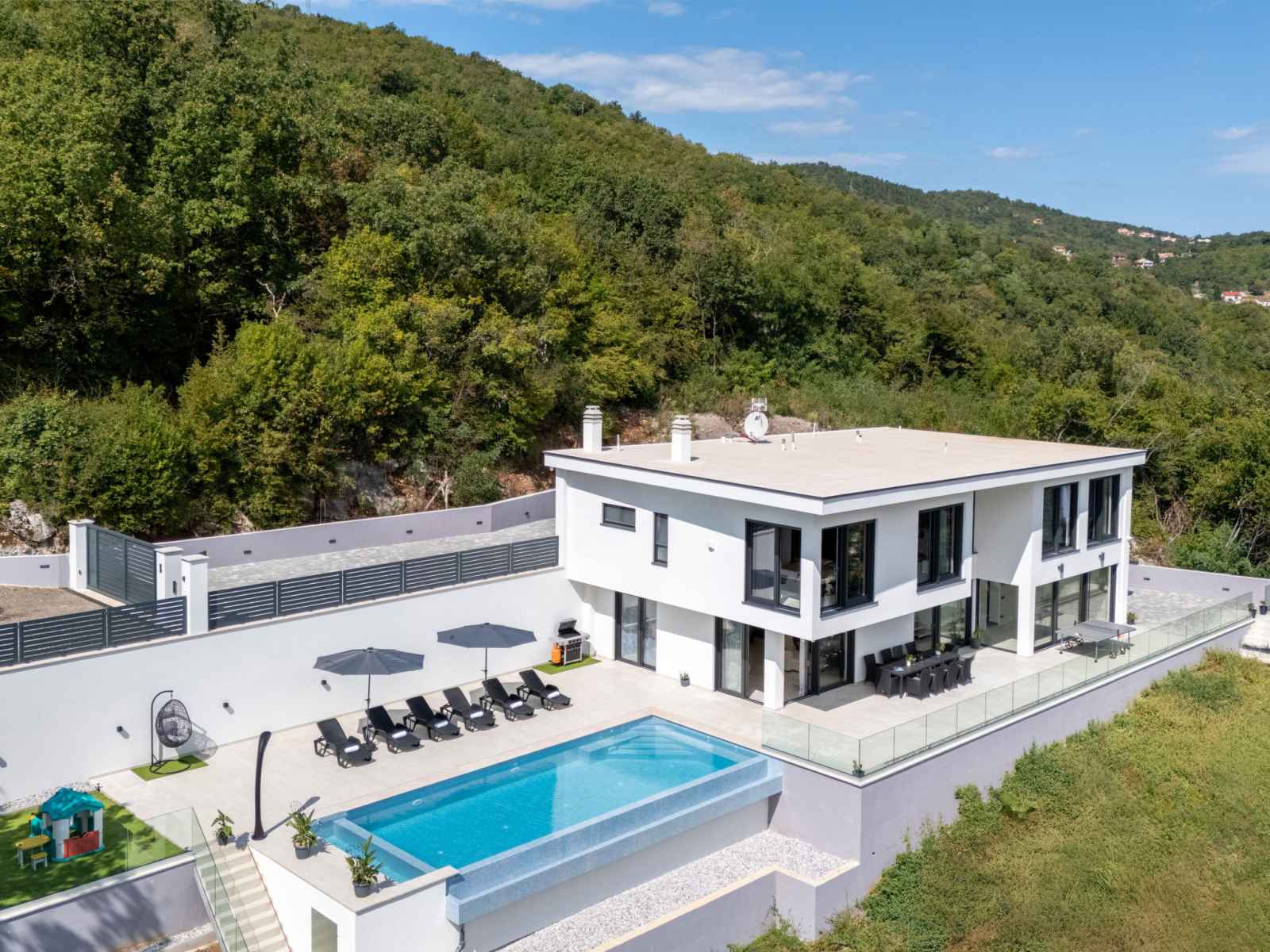 Matulji: villa moderne "gabi", de 2 étages, année de construction 2024. dans le hameau de mihotići, à 2.8 km du centre de matulji, à 3.8 km du centre d'opatija, situation ensoleillée, surélevée, à 3.9 km de la mer, à 3.9 km de la plage, dans une rue. a usage privé: terrain 1'720 m2, piscine rectangulaire (10 x 4 m, profondeur 150 cm,