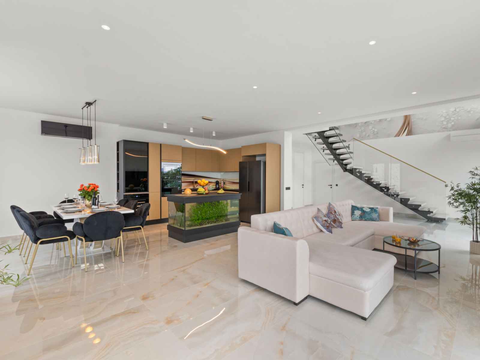 Villa 5 pièces 340 m2 sur 2 niveaux, situation sud. aménagement agréable et moderne: grand séjour/salle à manger 70 m2 avec baie vitrée avec 2 divans-lits (90 cm, longueur 200 cm), cheminée (uniquement à titre de décoration), tv (satellite) (écran plat). sortie sur la terrasse, sur la piscine. cuisine ouverte (four, lave-vaisselle, 4