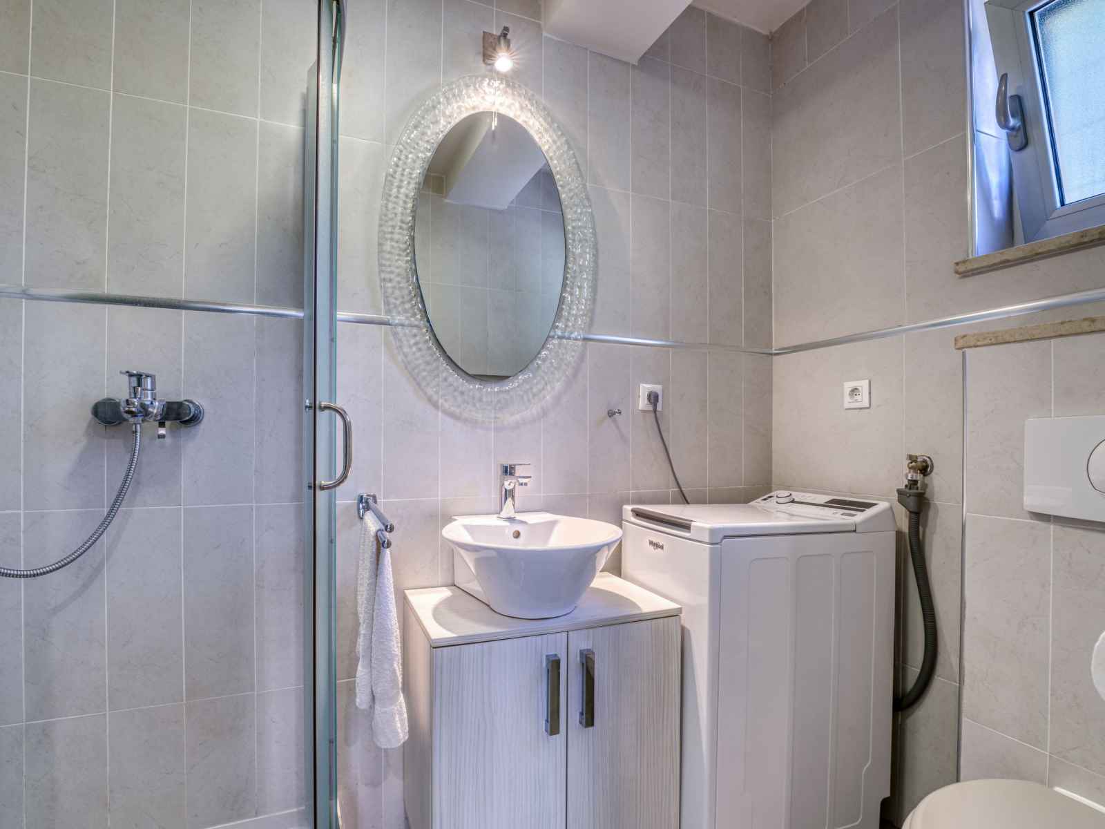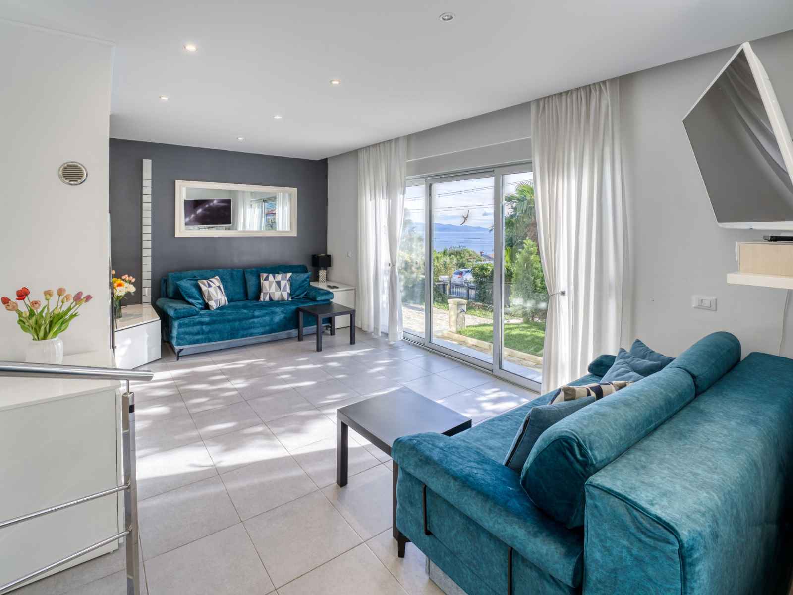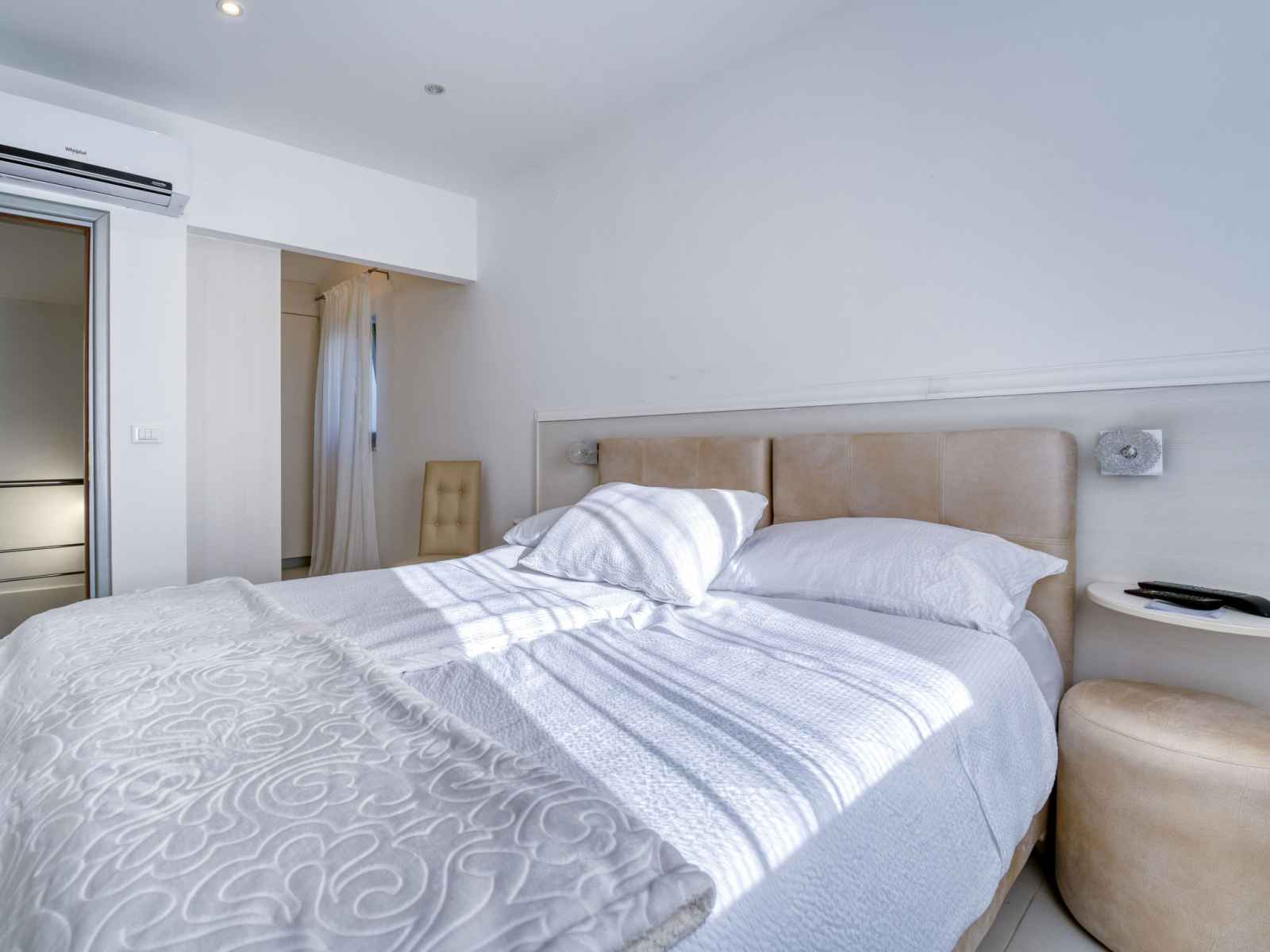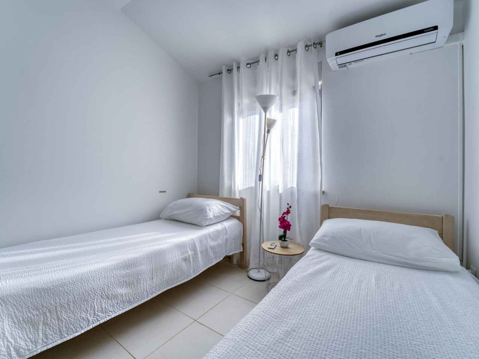 bouilloire électrique, micro-ondes, congélateur, cafetière électrique). Douche/WC. À l'étage supérieur: 1 chambre avec 1 grand-lit (160 cm, longueur 200 cm), TV (écran plat), air-conditionné. 1 chambre avec 2 lits (80 cm, longueur 200 cm), air-conditionné. Douche/bidet/WC. Pas de chauffage. Petit balcon 4 m2. Mobilier de balcon, barbecue, chaises longues. Partielle vue éloignée sur la mer. A disposition: Internet (Connexion WIFI, gratuit).