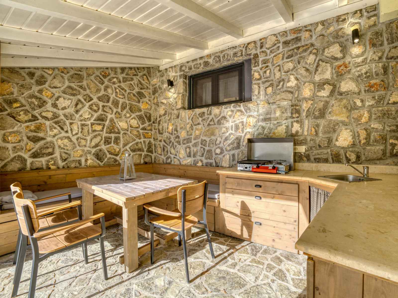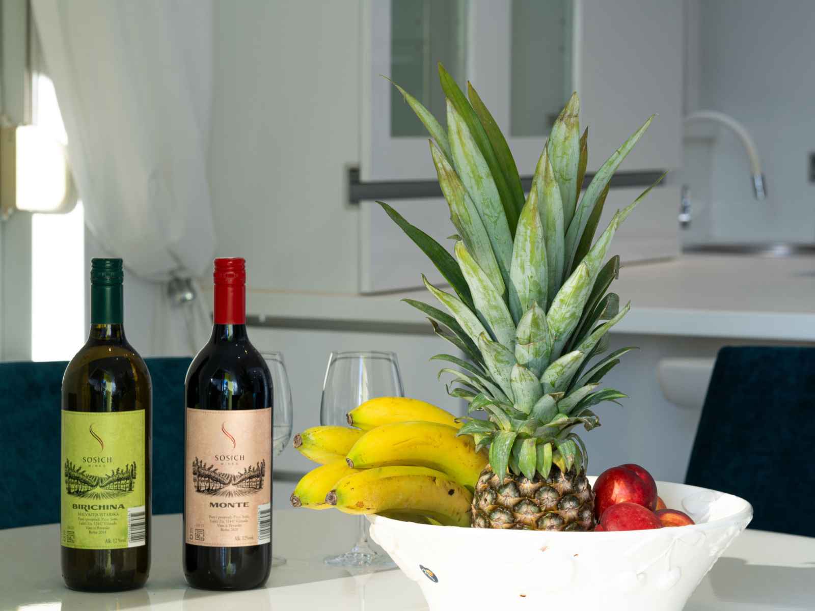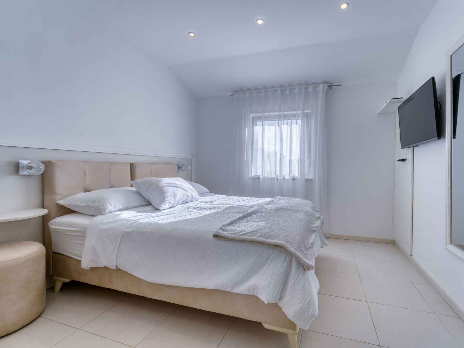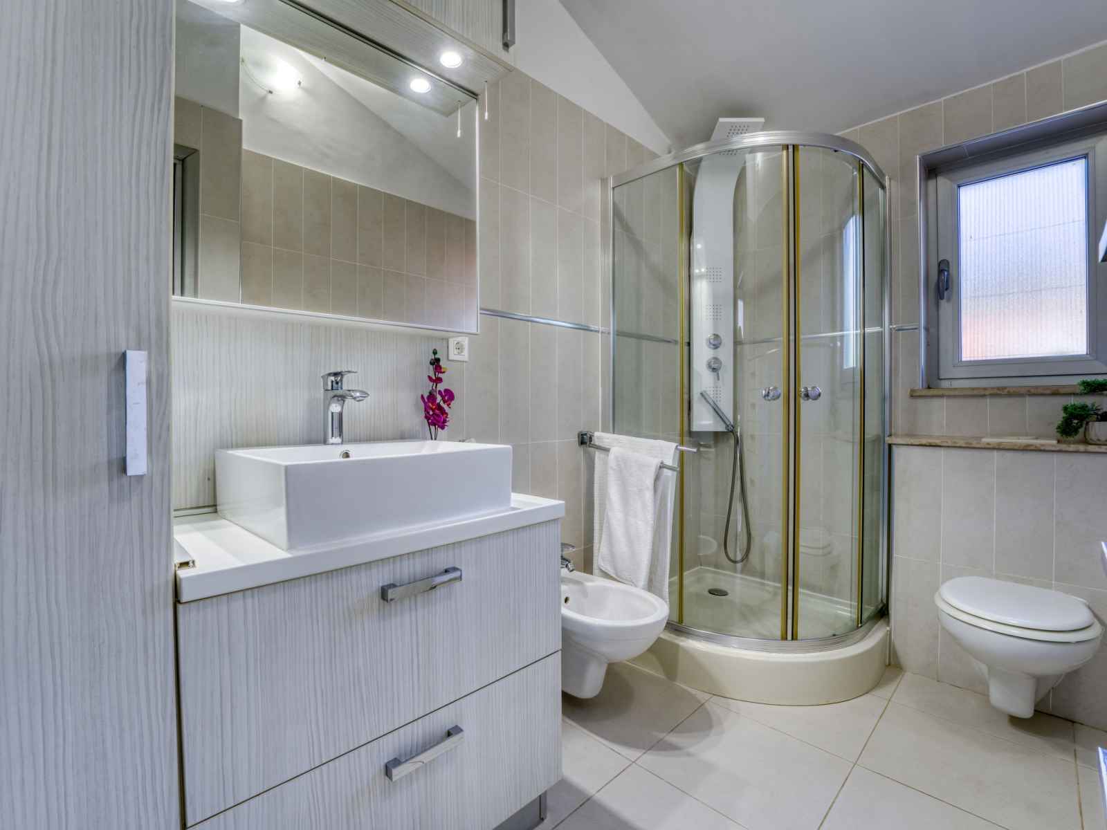 bouilloire électrique, micro-ondes, congélateur, cafetière électrique). Douche/WC. À l'étage supérieur: 1 chambre avec 1 grand-lit (160 cm, longueur 200 cm), TV (écran plat), air-conditionné. 1 chambre avec 2 lits (80 cm, longueur 200 cm), air-conditionné. Douche/bidet/WC. Pas de chauffage. Petit balcon 4 m2. Mobilier de balcon, barbecue, chaises longues. Partielle vue éloignée sur la mer. A disposition: Internet (Connexion WIFI, gratuit).