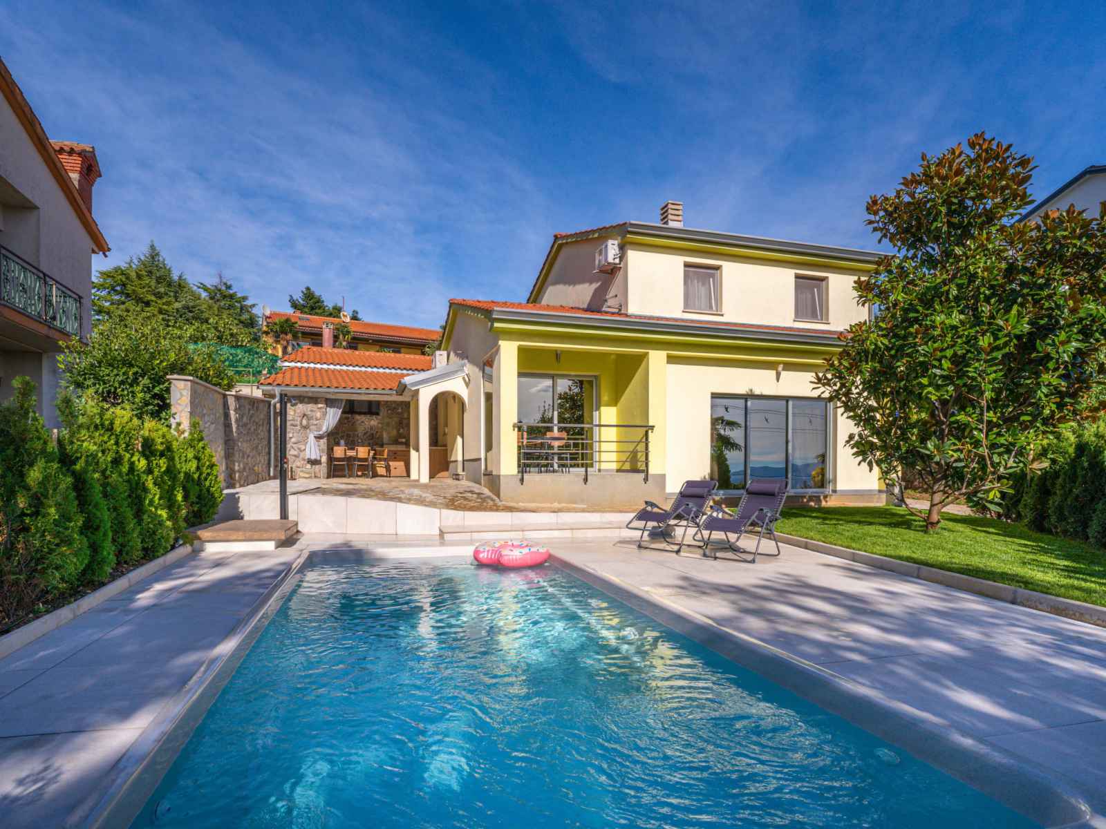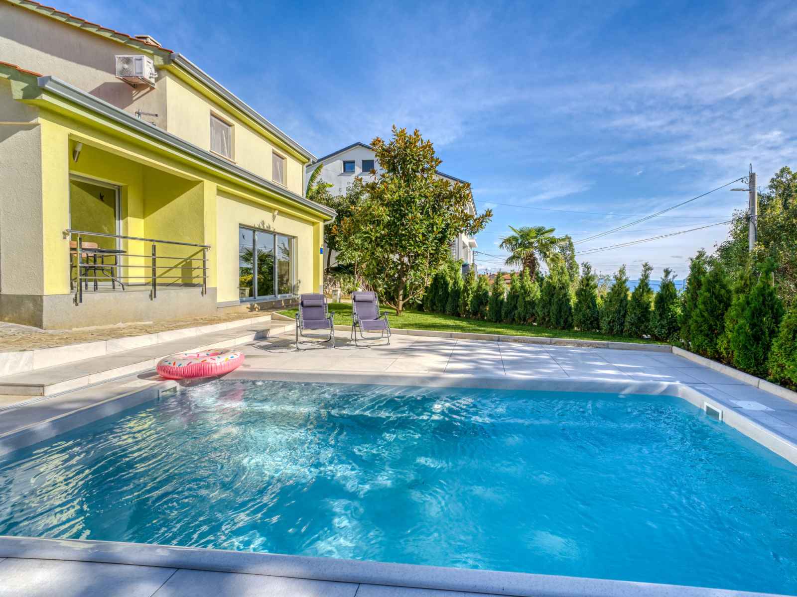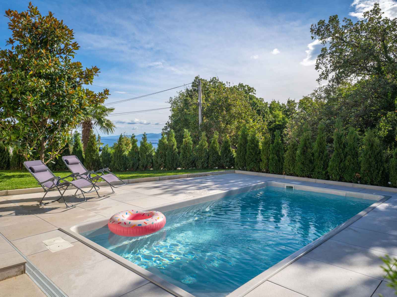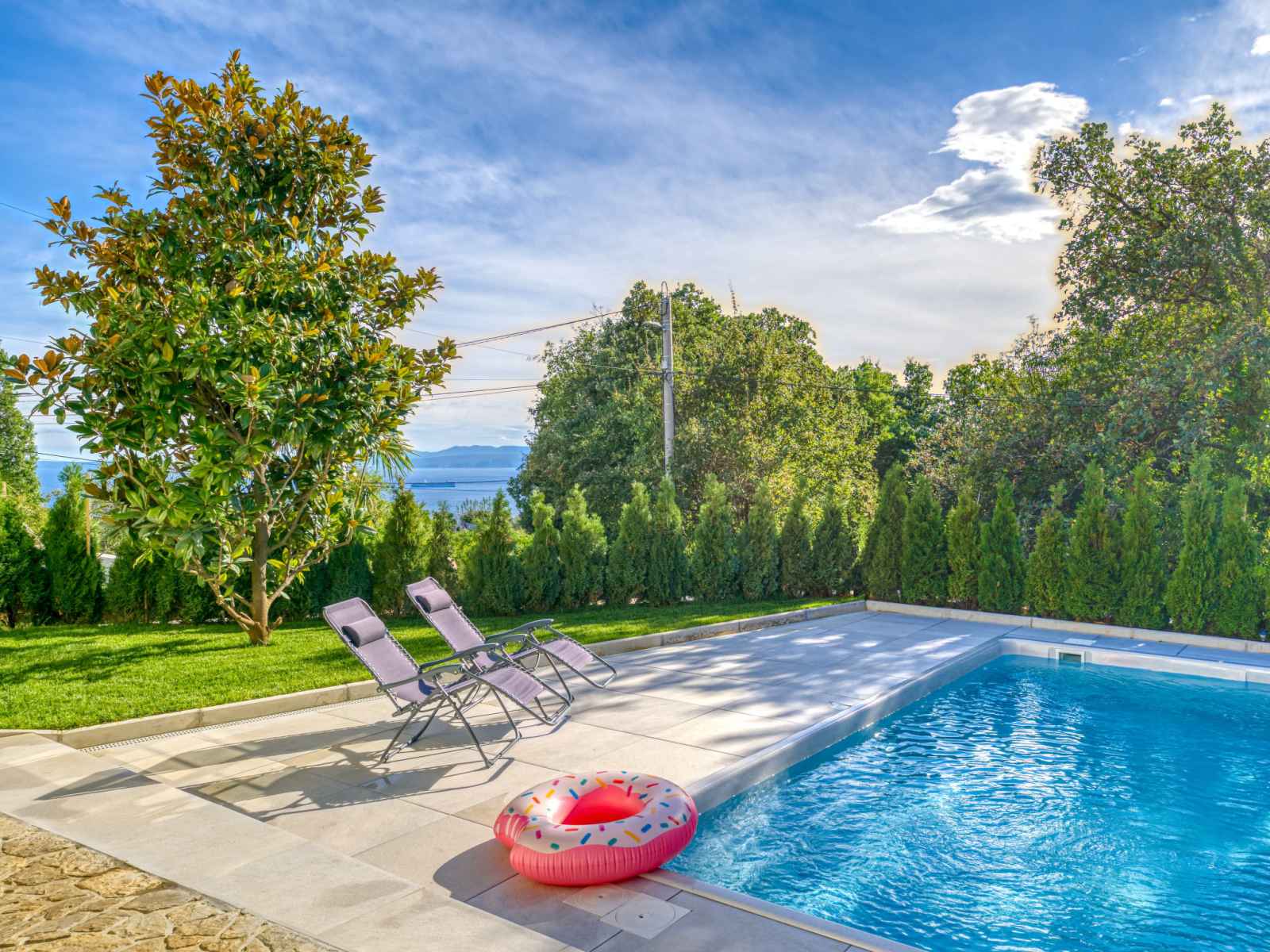 Matulji à 5 km de opatija: maison jumelée "mery", de 2 étages. À 1 km du centre de matulji, situation tranquille, ensoleillée, à 3.5 km de la mer, à 3.5 km de la plage, dans la verdure. a usage privé: terrain 350 m2 (clôturé) avec pelouse 30 m2 plantes, piscine rectangulaire (5 x 4 m, 20 m2, profondeur 140 cm, disponibilité