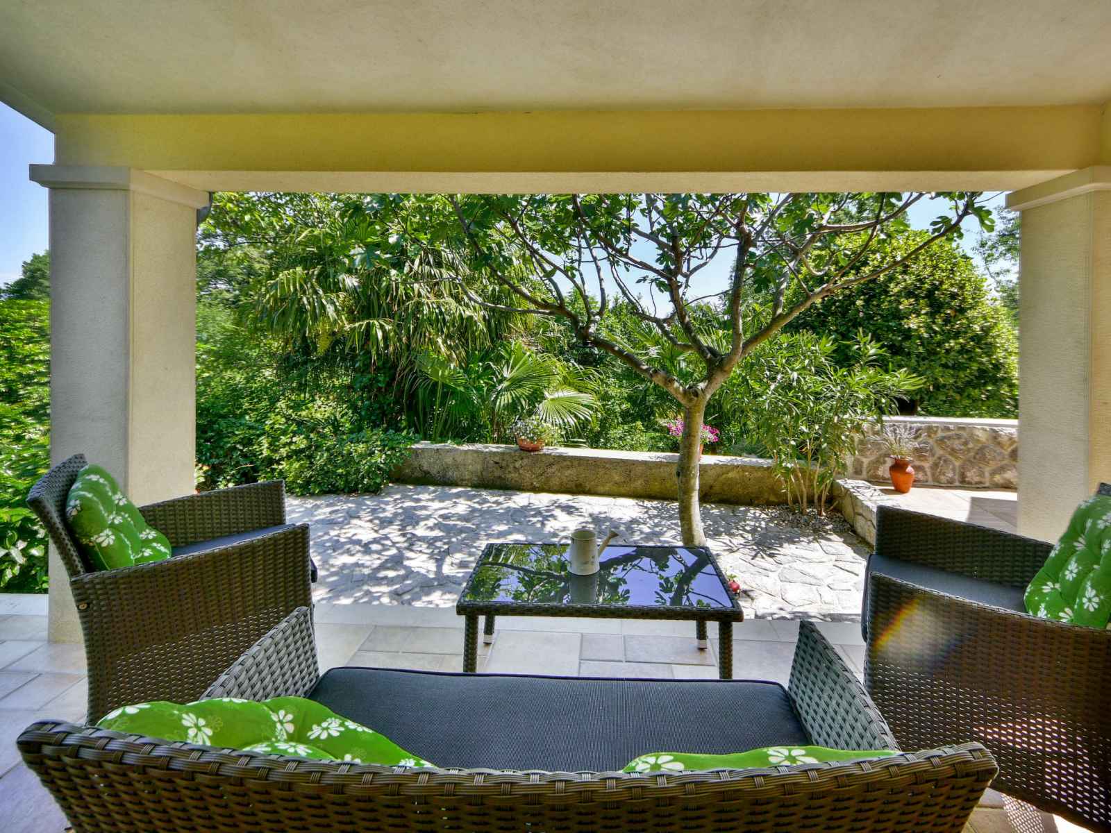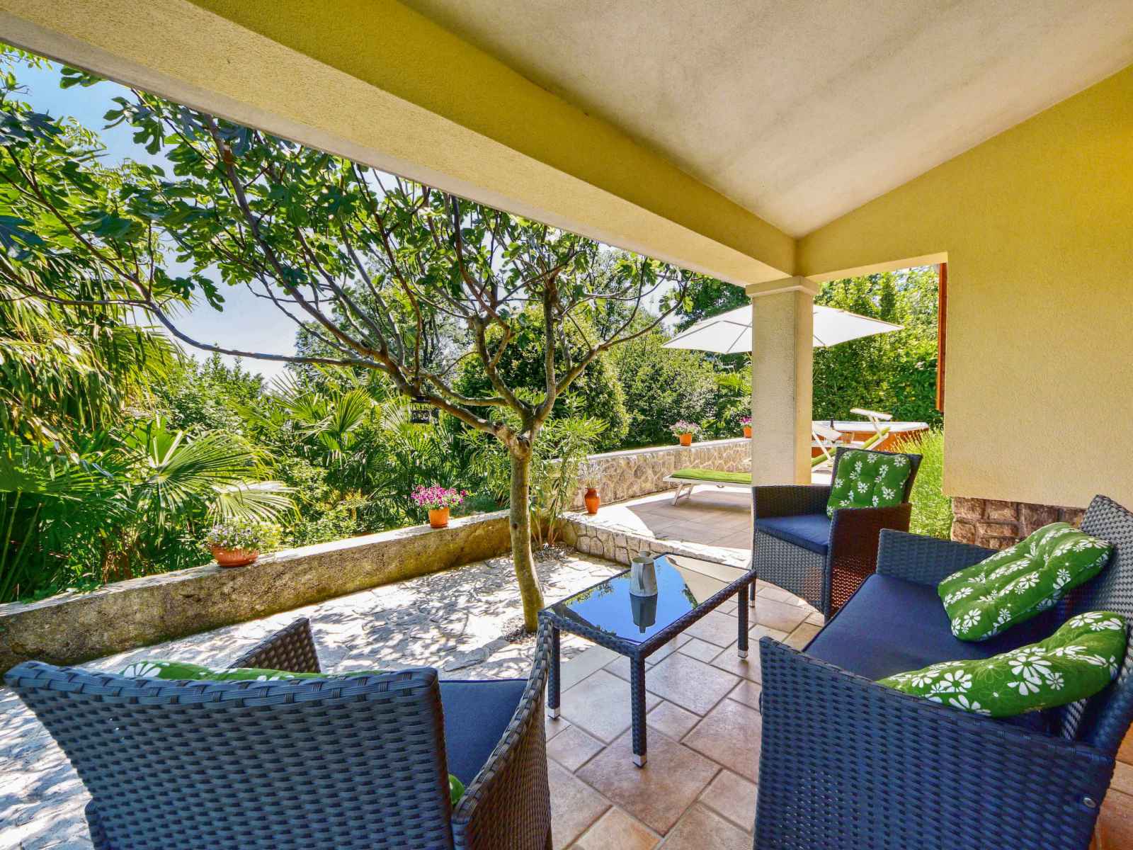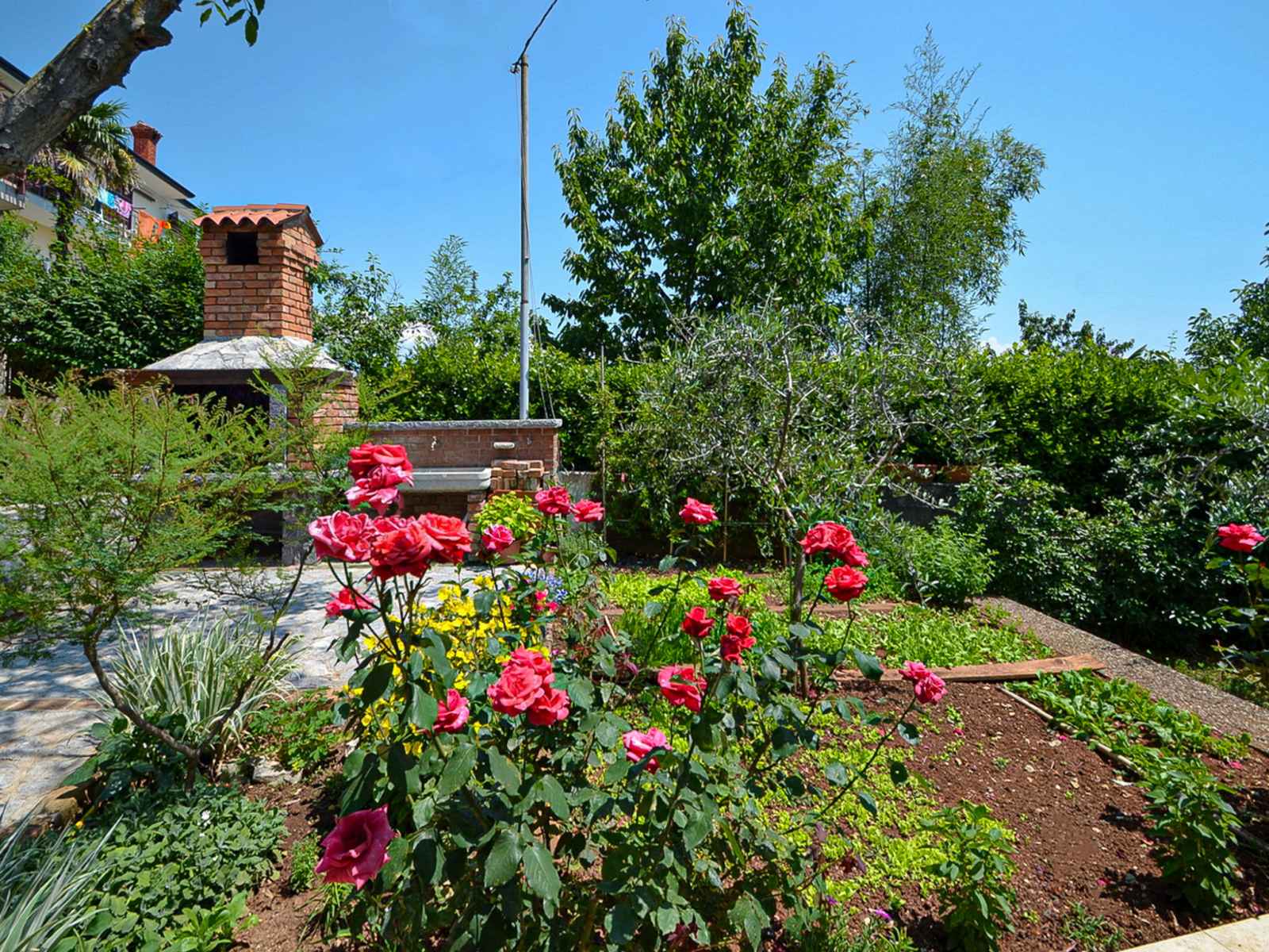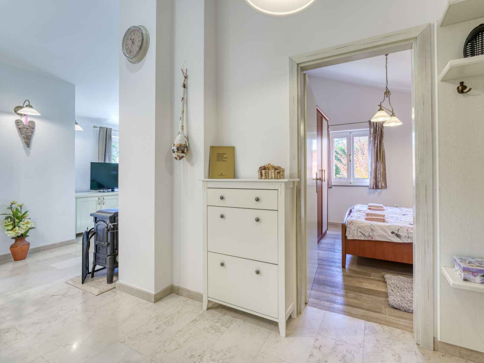 Chauffage (en sus). Terrasse 10 m2, couverte, pelouse 30 m2. Meubles de terrasse, chaises longues. A disposition: lave-linge. Internet (Connexion WIFI, gratuit). Taverne traditionnelle d'Istrie en commun.