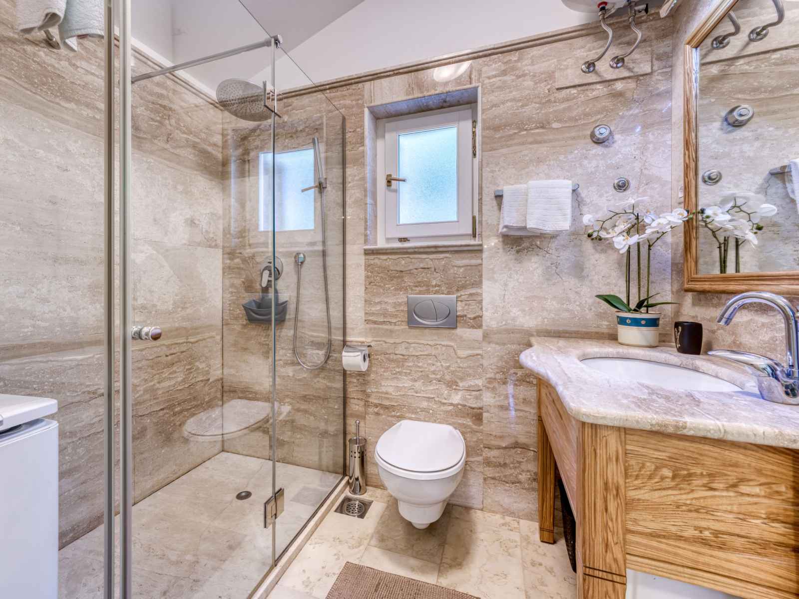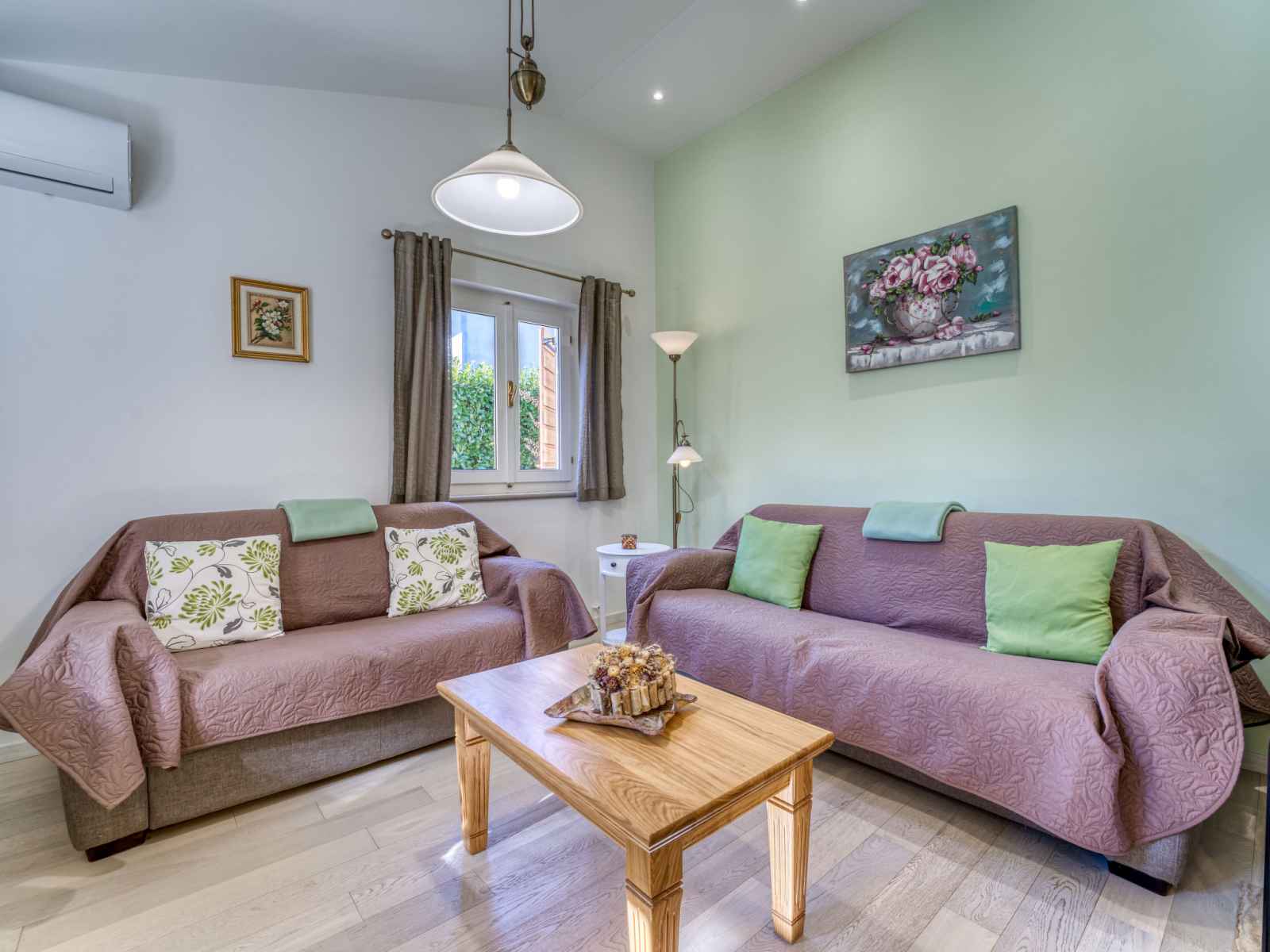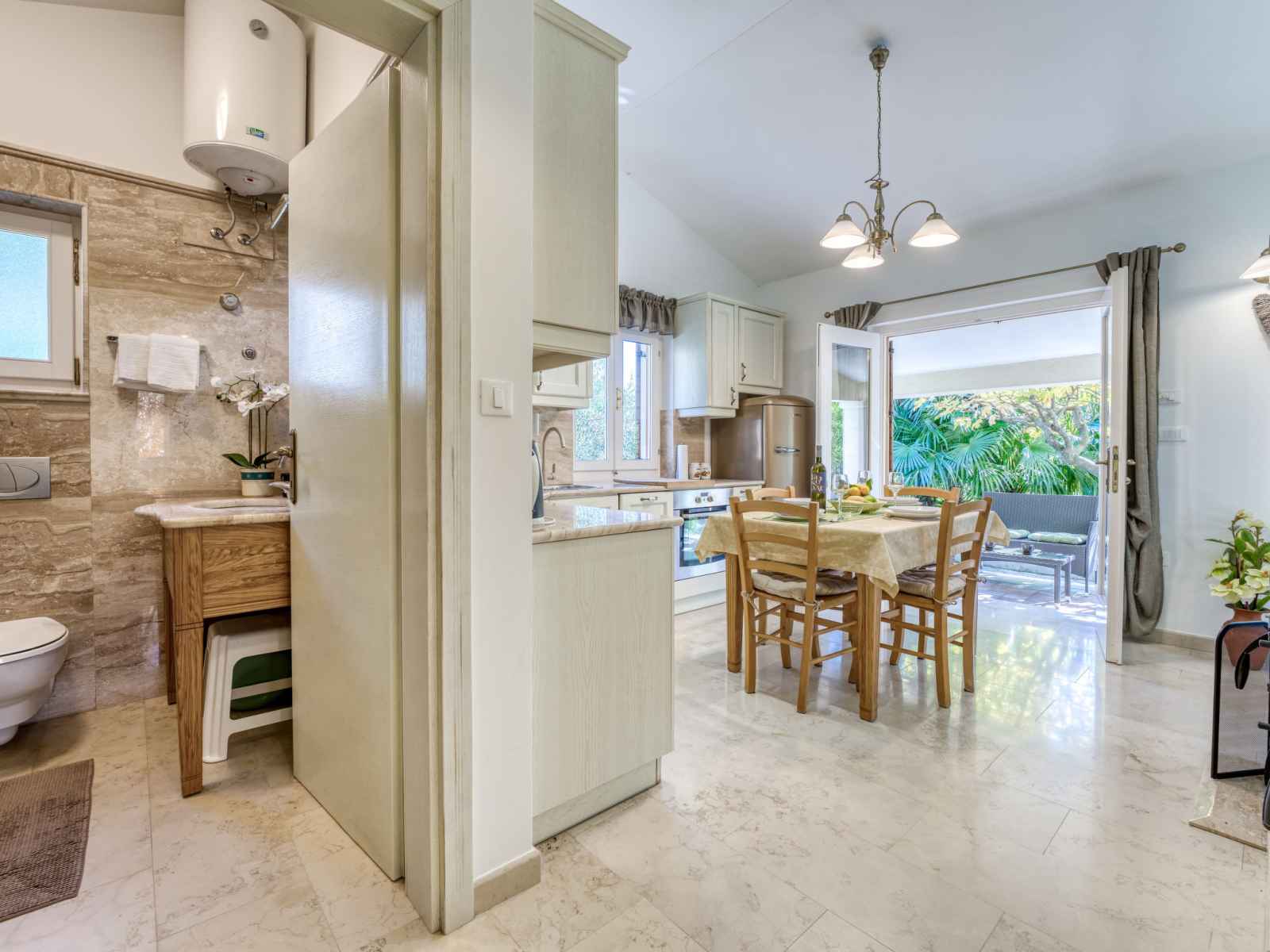 Chauffage (en sus). Terrasse 10 m2, couverte, pelouse 30 m2. Meubles de terrasse, chaises longues. A disposition: lave-linge. Internet (Connexion WIFI, gratuit). Taverne traditionnelle d'Istrie en commun.