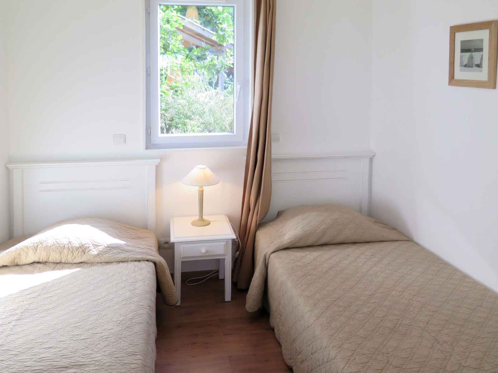 "les cottages du lac m3 privilège", chalet 3 pièces 43 m2. clair, aménagement plaisant: séjour/salle à manger avec table pour les repas et tv (satellite) (écran plat). sortie sur la terrasse. 1 chambre avec 1 grand-lit (140 cm, longueur 190 cm). 1 chambre avec 2 lits (80 cm, longueur 190 cm). cuisine ouverte (lave-vaisselle, 4 plaques