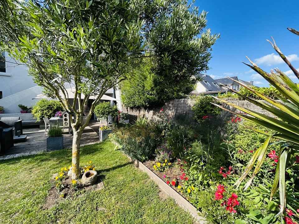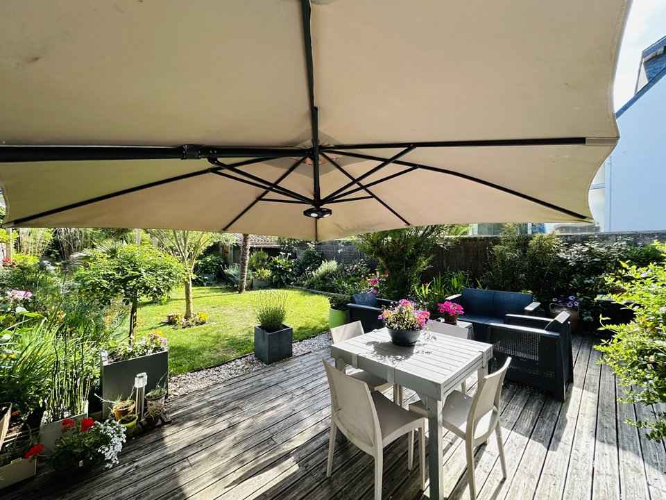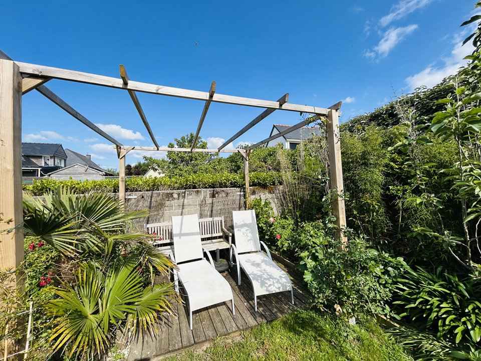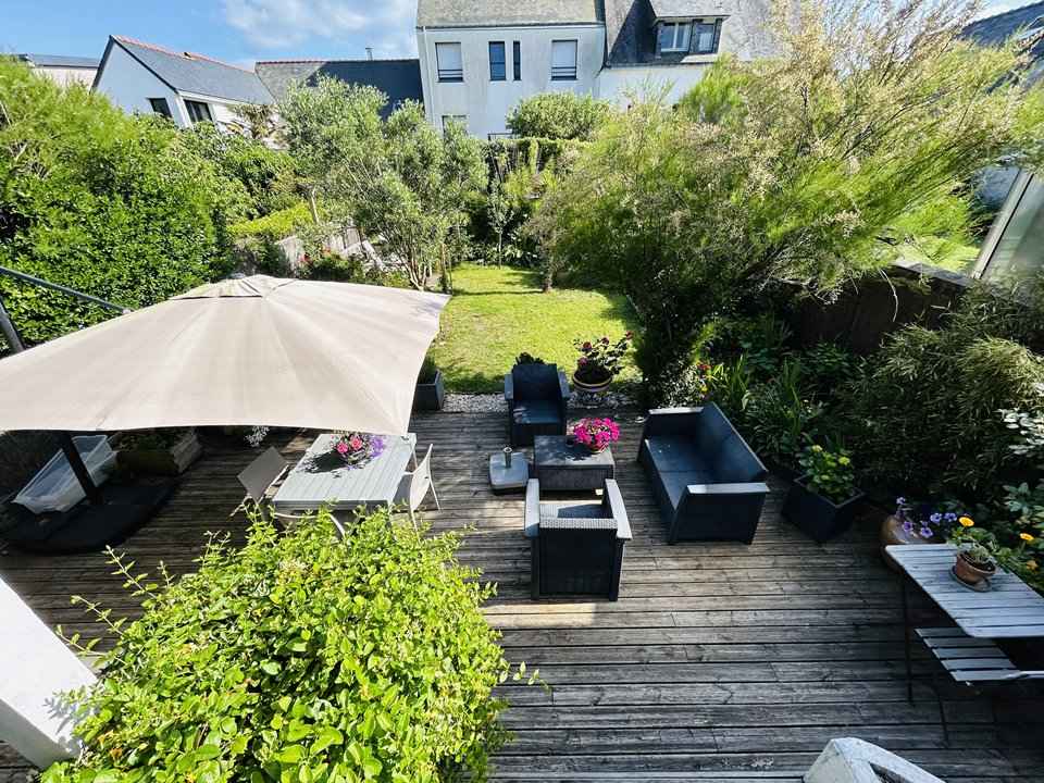 Beau jardin clôturé avec grande terrasse en bois équipée d'un salon de jardin, orientée Sud-Ouest.
