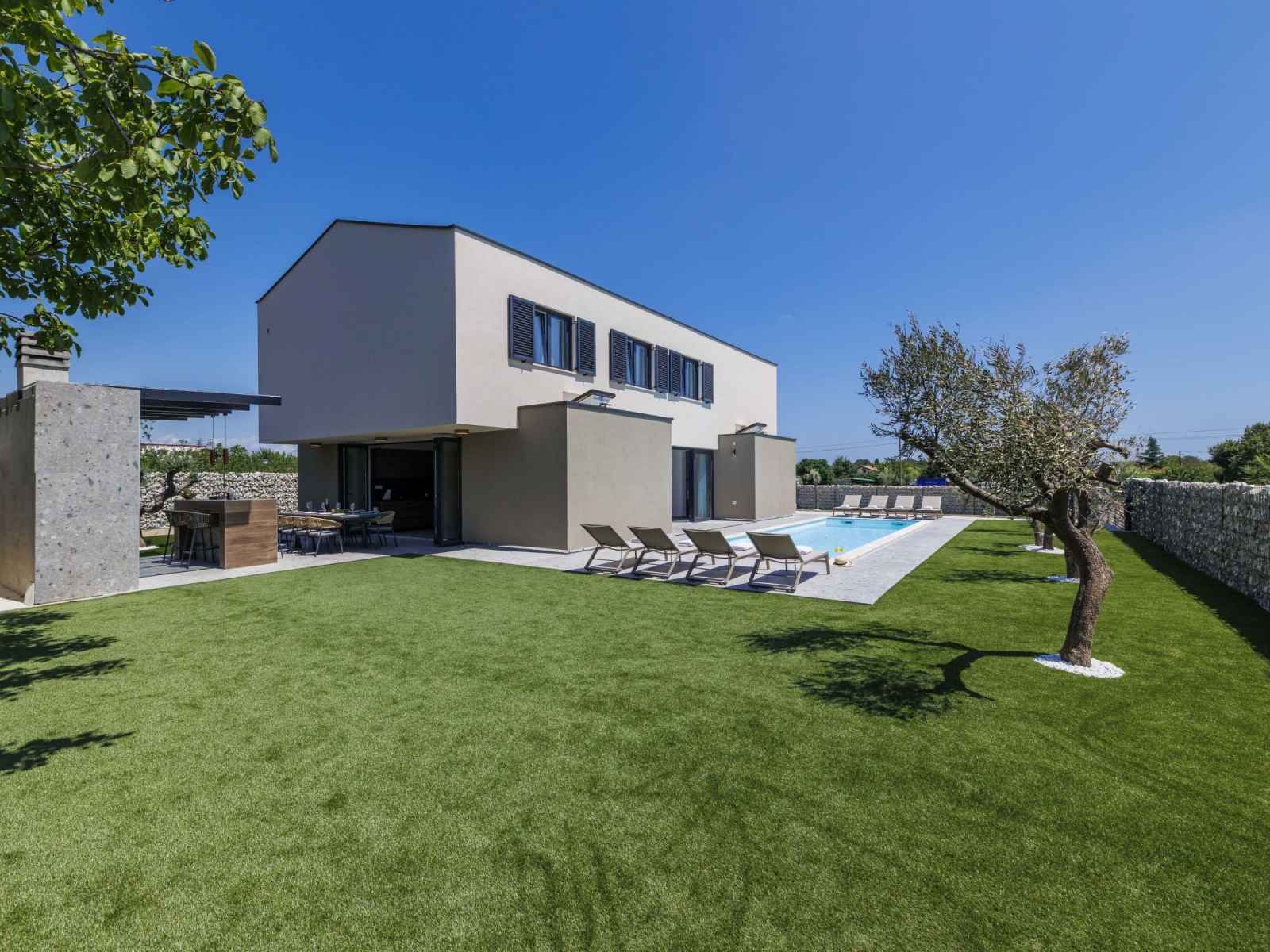 Villa "qube n' qube", de 2 étages. dans le hameau de loborika, à 6 km du centre de marčana, à 6 km du centre de pula, situation tranquille, ensoleillée, à 8 km de la mer. a usage privé: terrain 860 m2 (clôturé), jardin avec plantes et fleurs, piscine rectangulaire, chauffée (10 x 3 m, profondeur 140 cm, disponibilité saisonnière:
