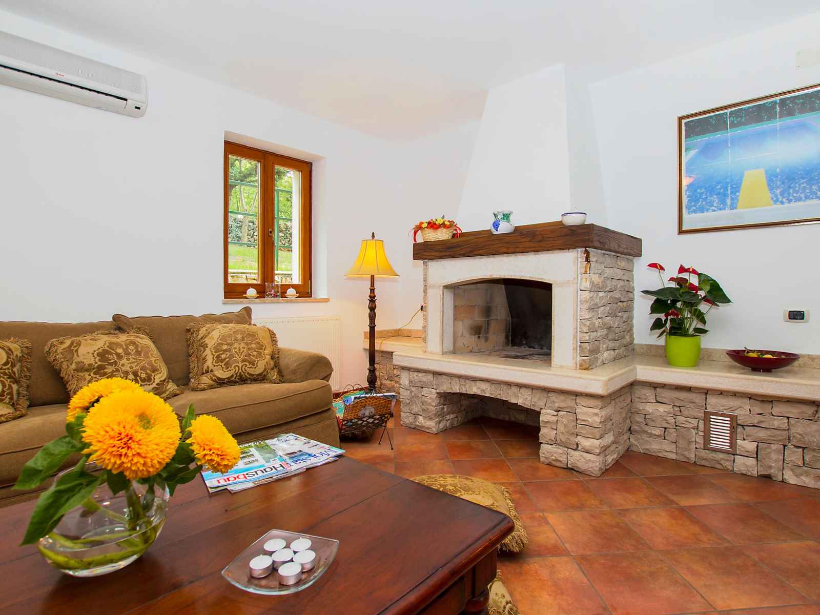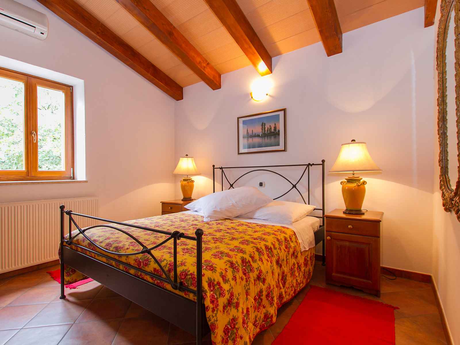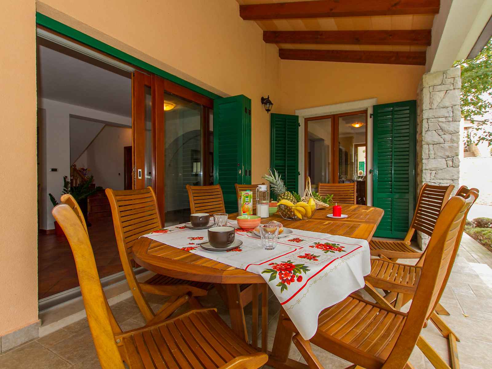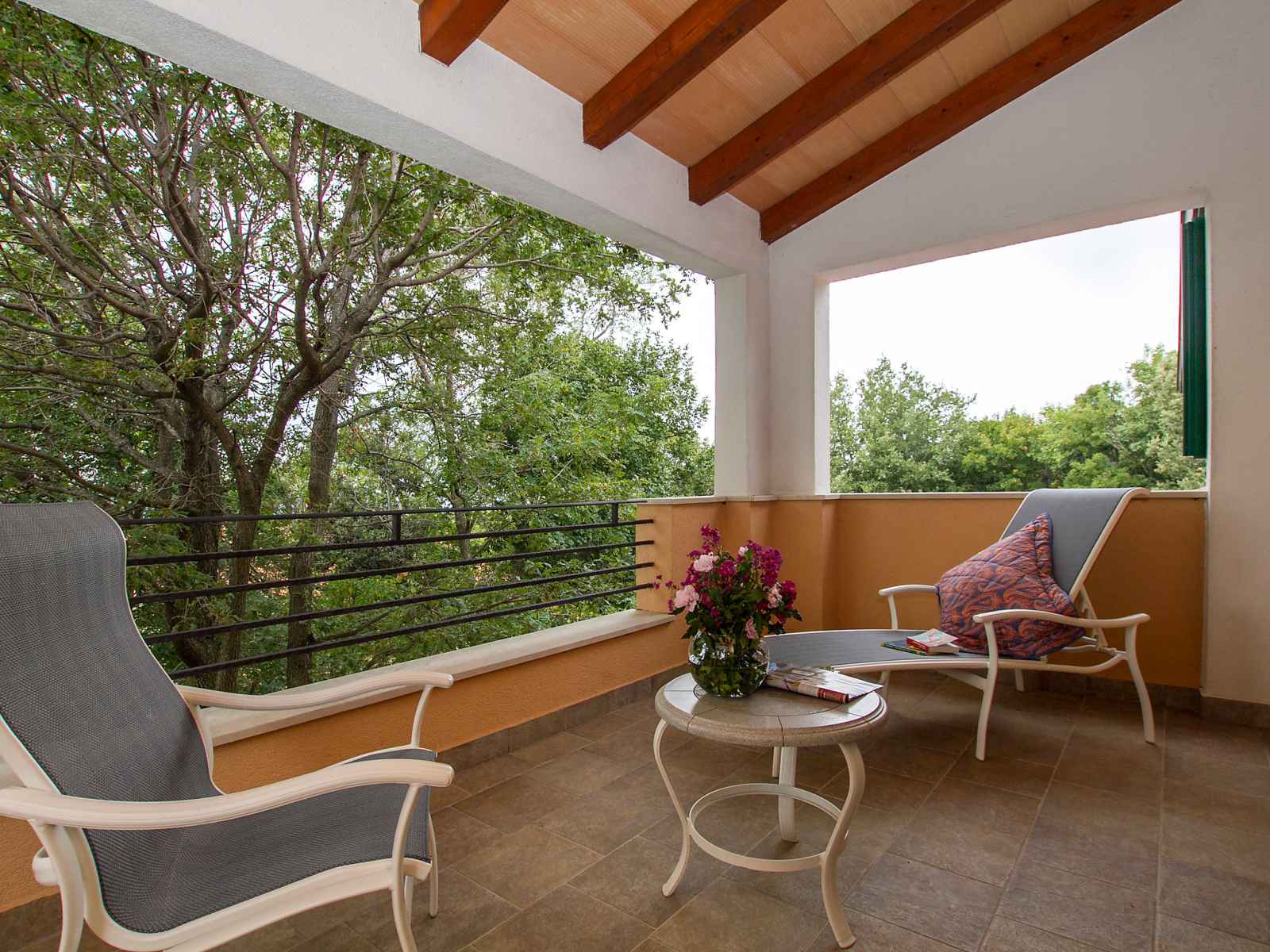 saisonnière: 04.mai. - 14.sep.) avec marches intérieures. douche extérieure, pool house, meubles de jardin, barbecue. a usage privé: jardin 600 m2 avec fleurs et arbres. infrastructures de la maison: chauffage central, air-conditionné. accès en voiture (100 m chemin non goudronné, rampe). place de parking près de la maison sur le terrain. magasins 4 km, restaurant 4 km, arrêt de bus 14.8 km, plage de graviers 4 km, plage de rochers 4 km. en commun : 2 piscines (13 x 4m, 8,5 x 4,5m).