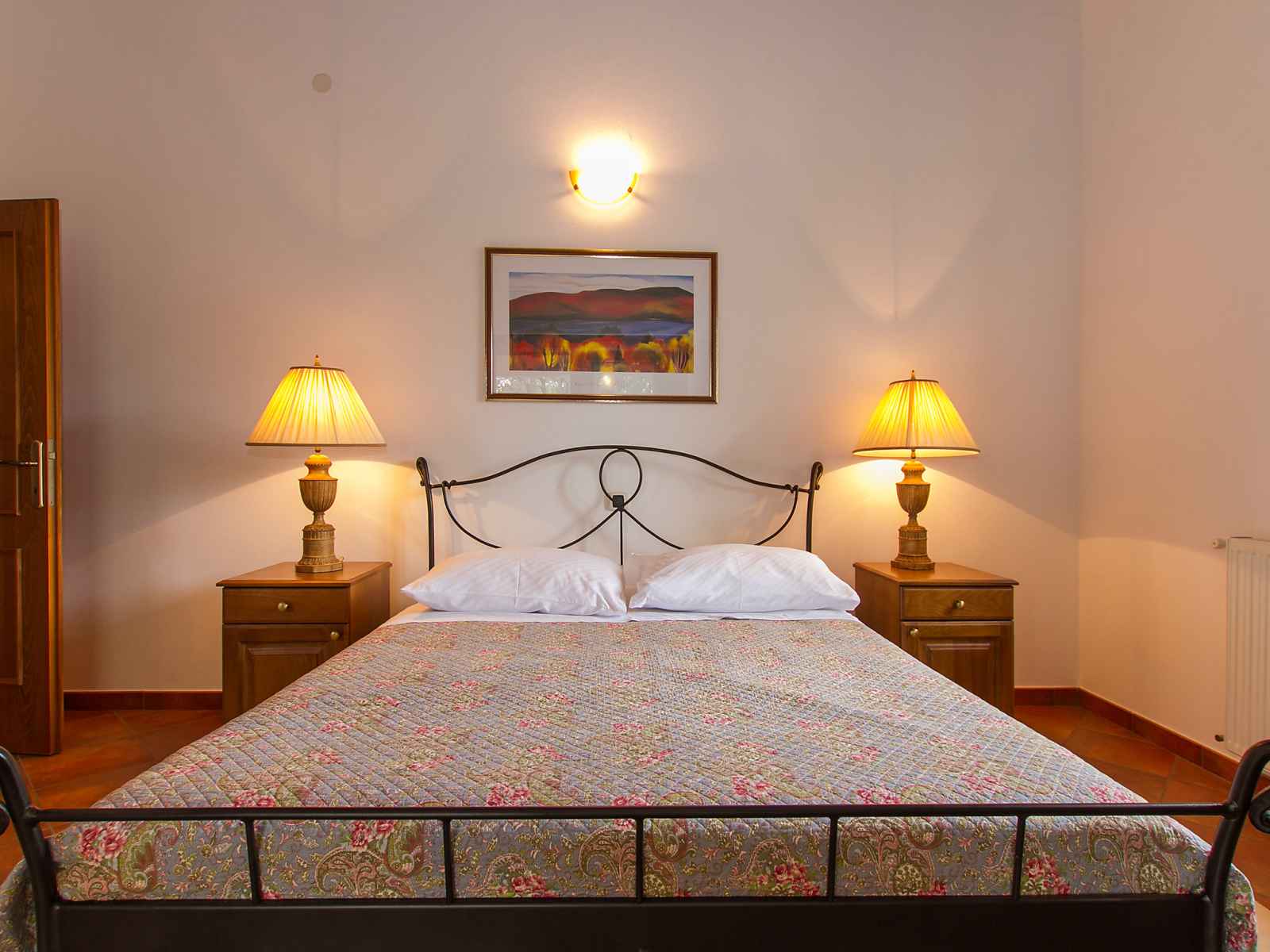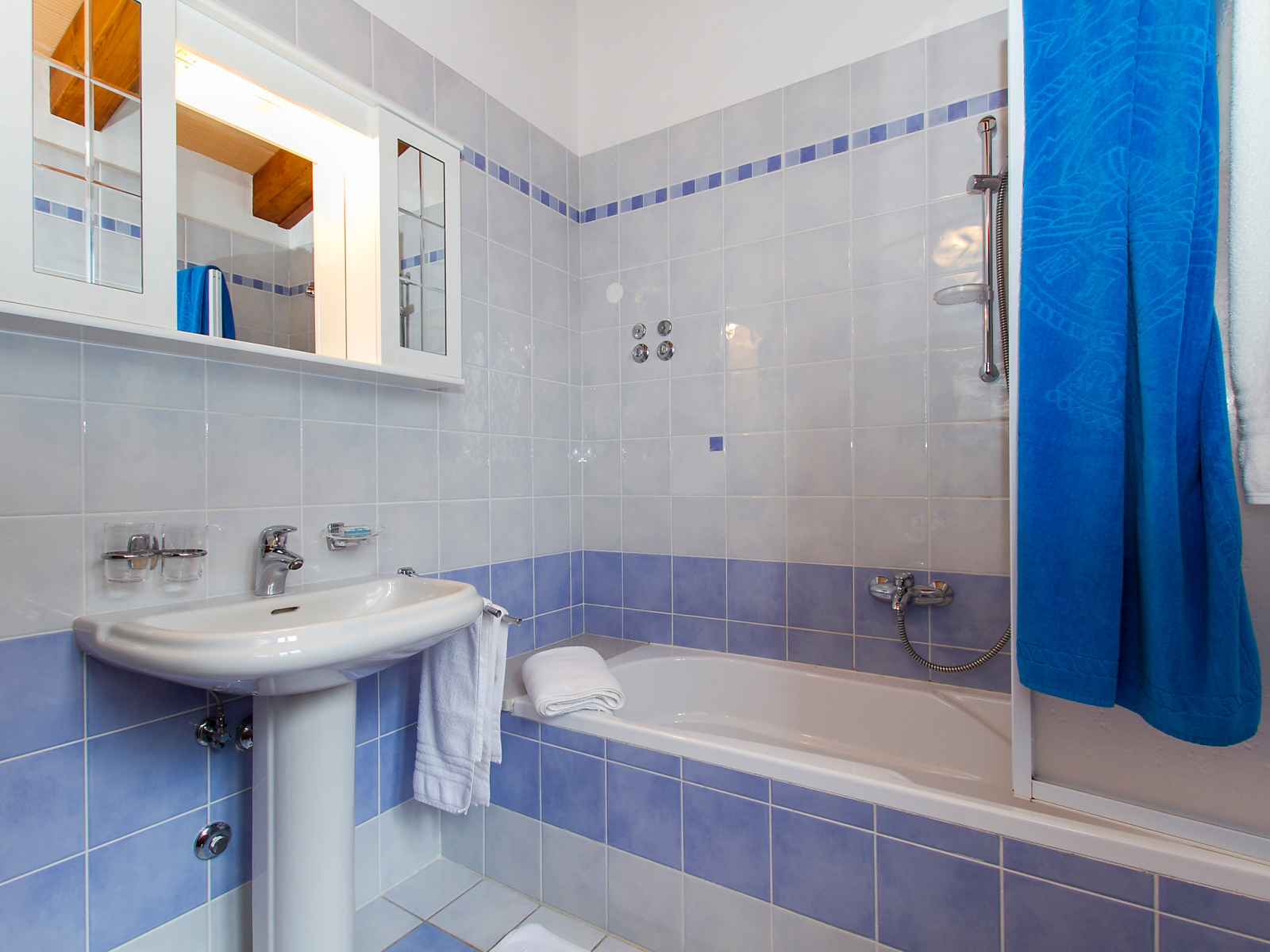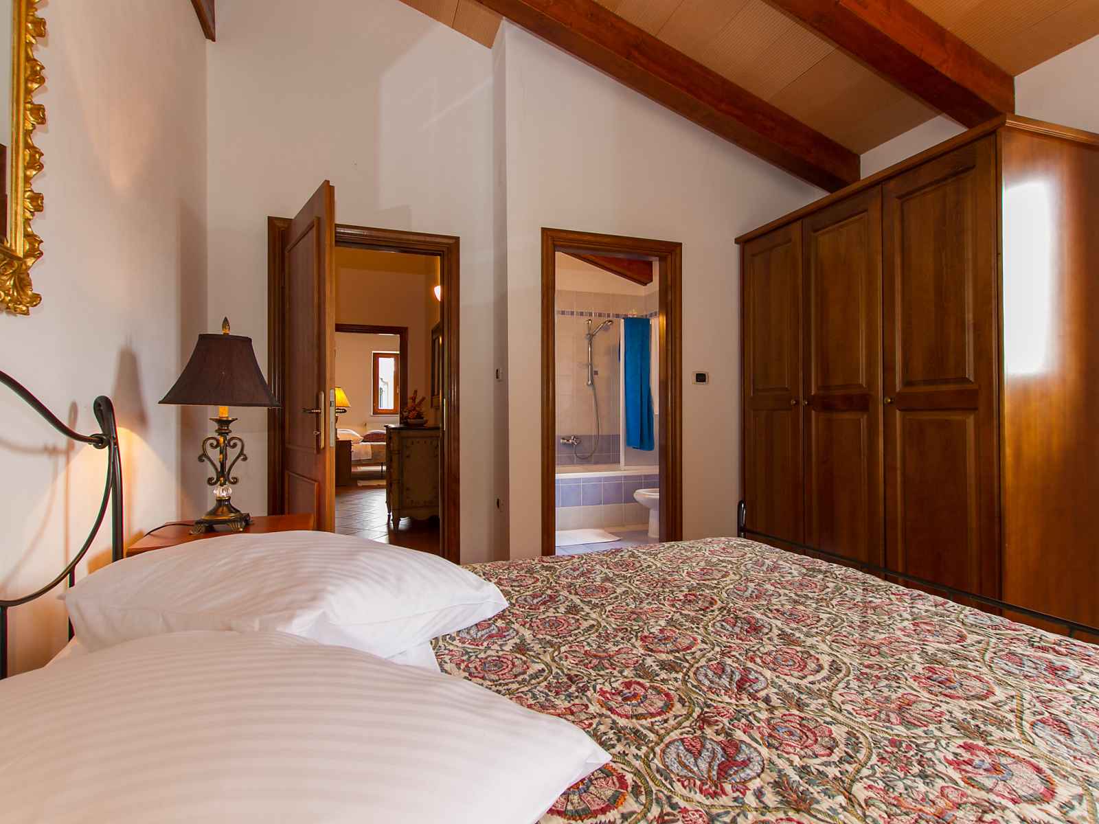 lave-vaisselle, micro-ondes, congélateur). Bain/douche/WC. À l'étage supérieur: 1 chambre avec 1 grand-lit (160 cm, longueur 190 cm), douche/bidet/WC et air-conditionné. 2 chambres, chaque chambre avec: 1 grand-lit (160 cm, longueur 190 cm), bain/bidet/WC et air-conditionné. Sortie sur la terrasse. 1 chambre avec 2 lits (80 cm, longueur 190 cm), douche/bidet/WC et air-conditionné. Sortie sur la terrasse. Grande terrasse 40 m2, couverte, 3 terrasses. Meubles de terrasse, barbecue (portable). Vue éloignée sur la mer. A disposition: lave-linge, lit bébé. Internet (Connexion WIFI, gratuit).