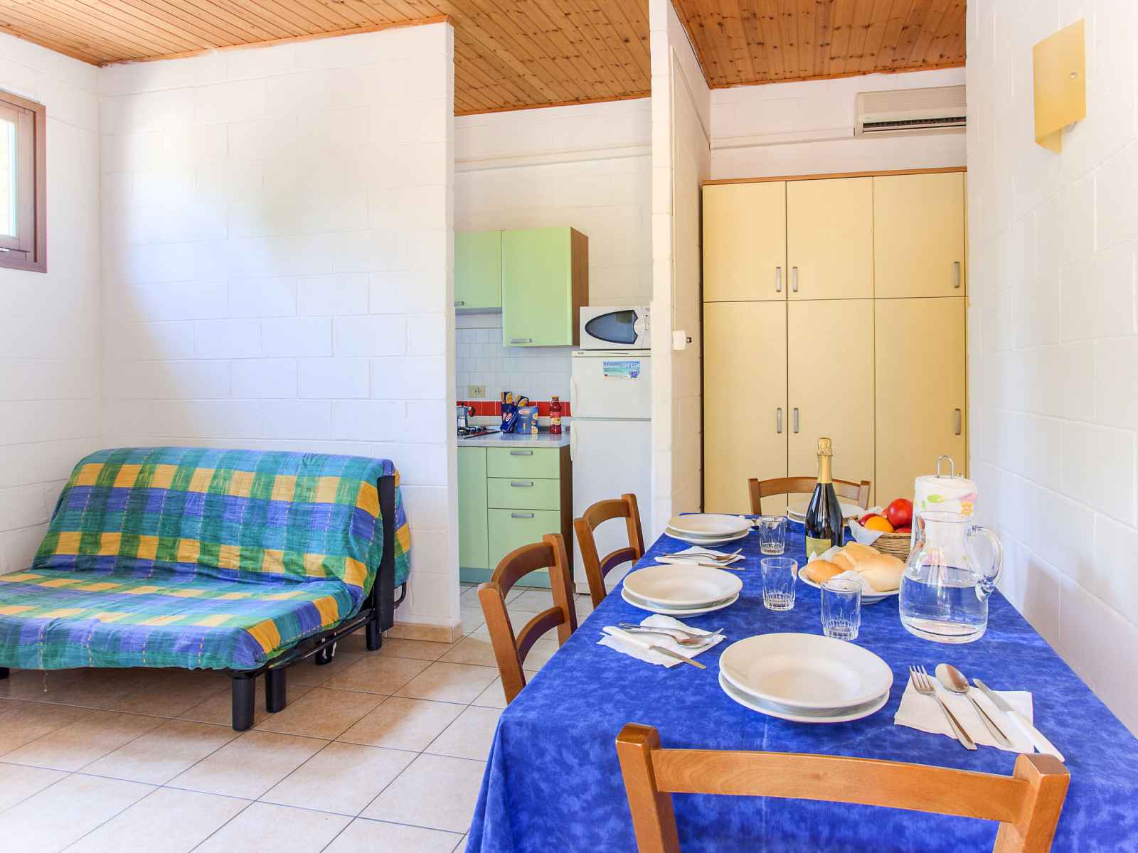 Bungalow 2 pièces 36 m2. aménagement fonctionnel: séjour/chambre à coucher avec 1 divan-lit double, 1 lit pliant, table pour les repas, coin-cuisine et tv (satellite). sortie sur la terrasse. 1 chambre double. coin cuisine (4 feux, micro-ondes, congélateur). douche/wc. air-conditionné, chauffage à air chaud. terrasse 24 m2, couverte.