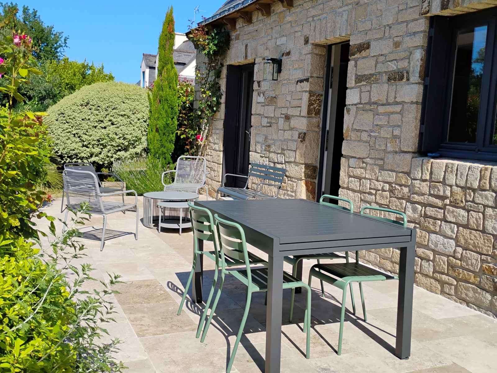- Jardin non clos avec terrasse équipée d'un salon de jardin, de transats et barbecue.