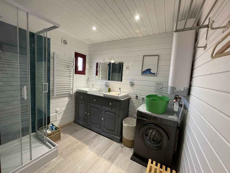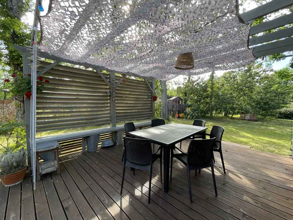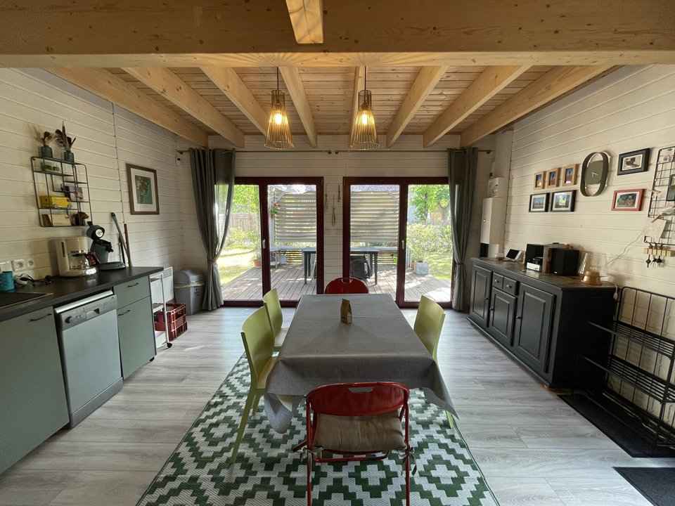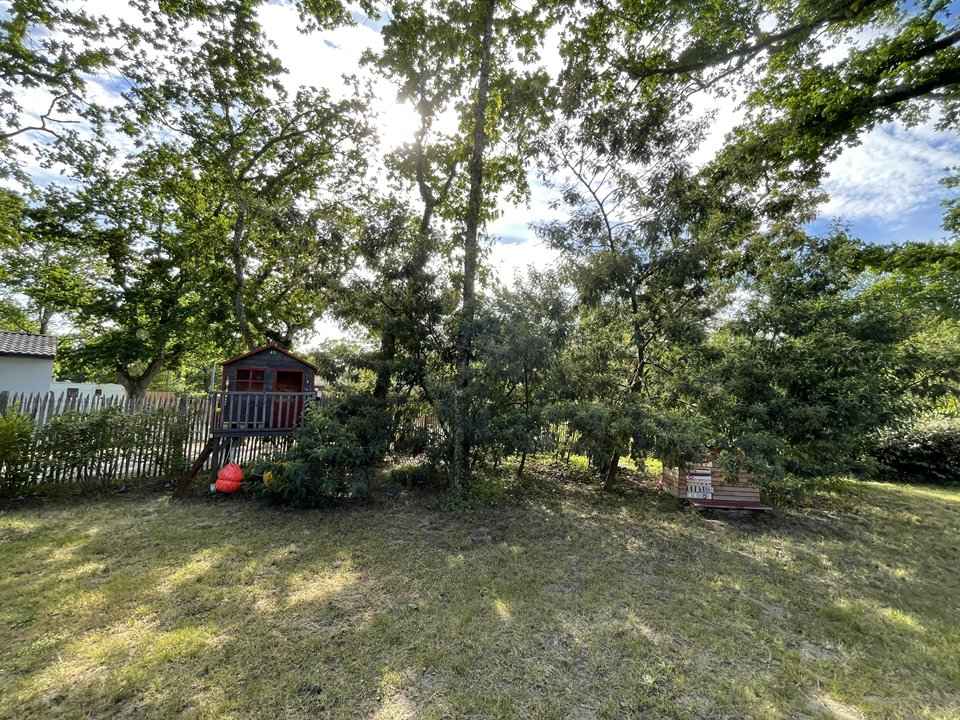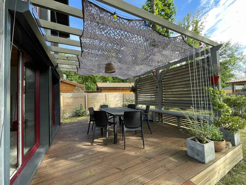 90 cm et rangements. Son extérieur clôturé est équipé d'une terrasse en bois avec salon de jardin et toile d'ombrage, barbecue, cabane en bois pour enfant, transats, 2 vélos adultes et 1 vélo enfant, etc... Caution à régler sur place. Chèques vacances acceptées.