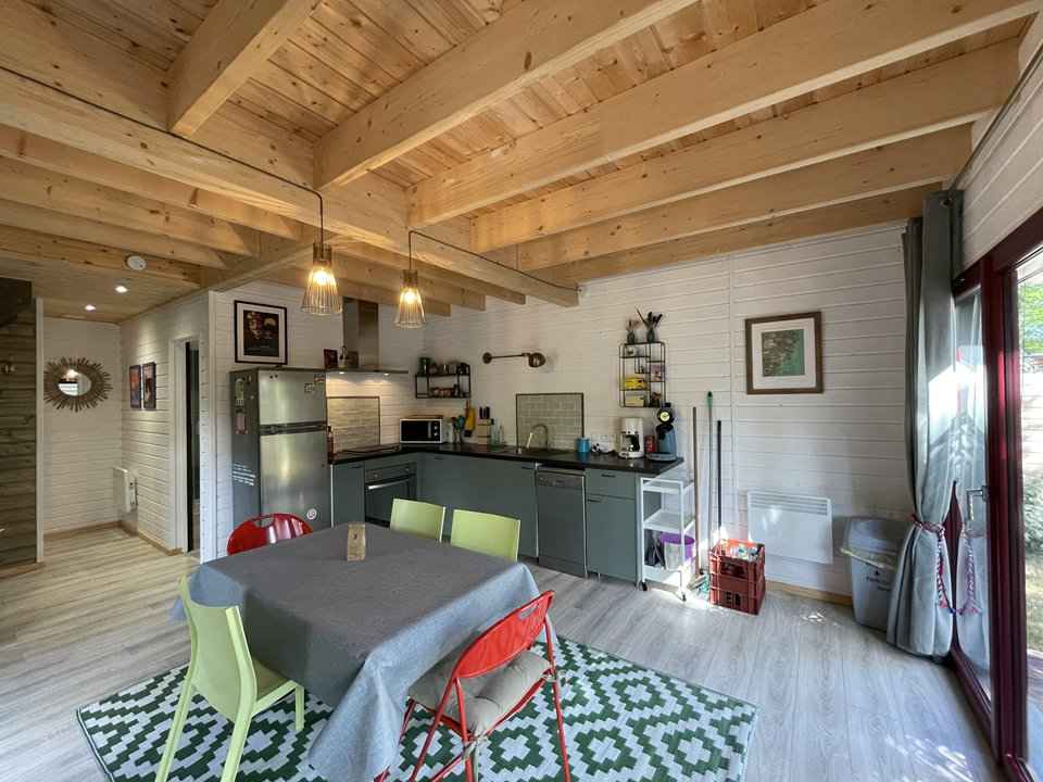 Venez vous ressourcer à soulac/mer dans cette maison en bois pouvant accueillir 4 personnes. elle se compose au rez-de-chaussée d'une cuisine équipée ouverte sur un espace repas, une salle d'eau, un wc indépendant. au 1er étage, un espace télévision, une chambre avec lit double en 140 cm et rangements, une chambre avec deux lits simples en