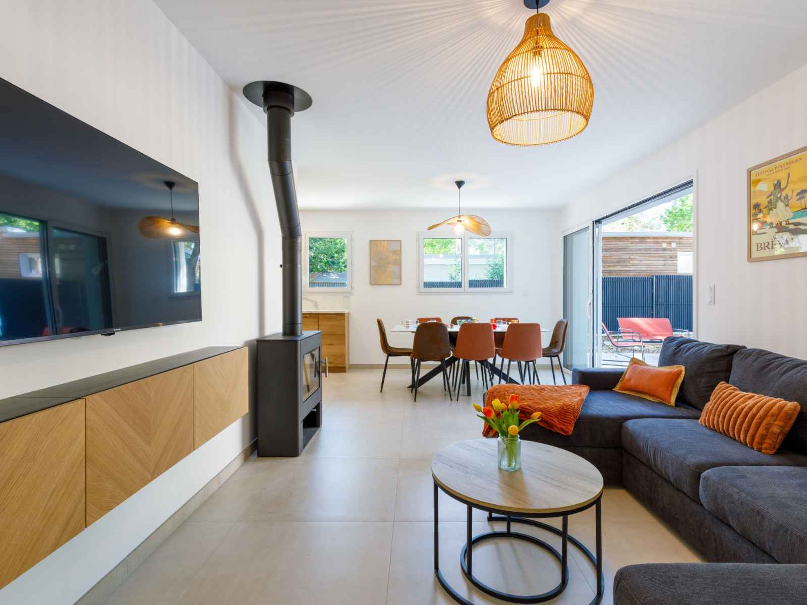 "ohana", maison 4 pièces 100 m2 sur 2 niveaux, situation sud-ouest. séjour/salle à manger avec poêle suédois (uniquement à titre de décoration), table pour les repas et tv (écran plat). 1 chambre avec dressing avec 1 grand-lit (1 x 160 cm, longueur 200 cm), douche. cuisine ouverte (four, lave-vaisselle, 1 plaques à induction, 3 feux,