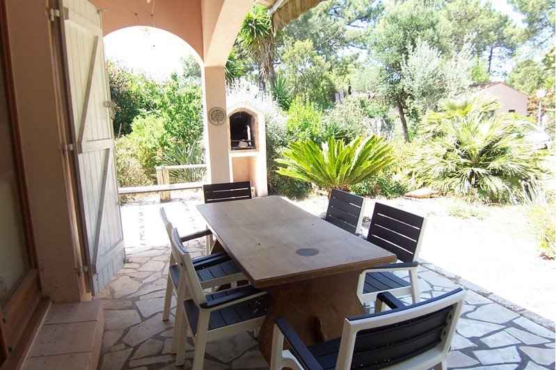 Terrasse ombragée côté cuisine : salon de jardin.