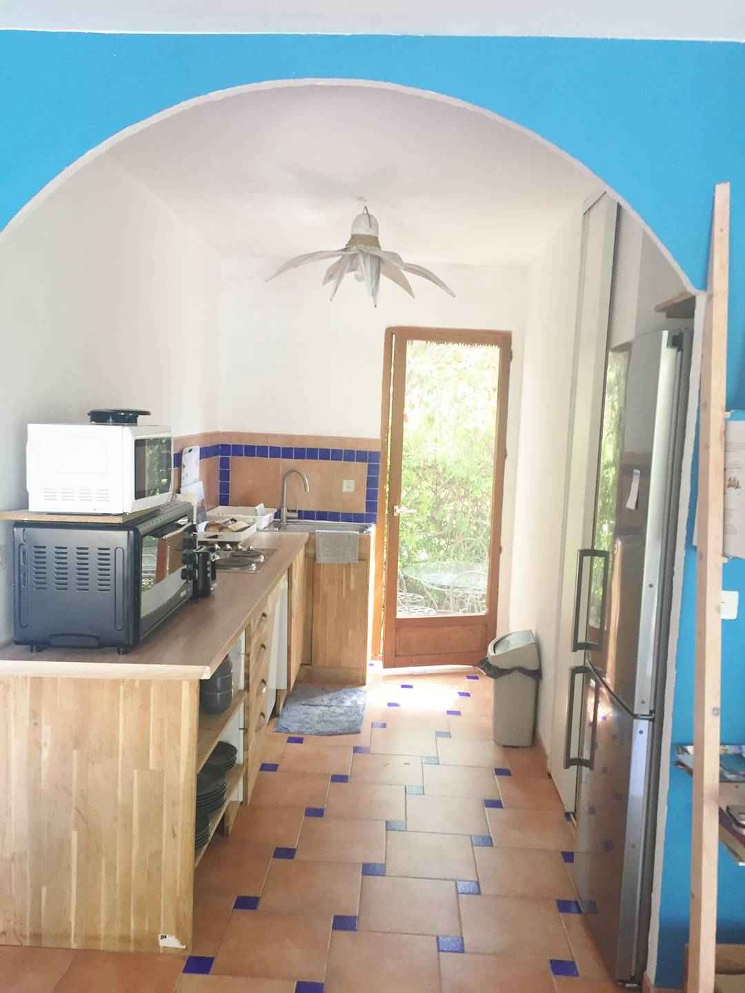 terrasse ombragée côté cuisine : salon de jardin.)