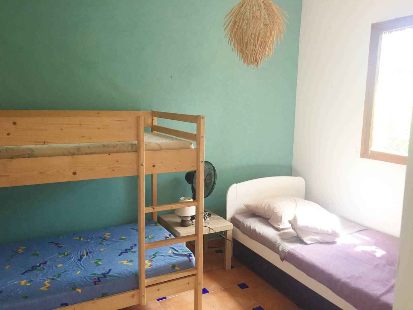 - Chambre 2 (2 lits superposés, 1 lit gigogne (2 x 90), rangements.)