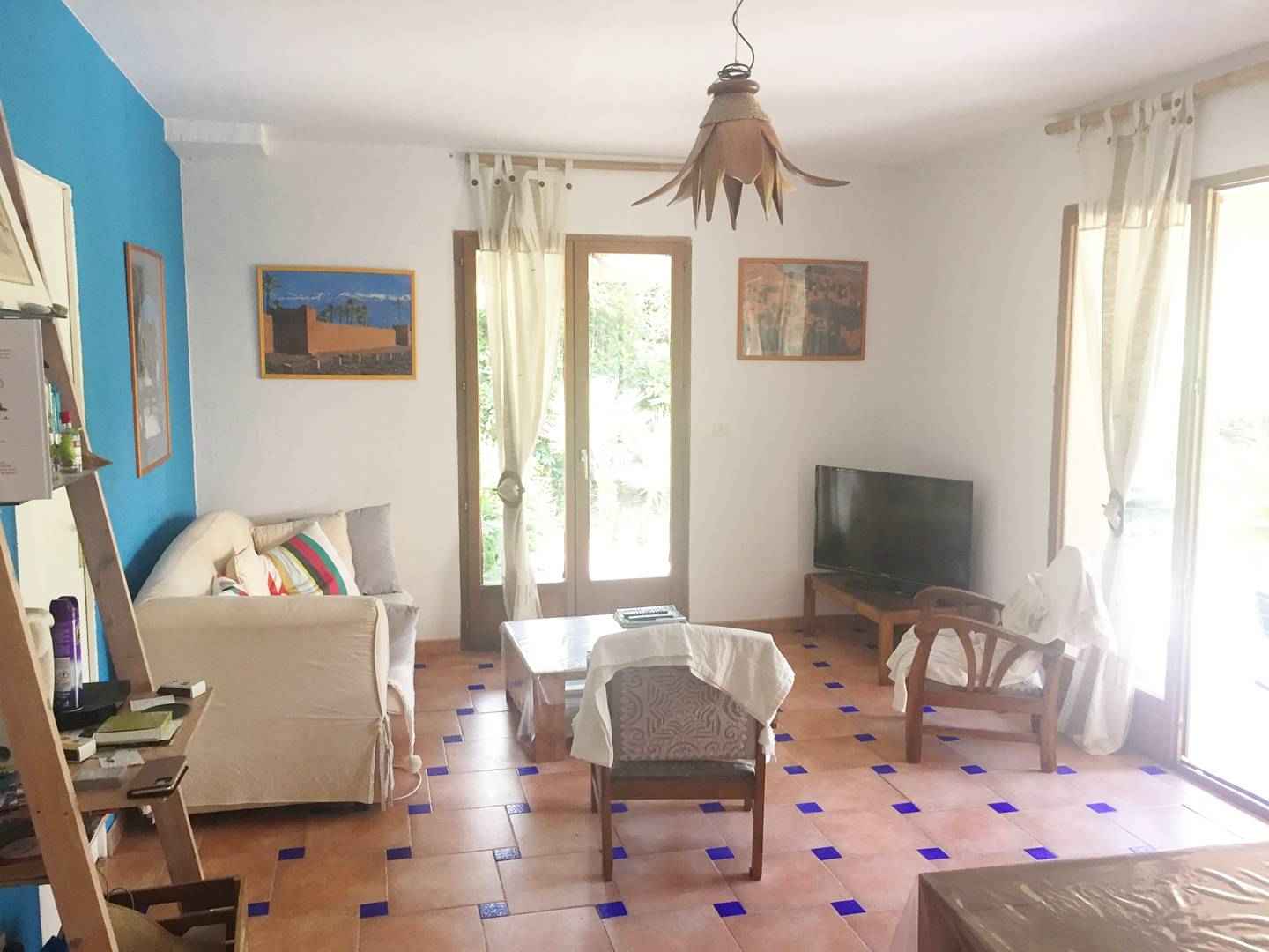 Séjour : canapé convertible, télévision (réception orange), connexion Wi-Fi, salle à manger.