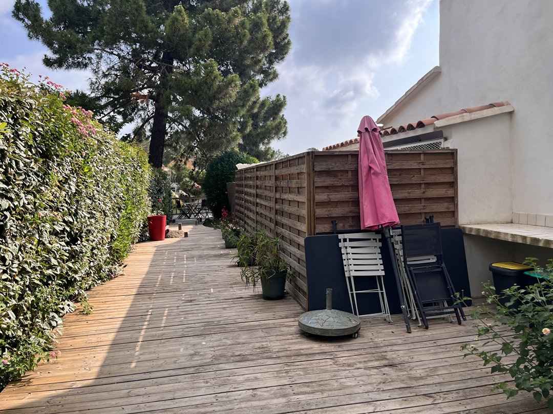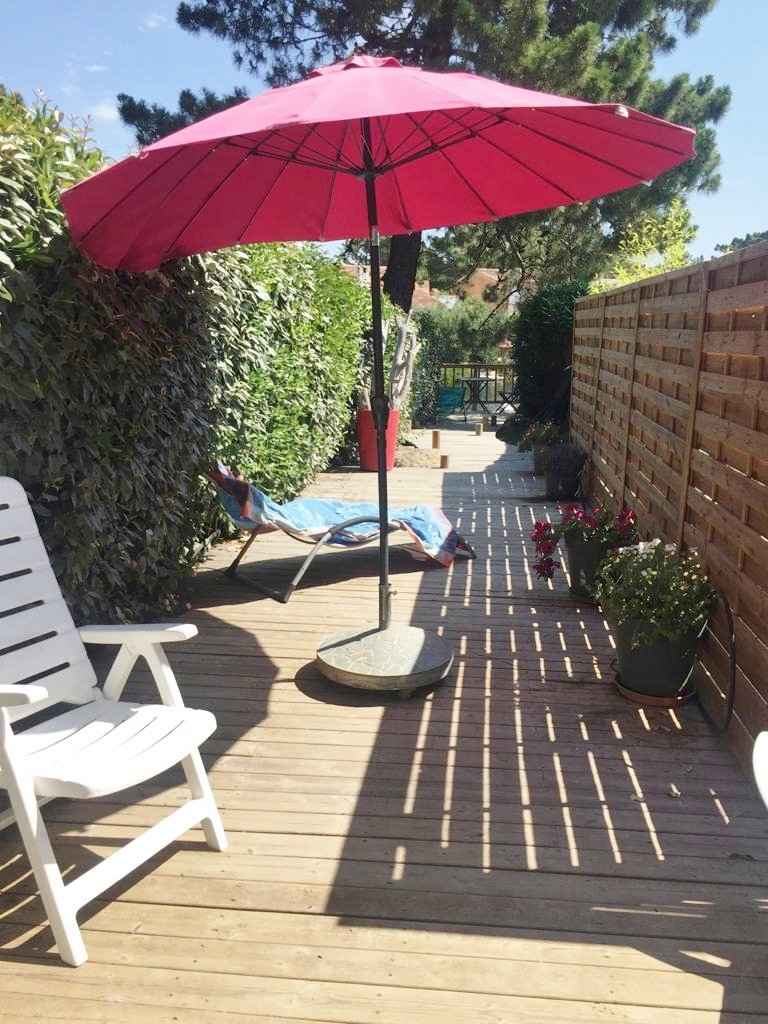 douche extérieure, barbecue, salon de jardin, transats. Fermé par portail (1 place de parking).