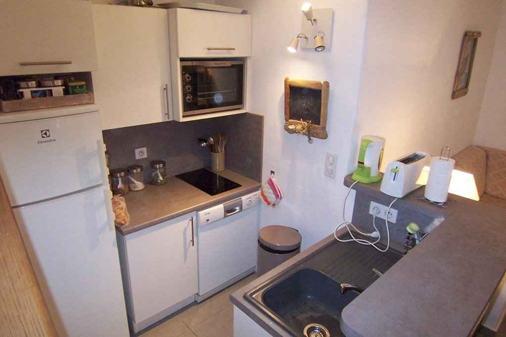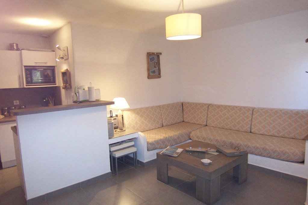 Séjour/kitchenette : climatisé : banquette d'angle transformable en 2 couchages (90 cm), télévision écran plat (TNT), combiné réfrigérateur-congélateur, four, four micro-onde, plaques de cuisson (vitrocéramiques), lave-linge, lave-vaisselle, cafetière Nespresso, table et fer à repasser,bouilloire électrique, grille-pain, mixer, sèche-cheveux, aspirateur, coffre-fort.