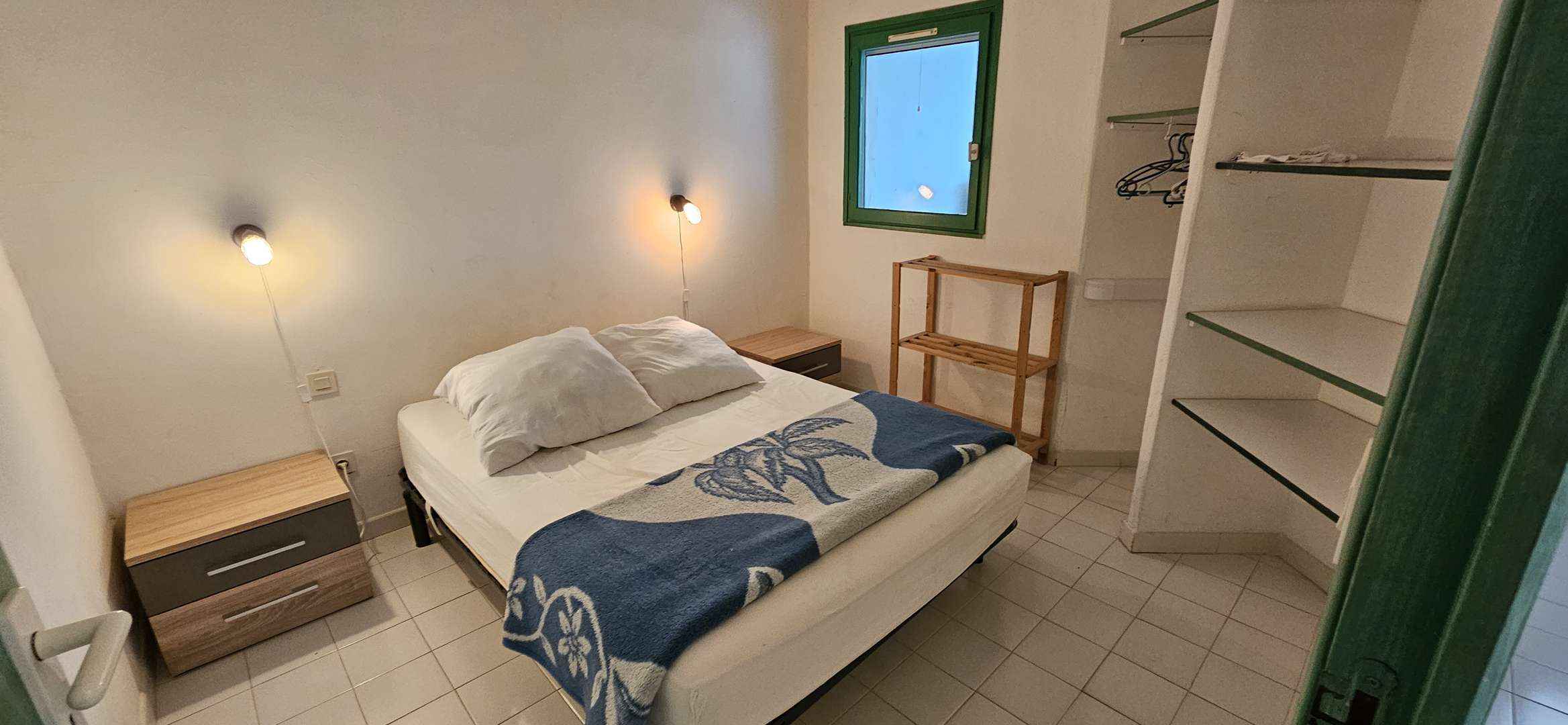 Chambre 2 : clim : 1 lit double en 140, rangements.