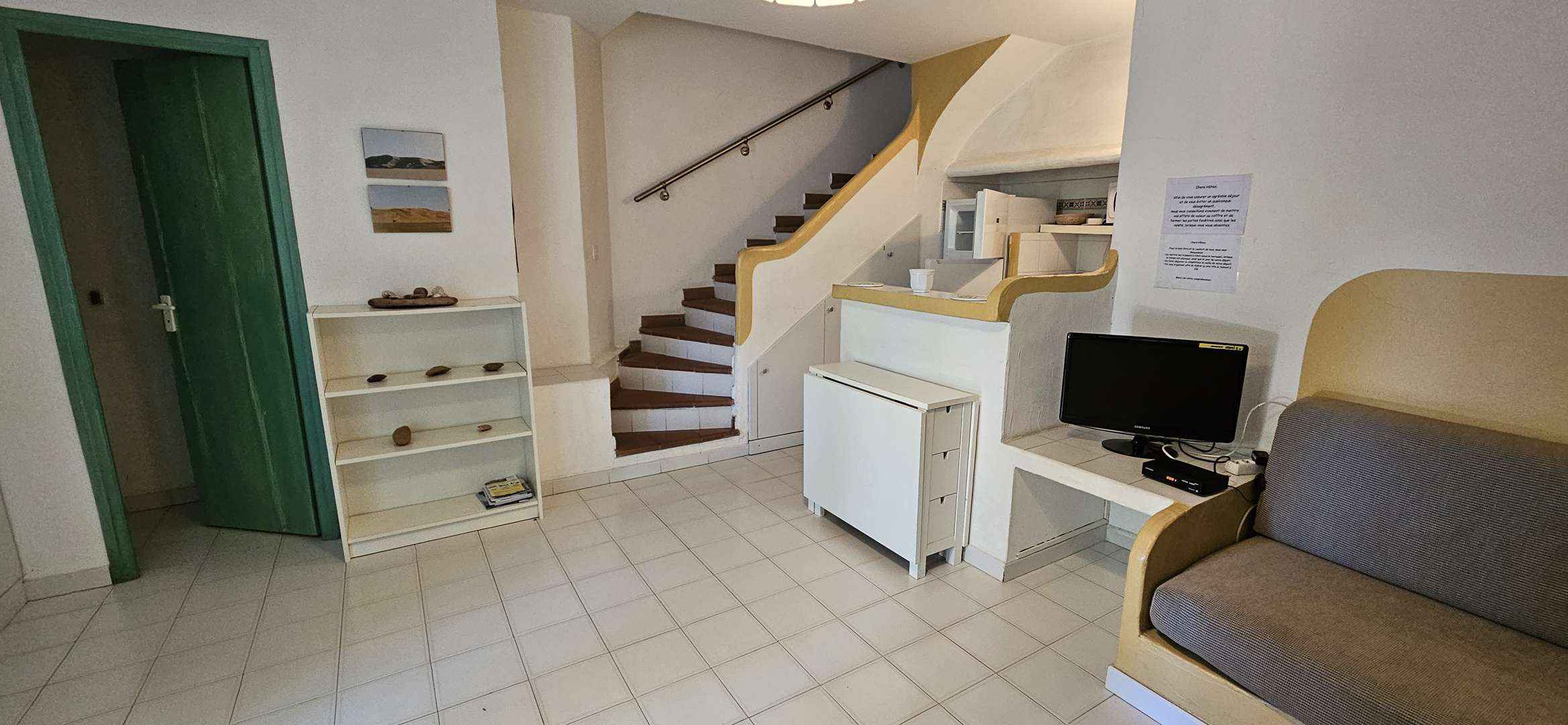 - Séjour/cuisine (Séjour : banquette d'angle, télévision, réfrigérateur, plaque de cuisson éléctrique, lave linge, cafetière, bouilloire, grille-pain...)
