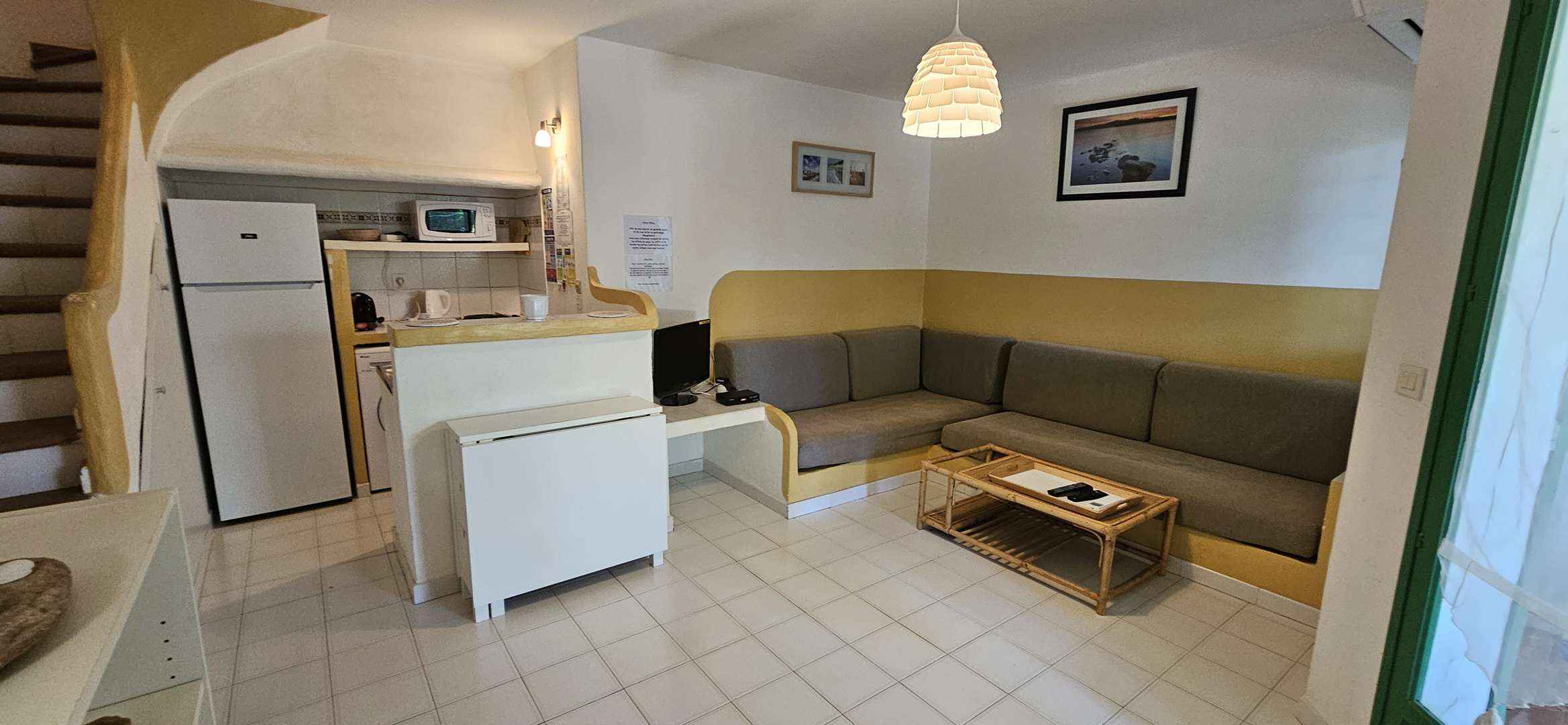 Séjour/kitchenette : clim : banquette d'angle, télévision, réfrigérateur combiné congélateur, four micro-onde, plaques électriques, cafetière filtre, bouilloire, grille-pain, lave-vaisselle, lave-linge, aspirateur, coffre-fort..
