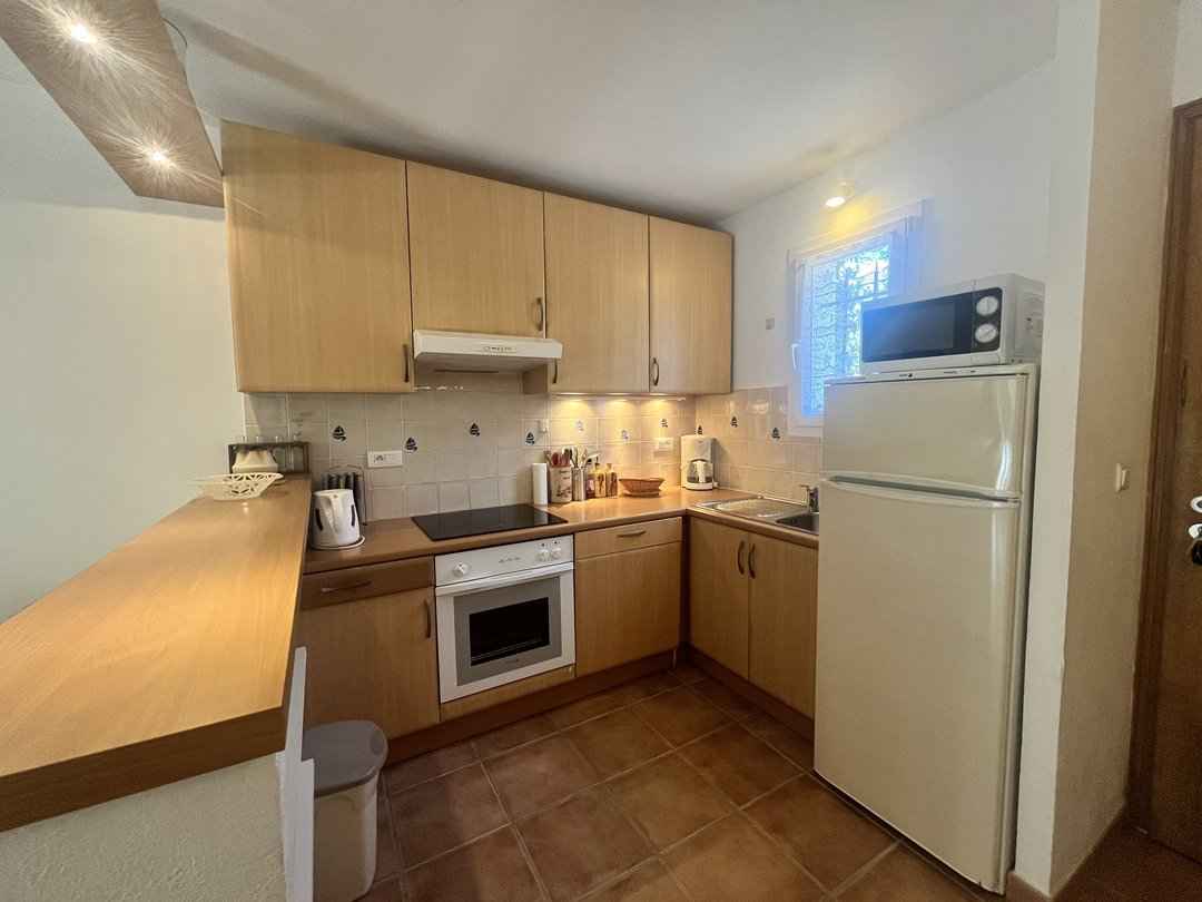- Séjour/cuisine (Séjour/cuisine américaine - (baie vitrée) – store électrique -: plaque de cuisson (vitrocéramique), four (électrique), hotte aspirante, frigo-congélateur, cafetière, lave-vaisselle, rangements aménagés, canapé convertible, télévision.)