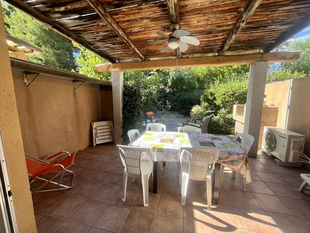 - Terrasse ((couverte - ) avec petit jardin privatif : salon de jardin, douche extérieure, barbecue fixe en pierre.)