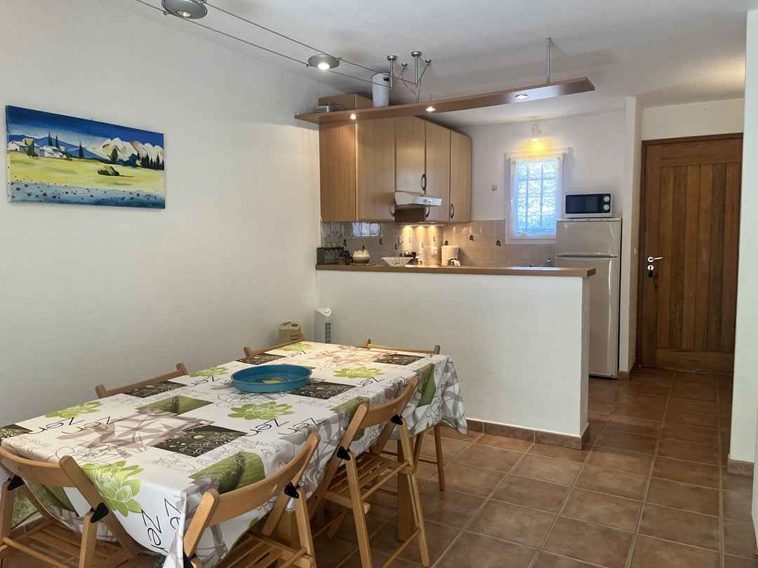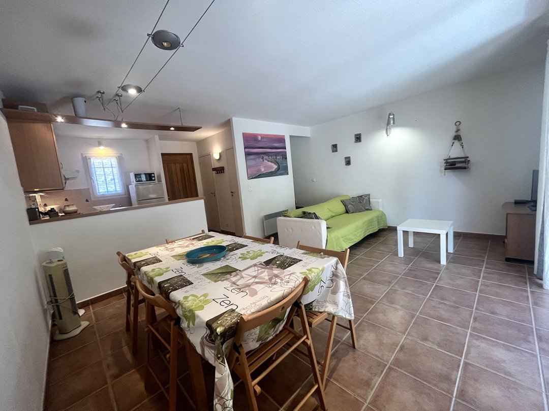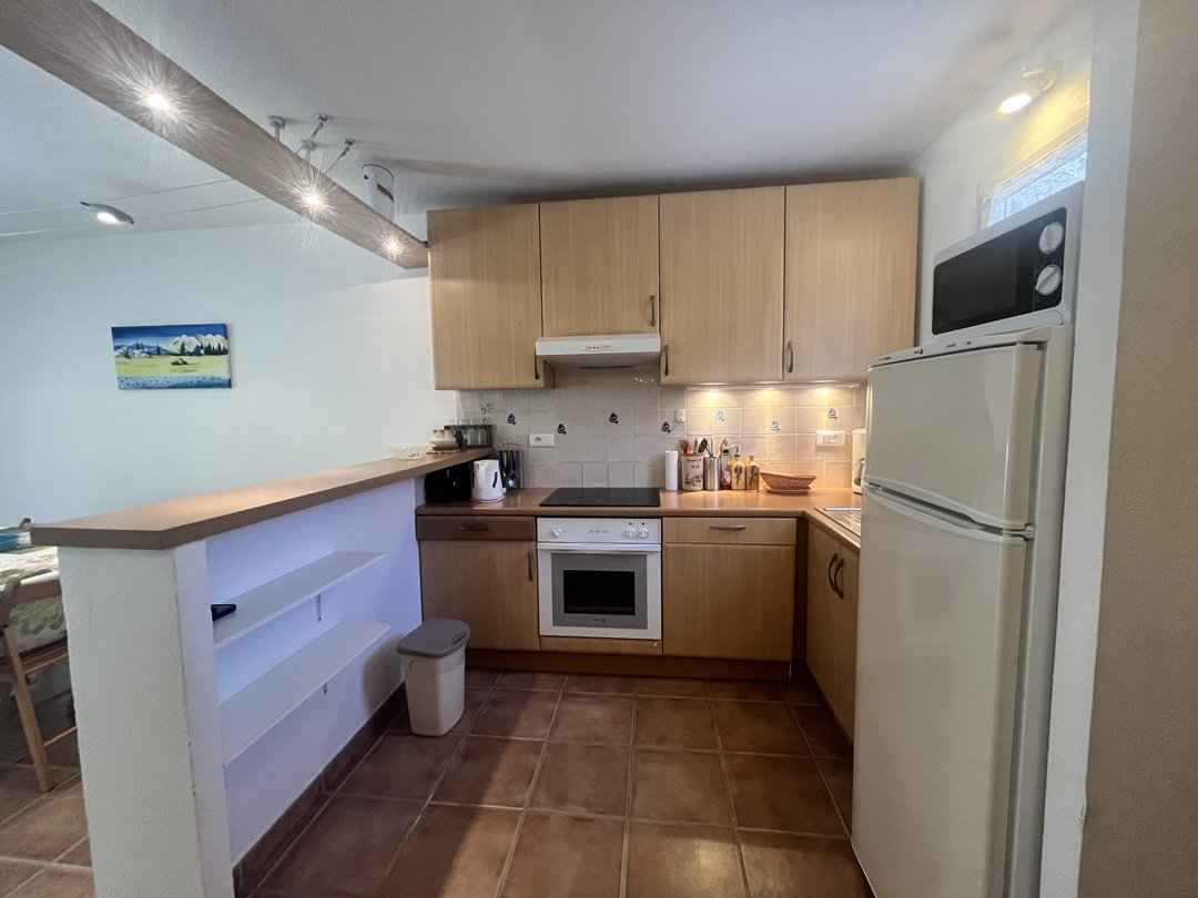 Séjour/cuisine américaine - (baie vitrée) – store électrique -: plaque de cuisson (vitrocéramique), four (électrique), hotte aspirante, frigo-congélateur, cafetière classique, lave-vaisselle, rangements aménagés, canapé convertible, télévision.