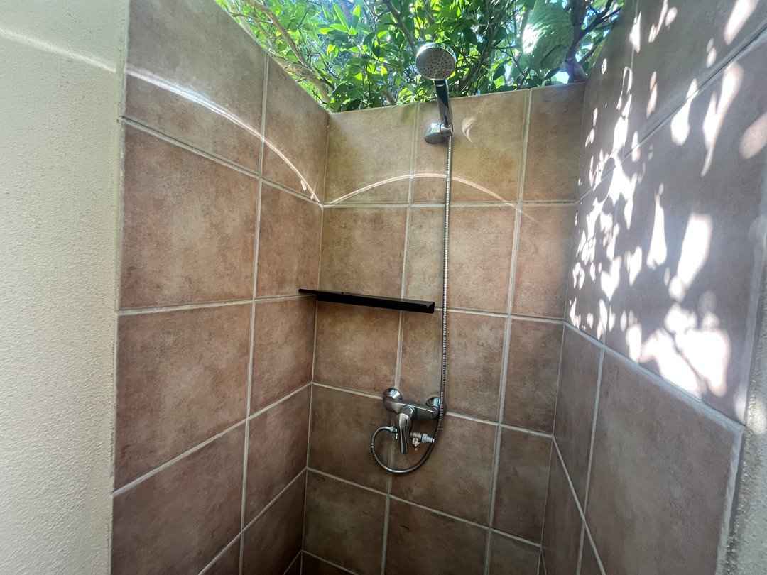 Terrasse (couverte) avec petit jardin privatif : salon de jardin, douche extérieure, barbecue fixe en pierre.