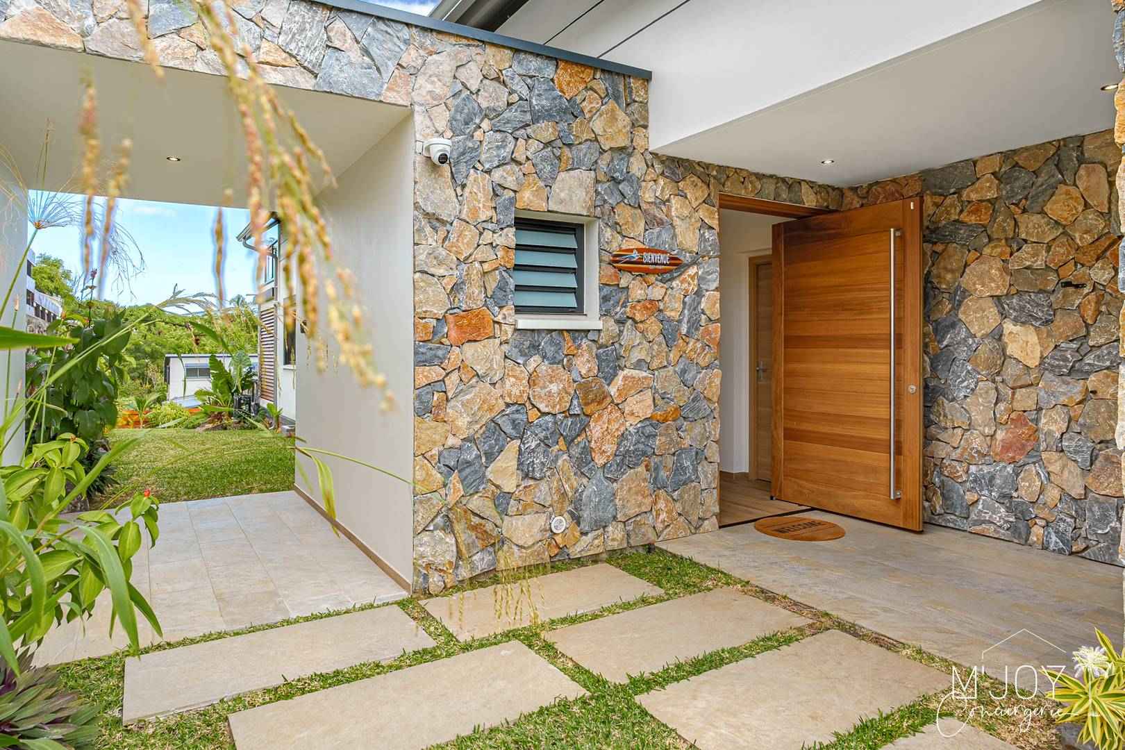 La majestueuse porte d’entrée dessert sur la gauche un WC, puis une buanderie toute équipée, et enfin une immense pièce de vie toute ouverte sur la terrasse et la piscine, où la vue sur la végétation et l’océan domine.