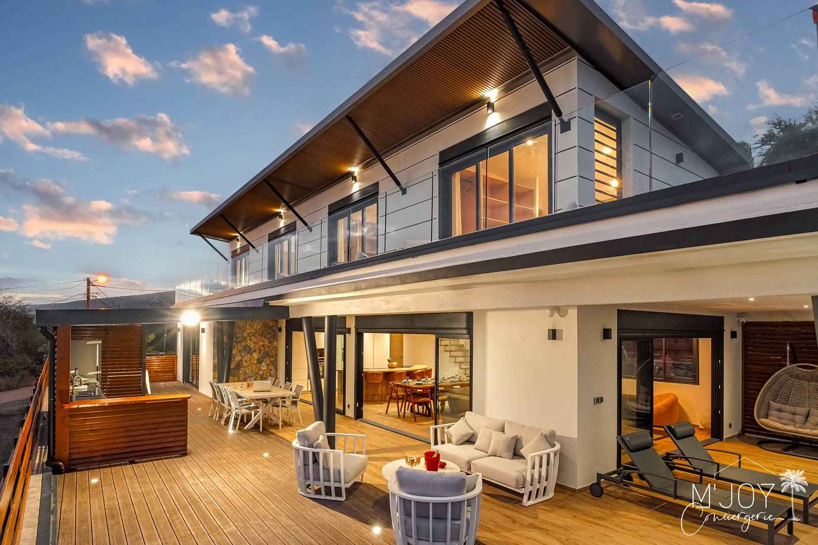 Les extérieurs se prolongent avec la terrasse mi ombragée, mi ensoleillée, ses 5 transats ainsi que son salon cosy. Une douche chauffée permet de vous rincer en rentrant de la plage, ou tout simplement pour le plaisir de se doucher sous les étoiles.