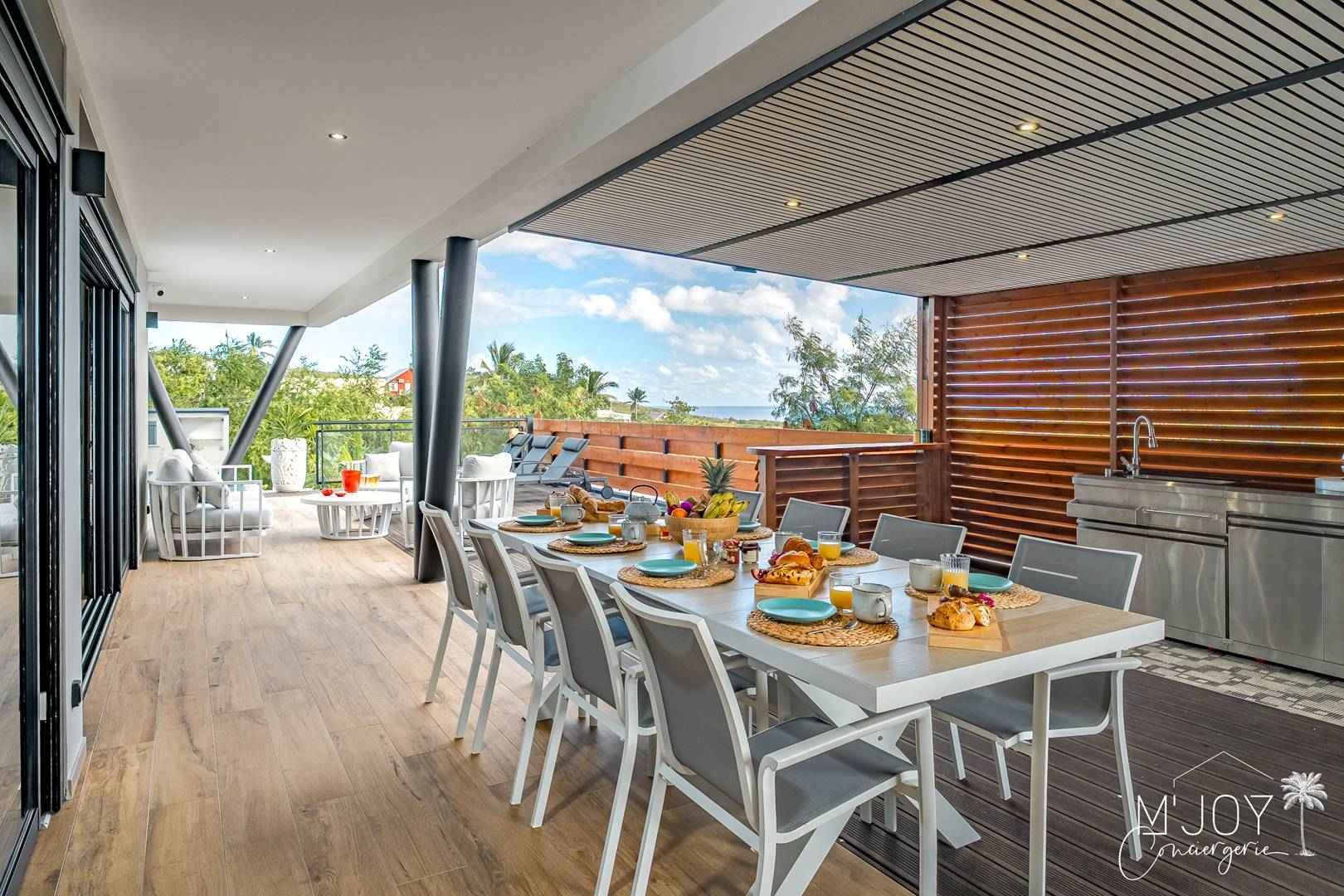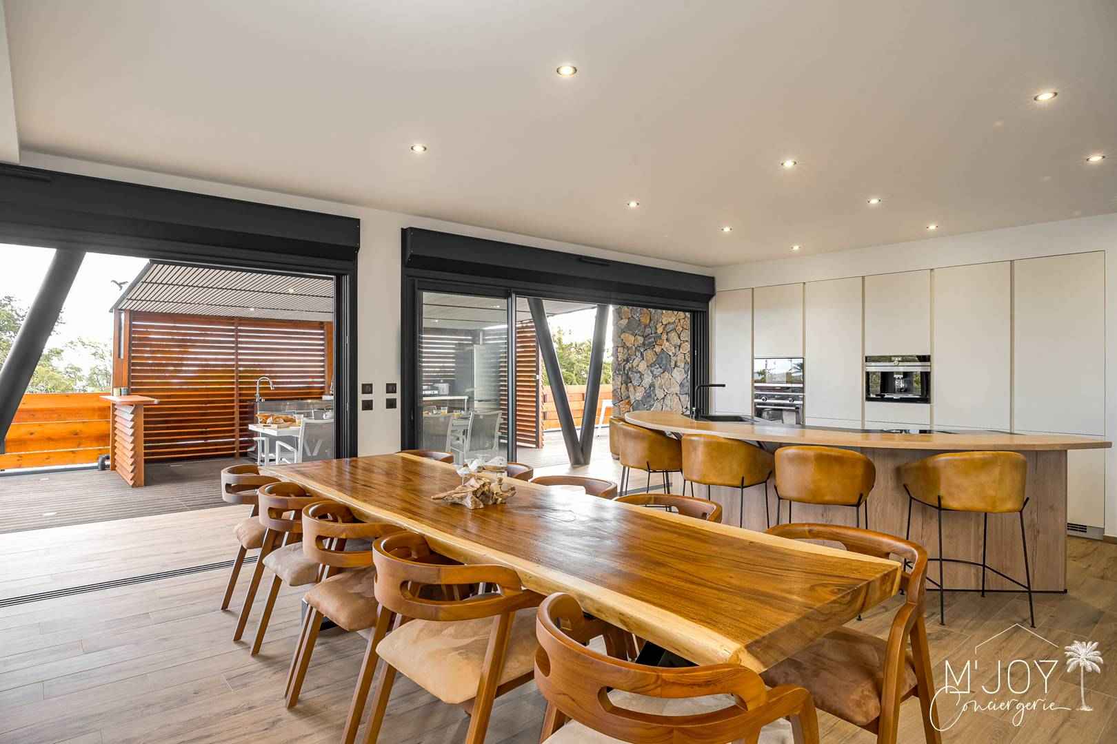Poussez ensuite les baies vitrées et découvrez la varangue et sa grande cuisine extérieure pour une ambiance estivale toute l’année : table pour 10 personnes, évier en inox, plancha électrique, trépied, et frigo supplémentaire. Sans oublier, le billard en extérieur, face à l’océan. Multifonction, ce billard peut aussi se transformer en véritable table de ping-pong.
