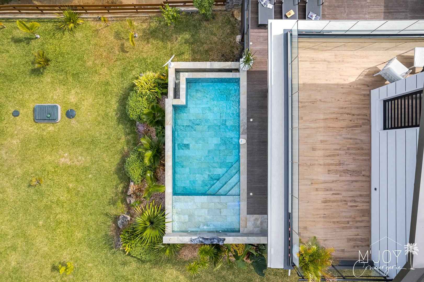 Enfin, la piscine en pierres et son doux son de cascade invitent à l’évasion. La partie à débordement donne l’illusion d’infini vers l’océan. Sécurisée par une alarme, elle est aussi chauffée pendant l’hiver austral de mai à octobre.