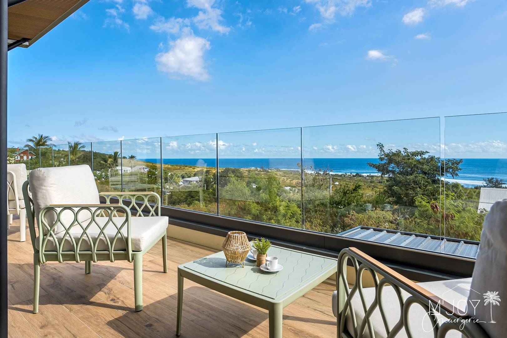 le couloir dessert 4 belles chambres climatisées donnant chacune un accès à une immense terrasse où chaque couple peut bénéficier de son espace. point d’orgue de la propriété, cette terrasse aux garde-corps vitrés offre