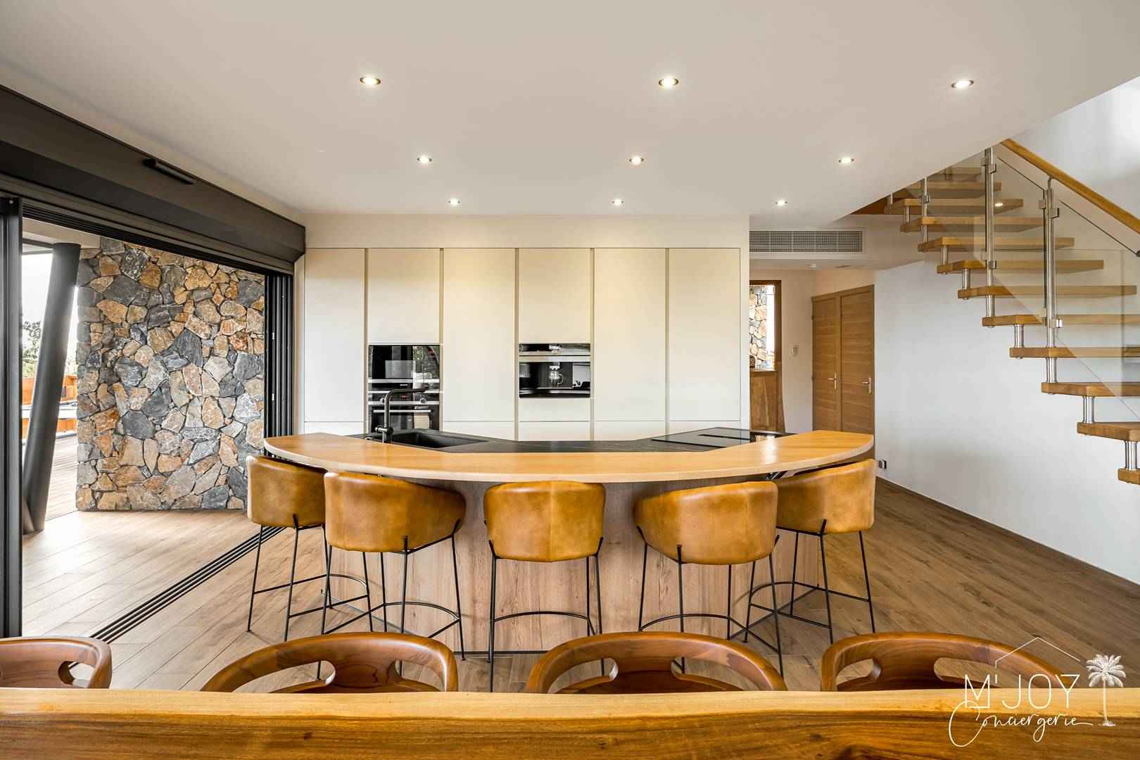 Son îlot central avec bar intégré en bois brut invite à la convivialité, que ce soit pour préparer un repas gastronomique ou partager un apéritif en toute simplicité.