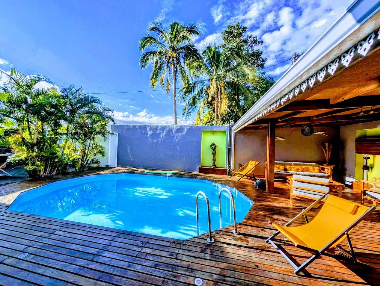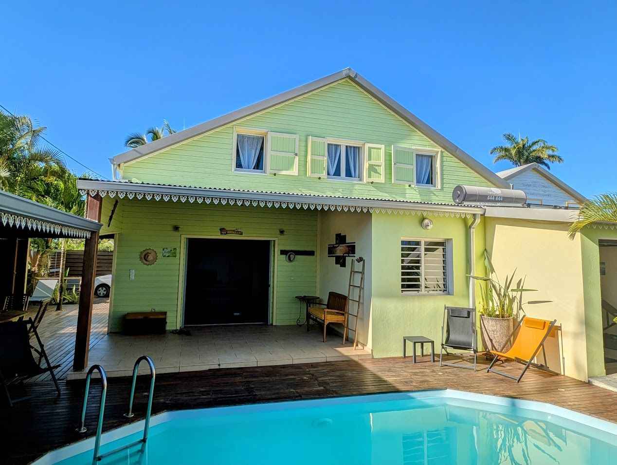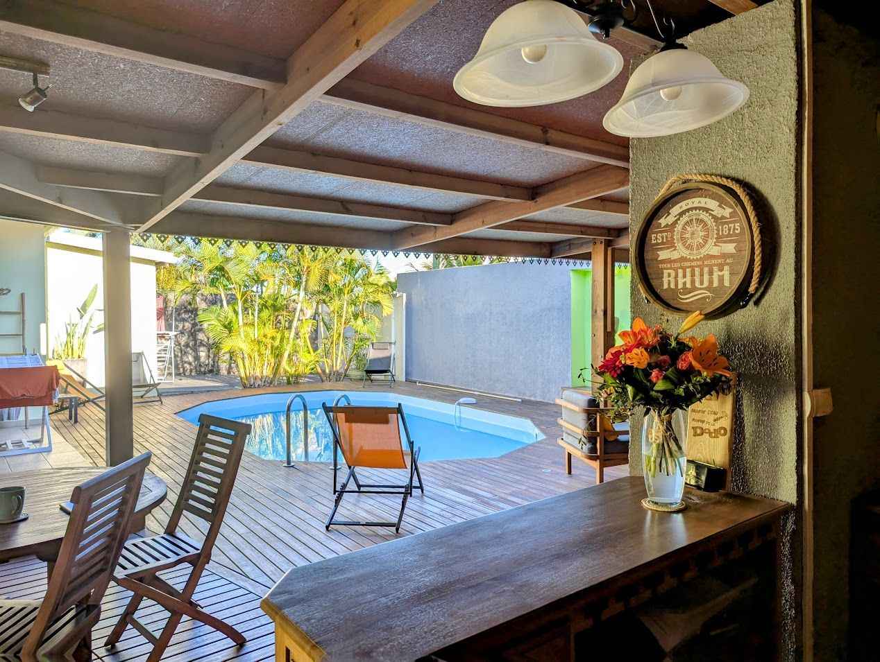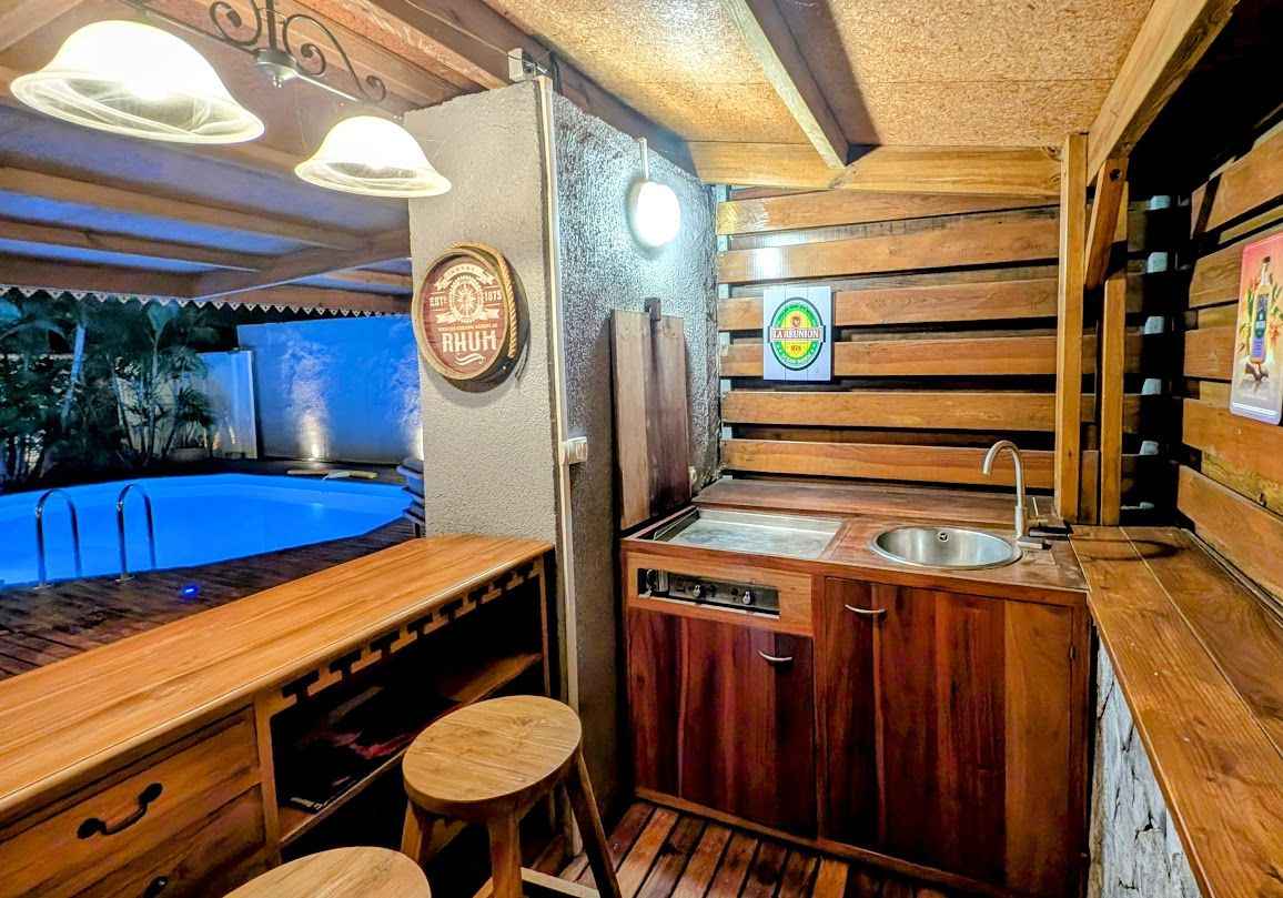 Grande villa tout confort située à saint gilles les hauts, à proximité du musée de villèle et du golf du bassin bleu. de style créole avec décoration locale elle est composée de trois chambres, deux salles de bain, d'une piscine chauffée (solaire), d'une douche extérieure, d'un jardin clos et d'une cuisine extérieure.
