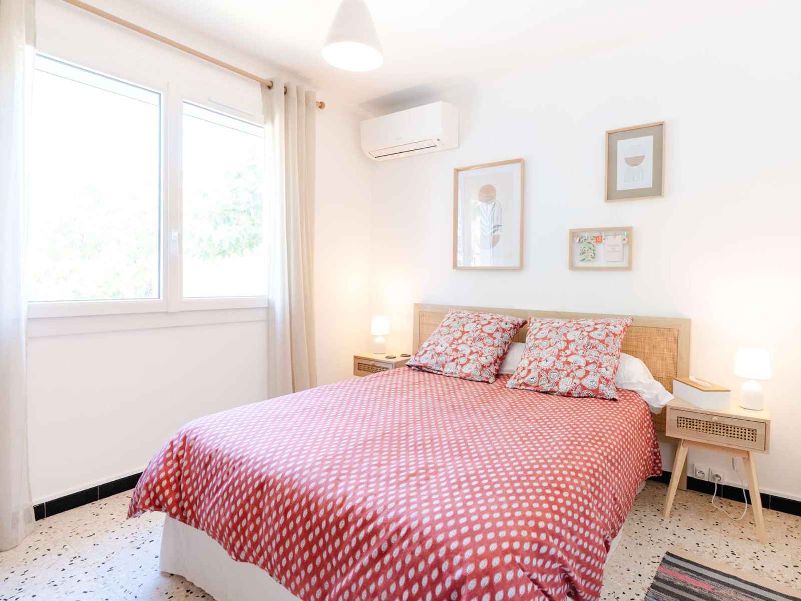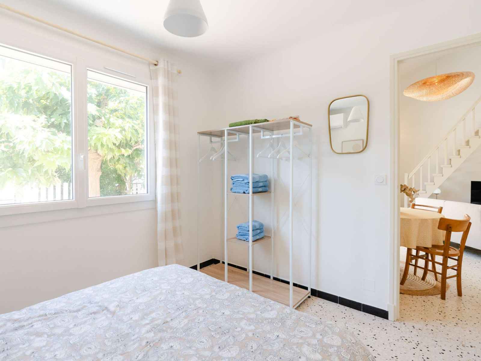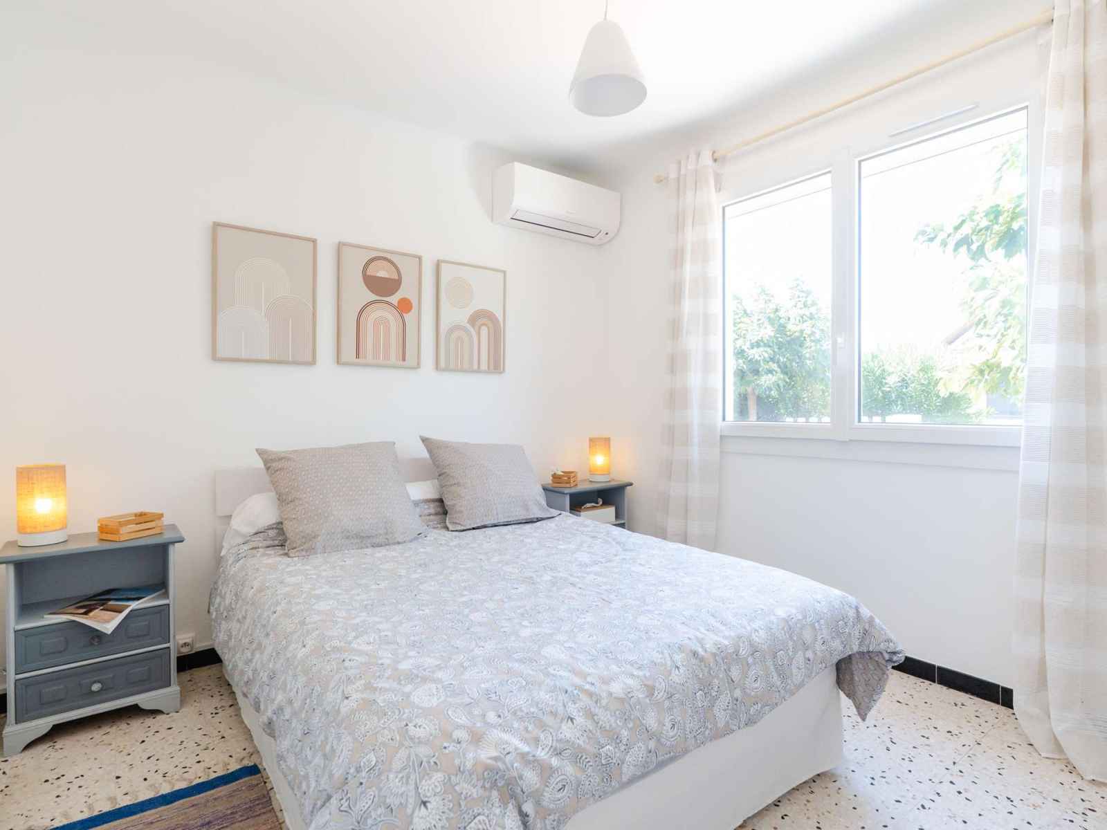 Les 3 chambres se situent au rez-de-chaussée. Les deux chambres avec lit double (140x190) sont climatisées et disposent d'une penderie et de chevets. La chambre avec lit simple (90x190) est plus étroite et dispose d'un chevet et d'une penderie. Au rez-de-chaussée se trouvent également une salle d'eau avec douche à l'italienne, lavabo, sèche-serviette, rangements et des WC séparés.