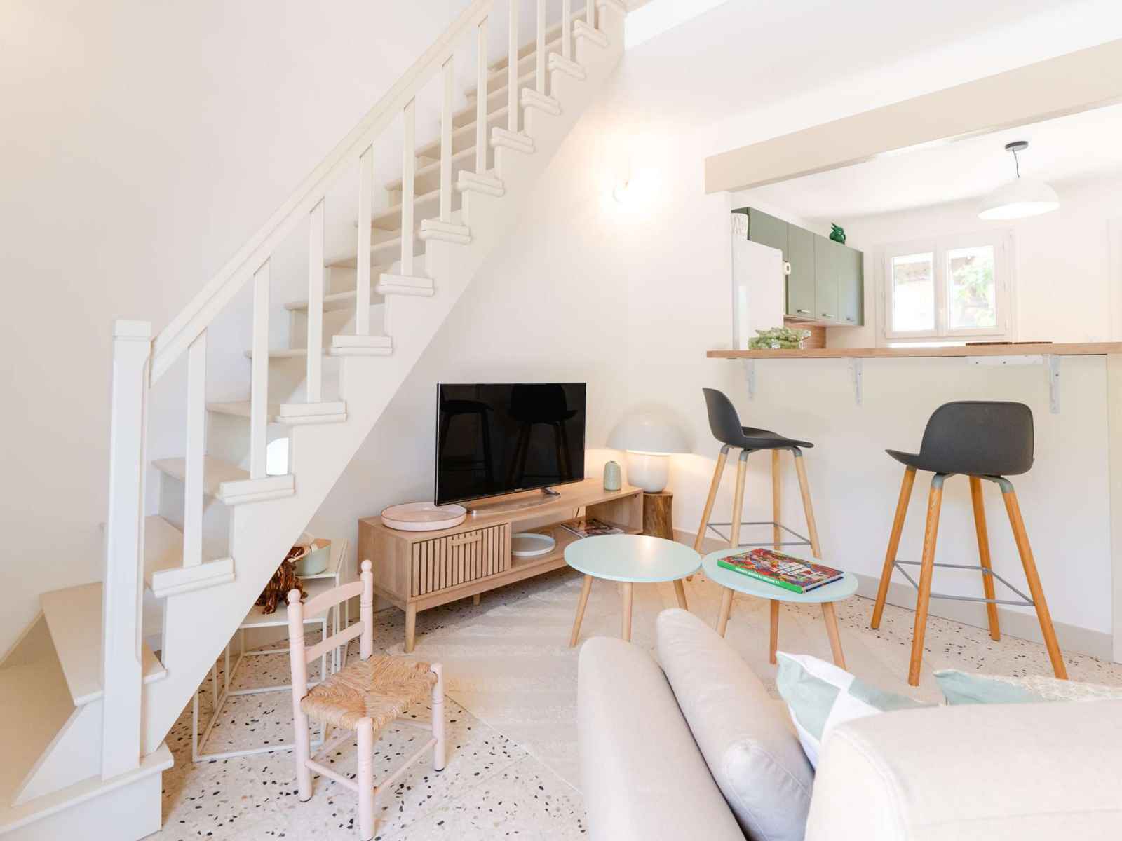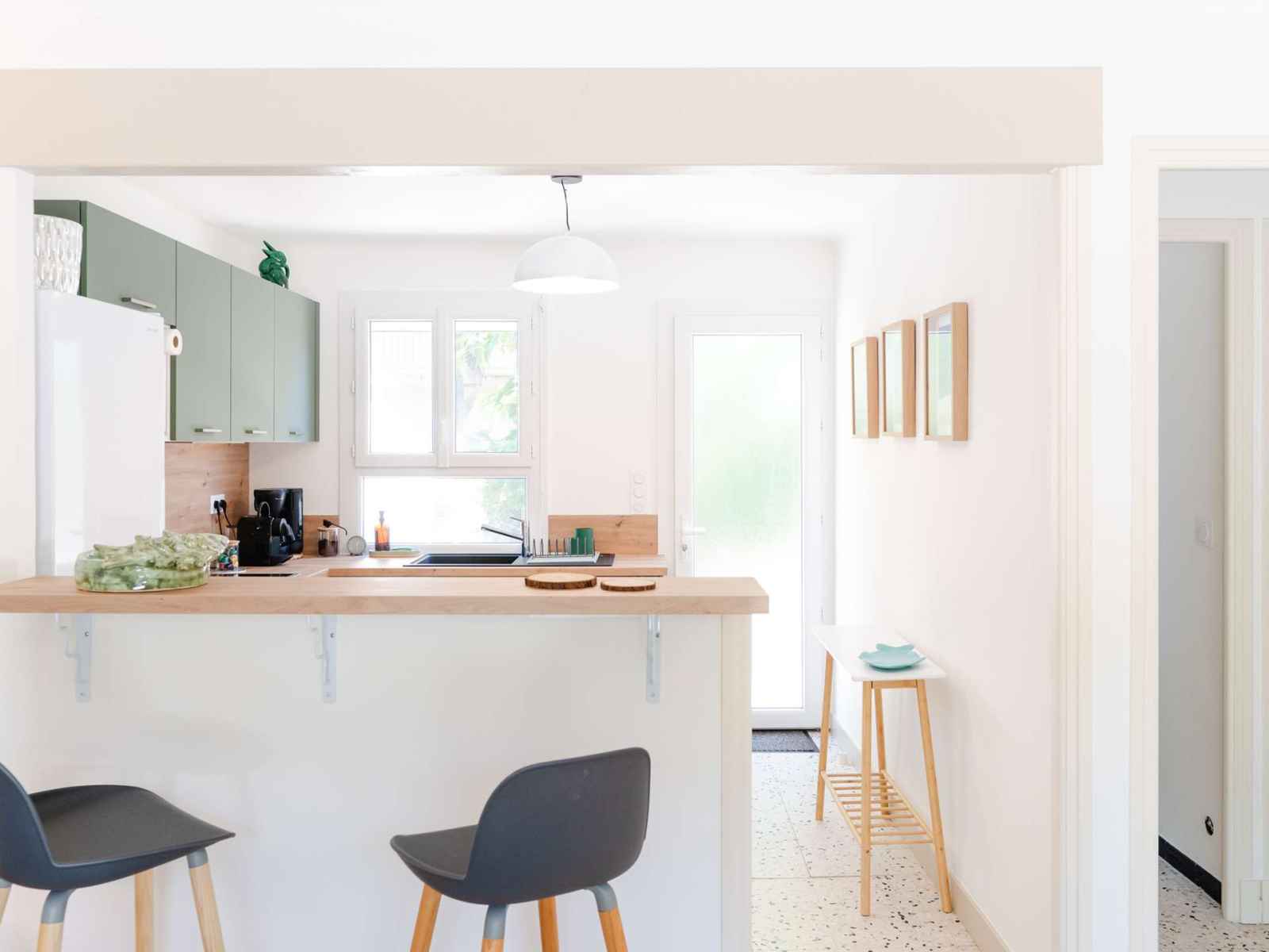 - Cuisine 9m² (Ouverte sur salon, avec bar et 2 chaises hautes)