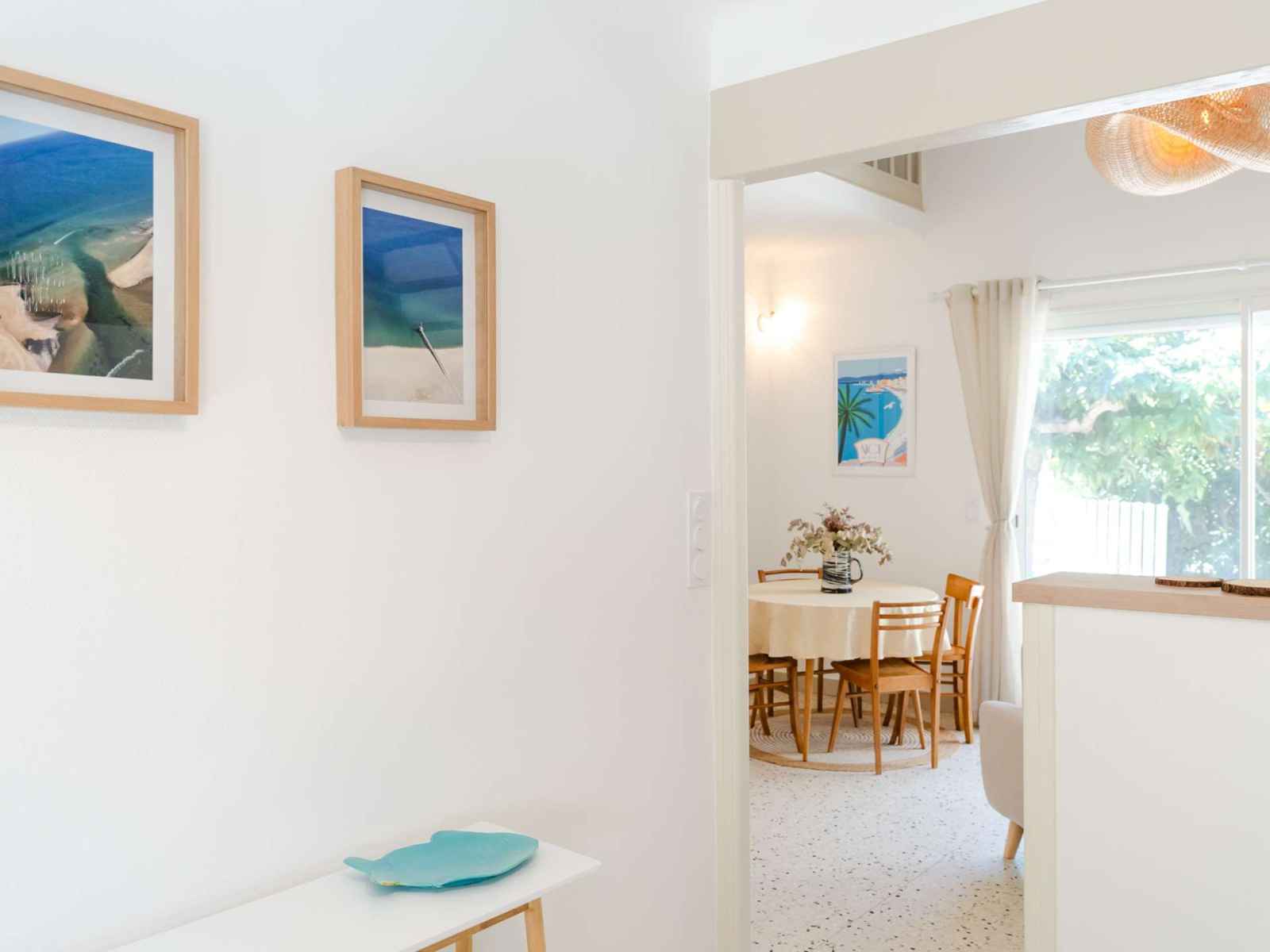 L'entrée se fait à l'arrière de la maison par une cuisine ouverte sur le salon, très bien équipée (réfrigérateur avec compartiment congélateur, lave-vaisselle, four, micro-ondes, cafetière classique et Nespresso, plaque induction 3 feux, hotte aspirante, bouilloire). Le salon climatisé comprend une table ronde pour 4 personnes, un canapé pour 2 personnes et TV (chaines françaises), avec accès à la terrasse située devant la maison.