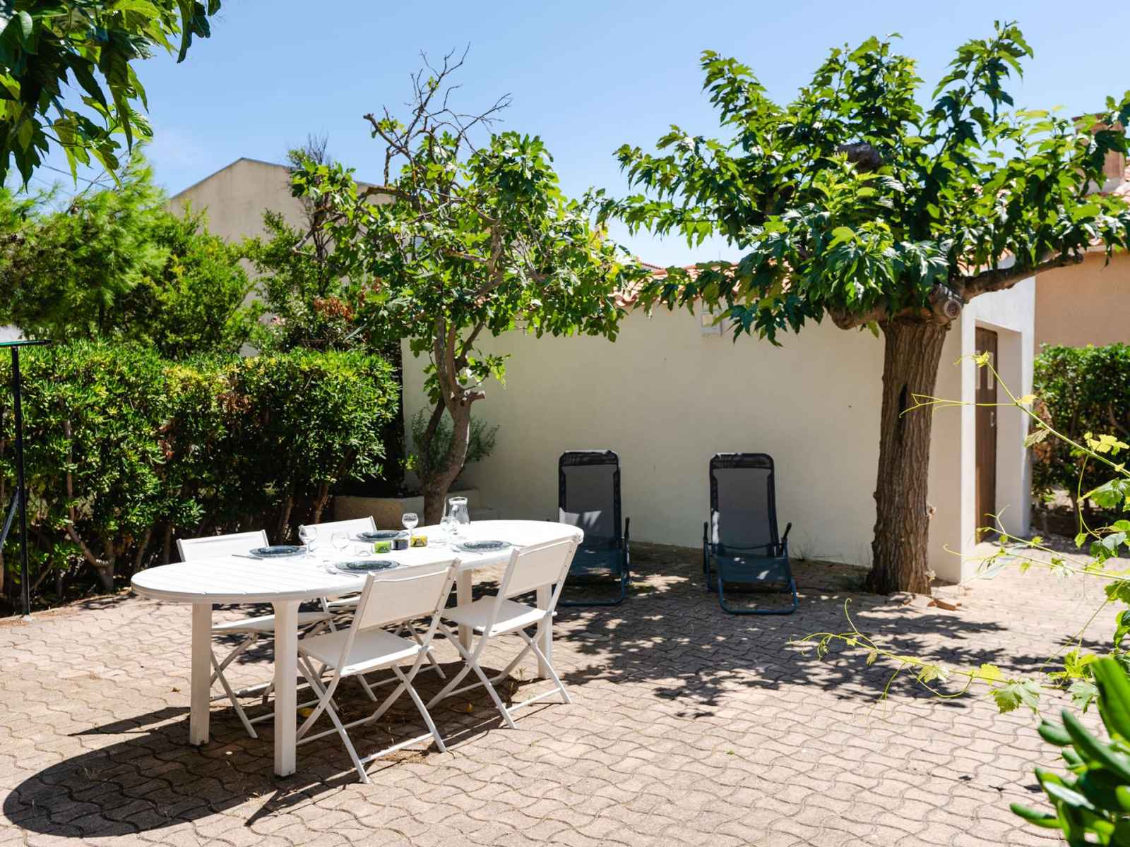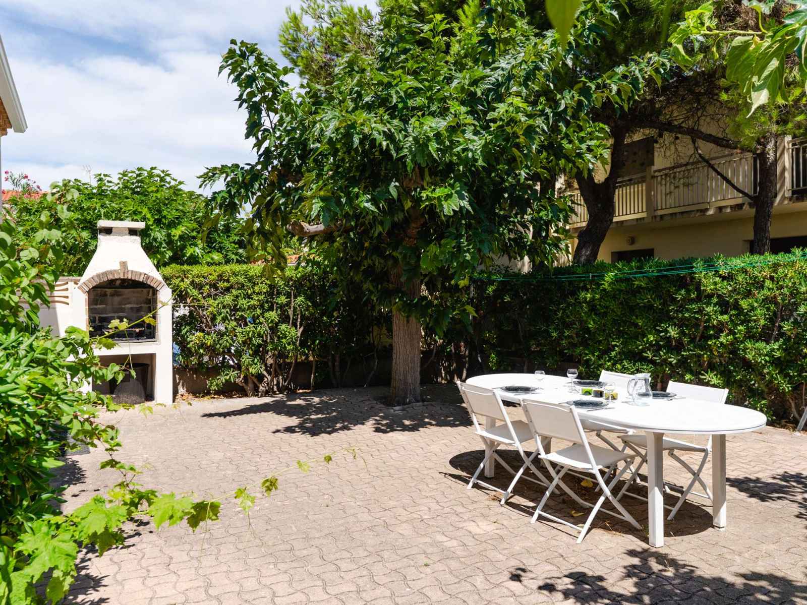L'espace extérieur est vaste, avec un salon de jardin, une douche extérieure, un étendoir fixe et un barbecue en dur (charbon non fourni). Le garage à usage de stockage n'est pas accessible.