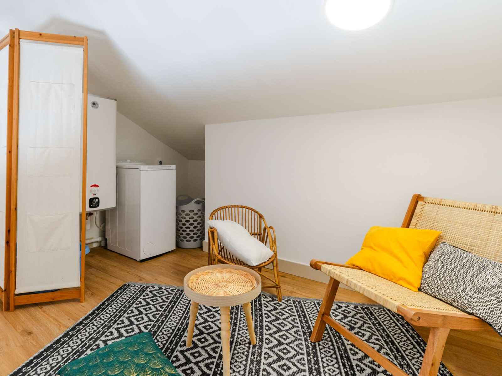Un escalier assez raide mène à l'espace mezzanine climatisé, équipé d'un lave-linge, d'une table basse, de deux fauteuils et de WC séparés avec lave-mains. Une pièce supplémentaire non meublée est accessible mais possède une porte basse (1.60 m de haut).