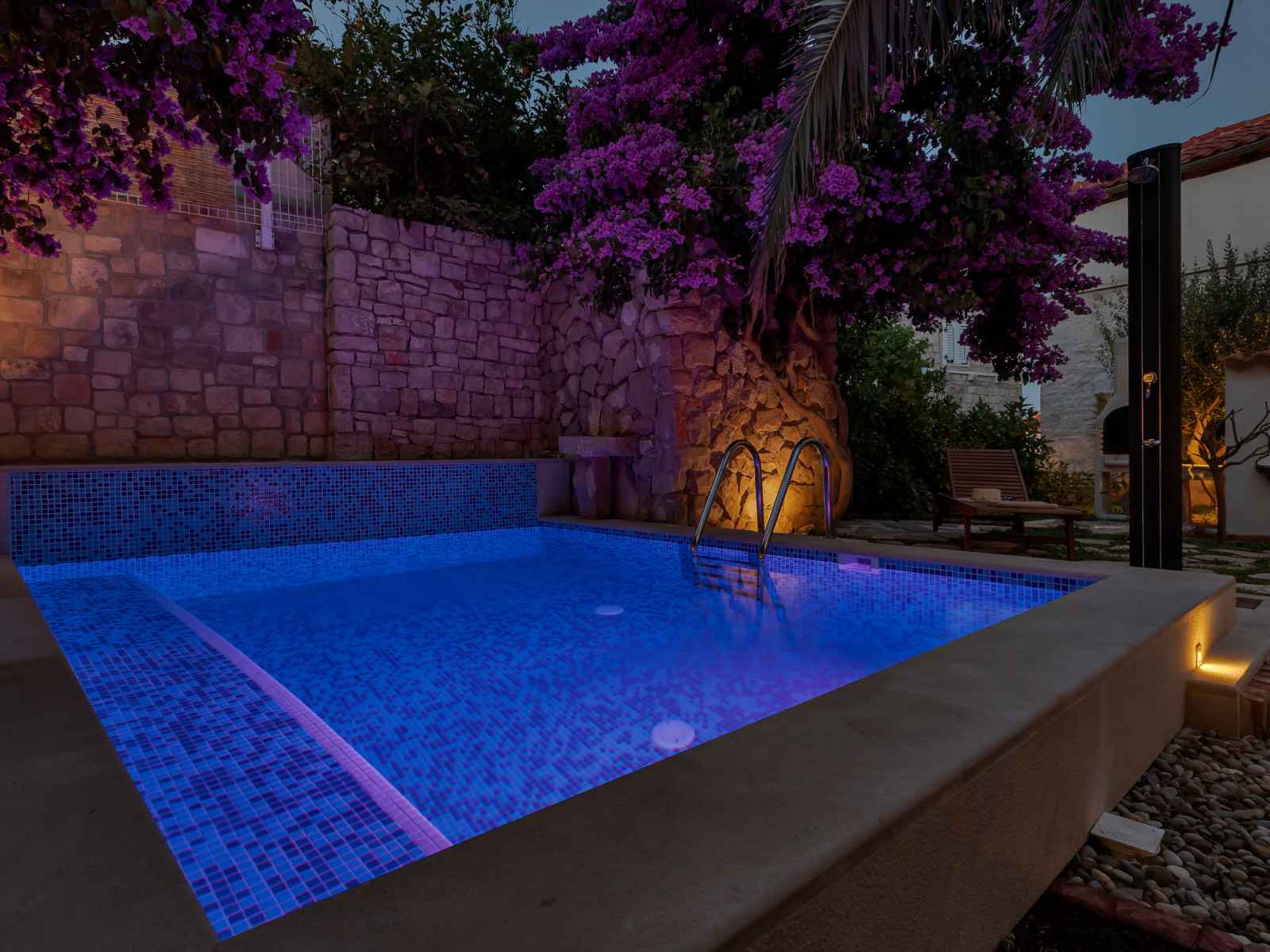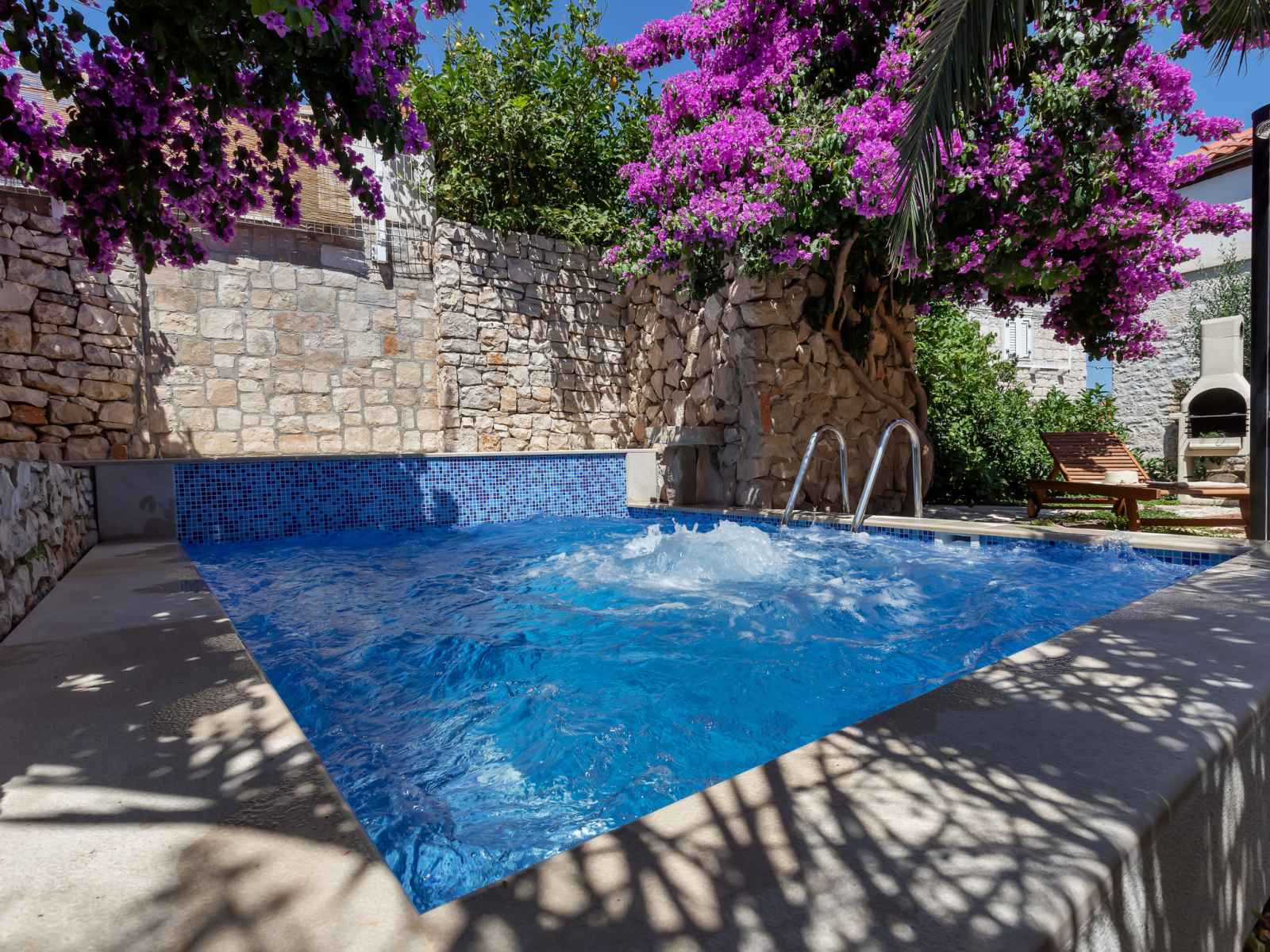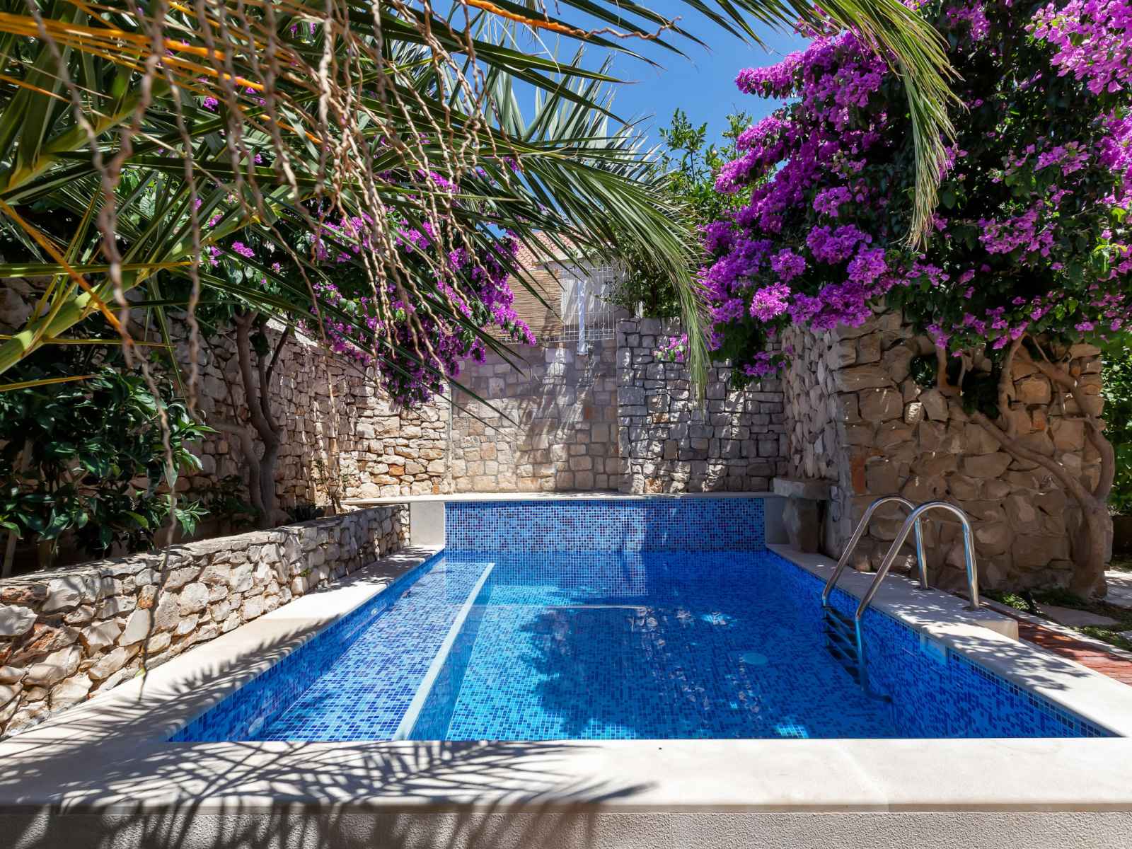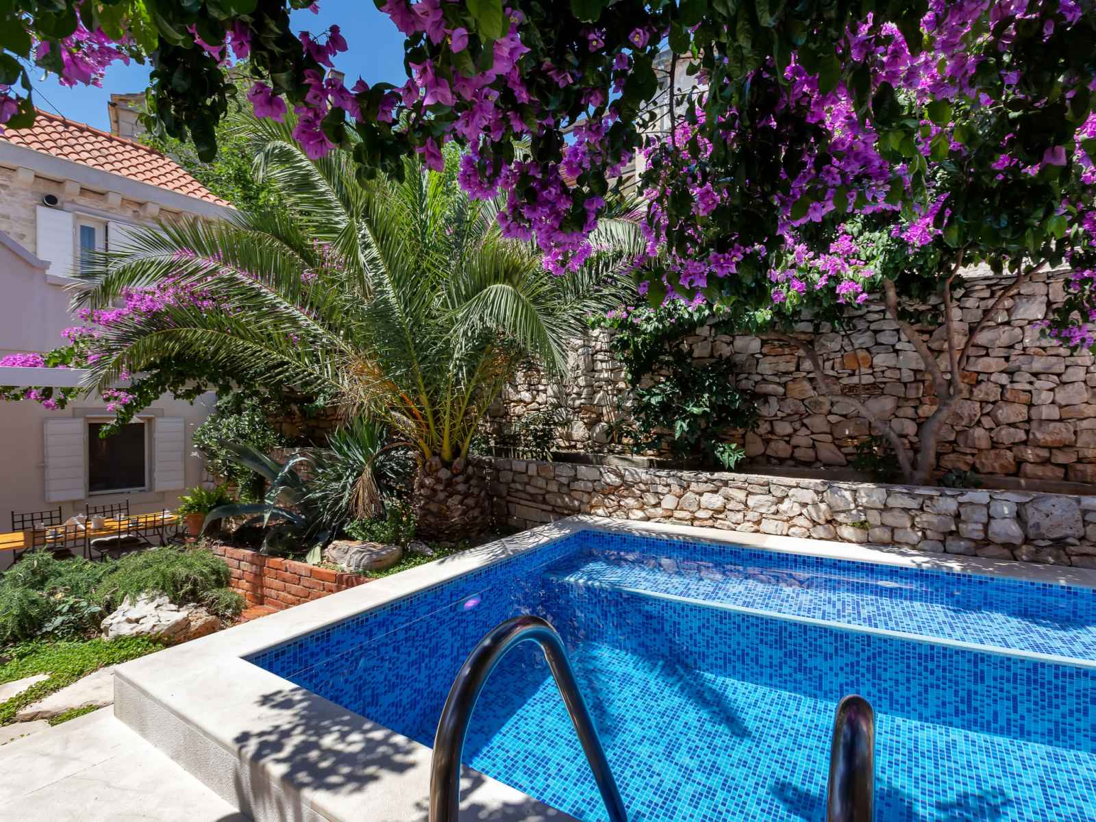 Maison individuelle "marijan", de 2 étages. situation ensoleillée, excellente situation: centrale mais tranquille, au cœur de la ville, à 50 m de la mer, à 50 m de la plage. a usage privé: terrain 120 m2 (clôturé), jardin sur plusieurs niveaux entretenu, piscine rectangulaire, chauffée (4 x 3 m, 14 m2, profondeur 150 cm, disponibilité