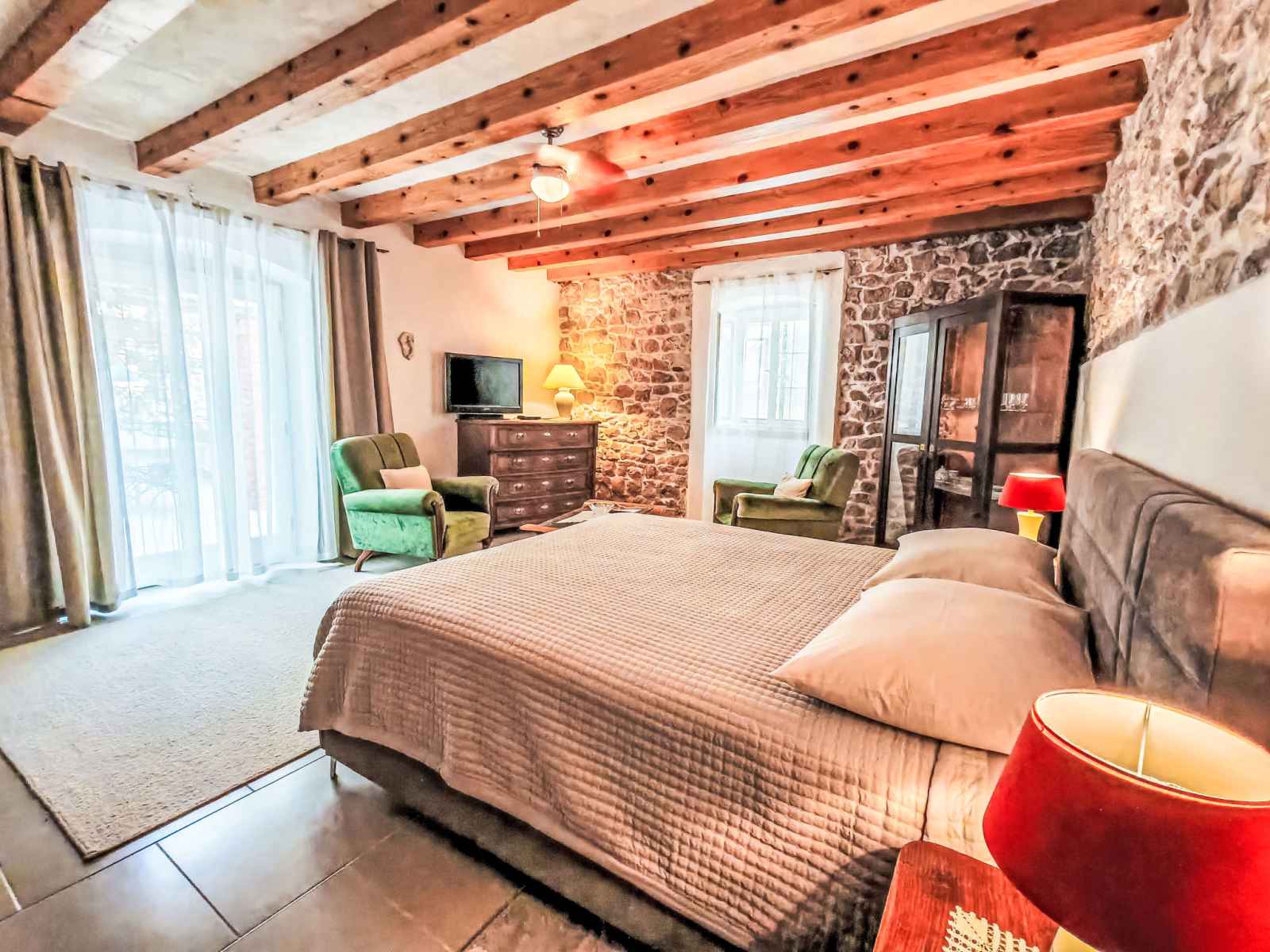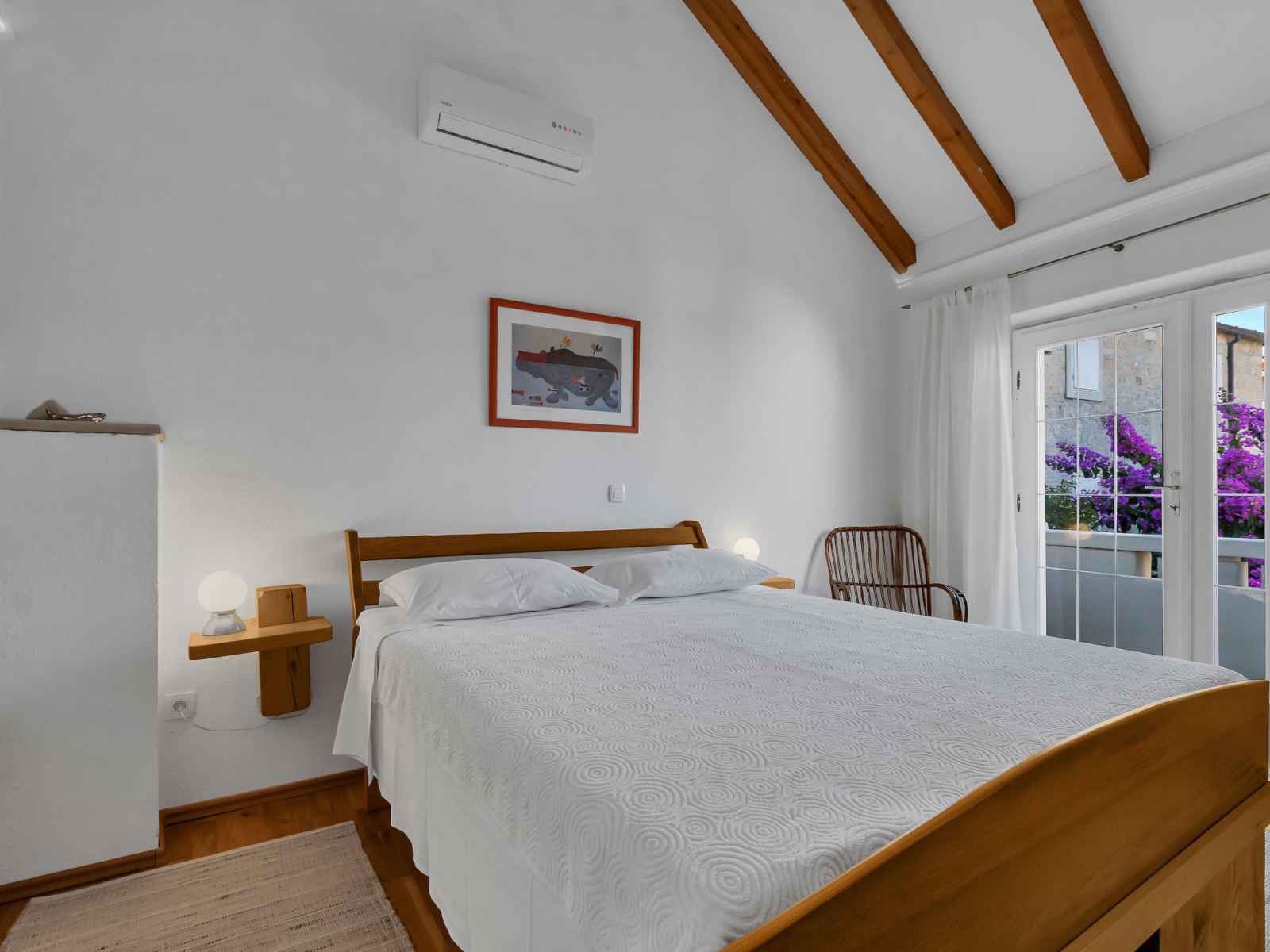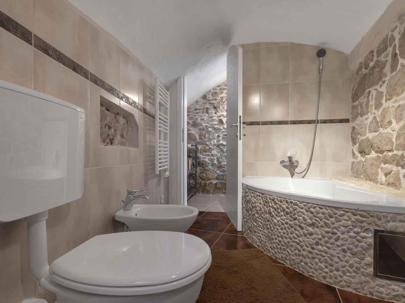 Bain/bidet/WC avec baignoire d'angle. À l'étage supérieur: 1 chambre 20 m2 avec 1 grand-lit (160 cm, longueur 190 cm), air-conditionné. 1 chambre avec 1 grand-lit (160 cm, longueur 190 cm), air-conditionné. Sortie sur la terrasse. Douche/WC. Chauffage par le sol. Terrasse 15 m2. Meubles de terrasse. Partielle vue éloignée sur la mer. A disposition: Internet (Connexion WIFI, gratuit). Place de parking (cloturée).