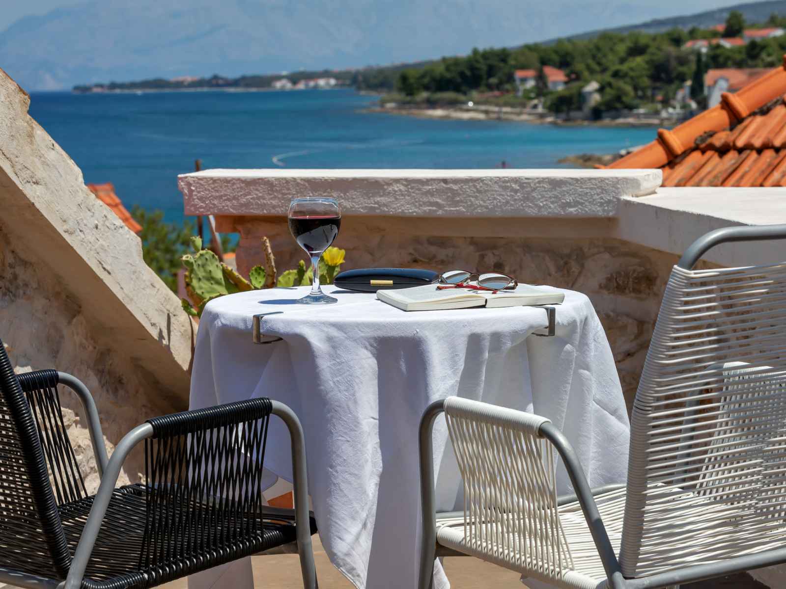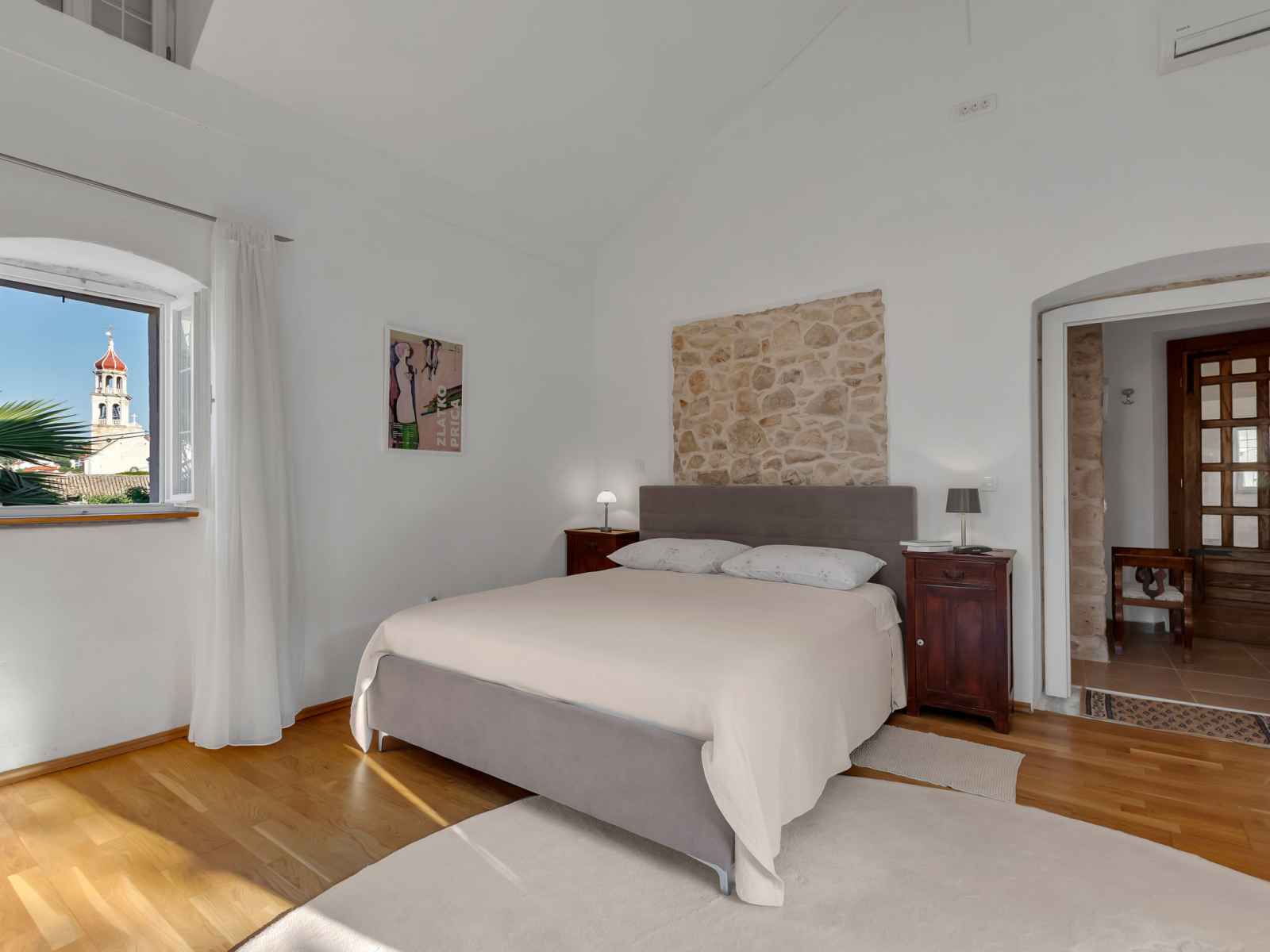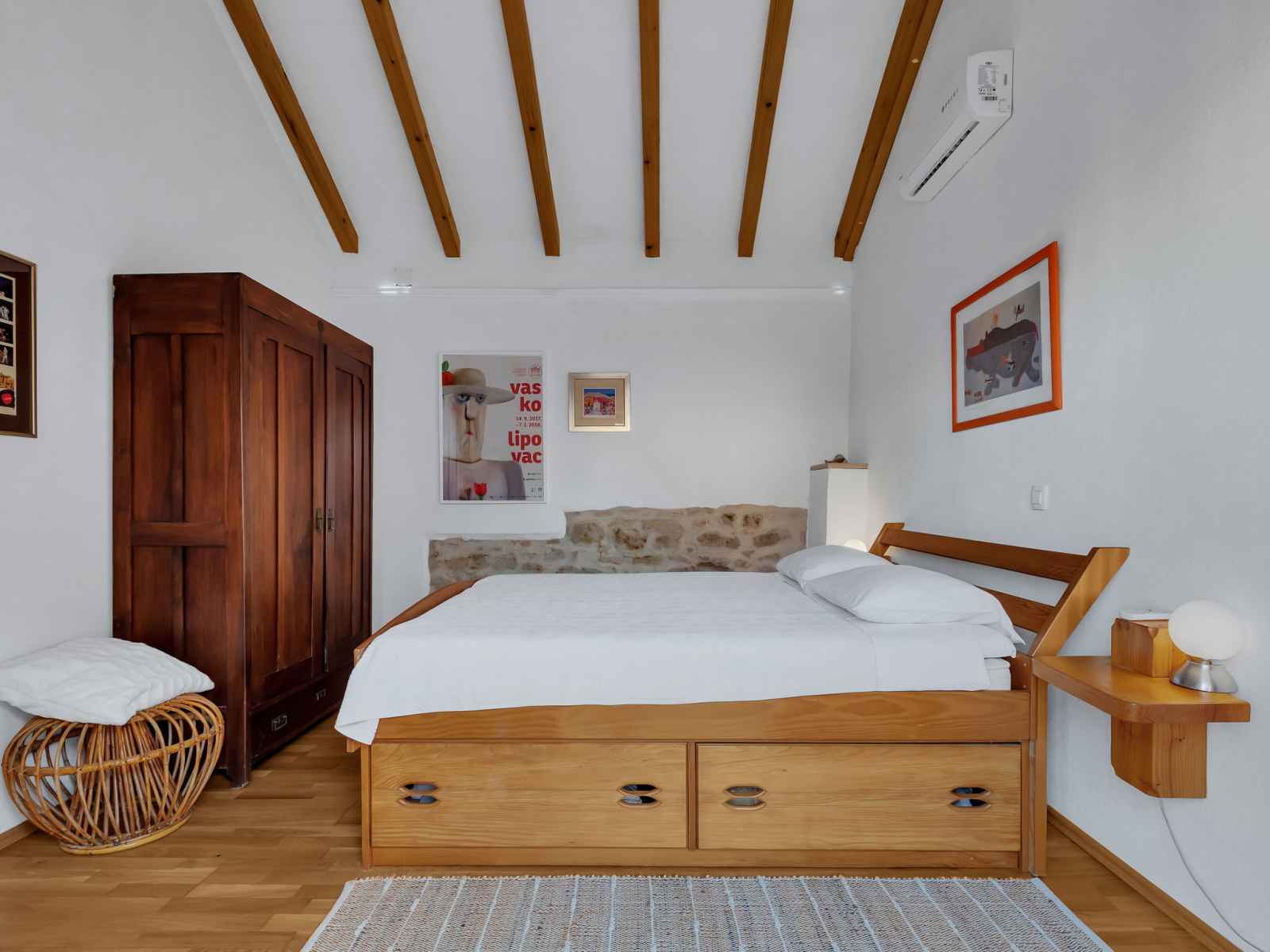 Bain/bidet/WC avec baignoire d'angle. À l'étage supérieur: 1 chambre 20 m2 avec 1 grand-lit (160 cm, longueur 190 cm), air-conditionné. 1 chambre avec 1 grand-lit (160 cm, longueur 190 cm), air-conditionné. Sortie sur la terrasse. Douche/WC. Chauffage par le sol. Terrasse 15 m2. Meubles de terrasse. Partielle vue éloignée sur la mer. A disposition: Internet (Connexion WIFI, gratuit). Place de parking (cloturée).
