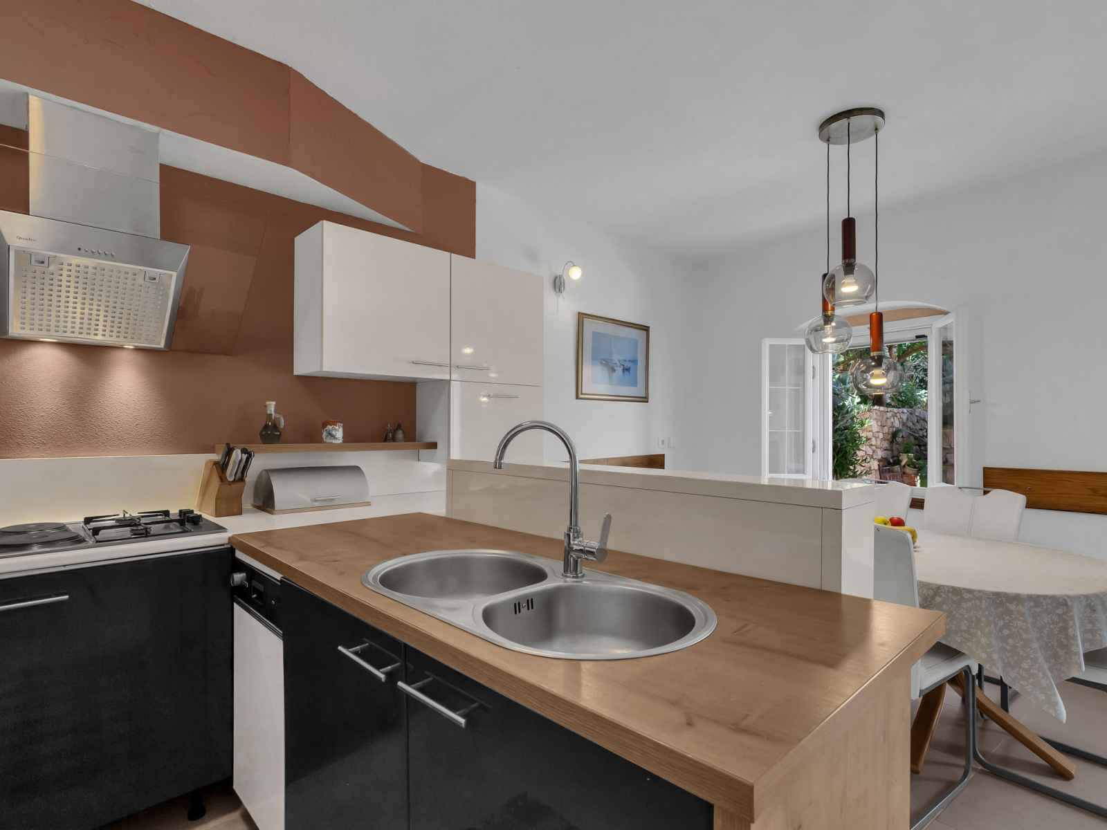 Maison 3 pièces 165 m2 sur 2 niveaux. séjour/chambre à coucher 22 m2 avec 2 divans-lits (80 cm, longueur 200 cm), tv (satellite), air-conditionné et ventilateur. sortie sur le jardin, sur la terrasse. cuisine (4 plaques de cuisson, four, lave-vaisselle, congélateur, cafetière électrique) avec table pour les repas. sortie sur la terrasse.