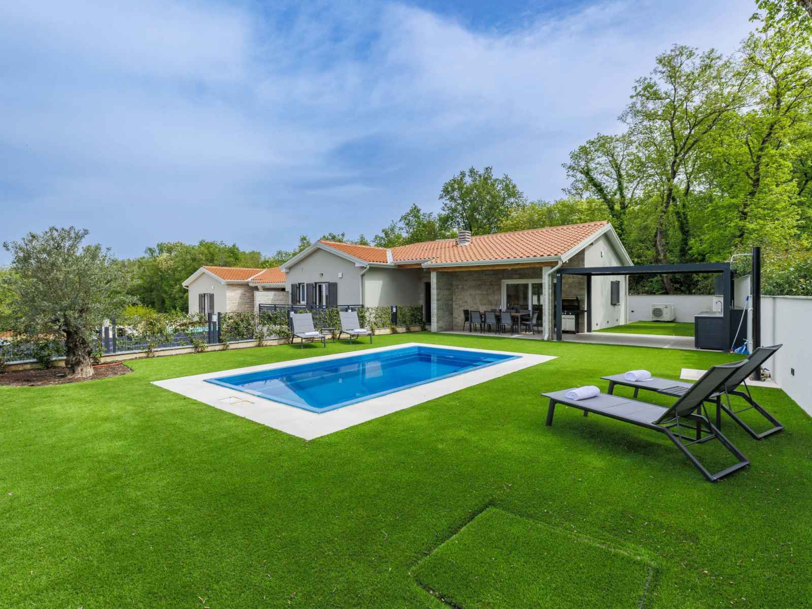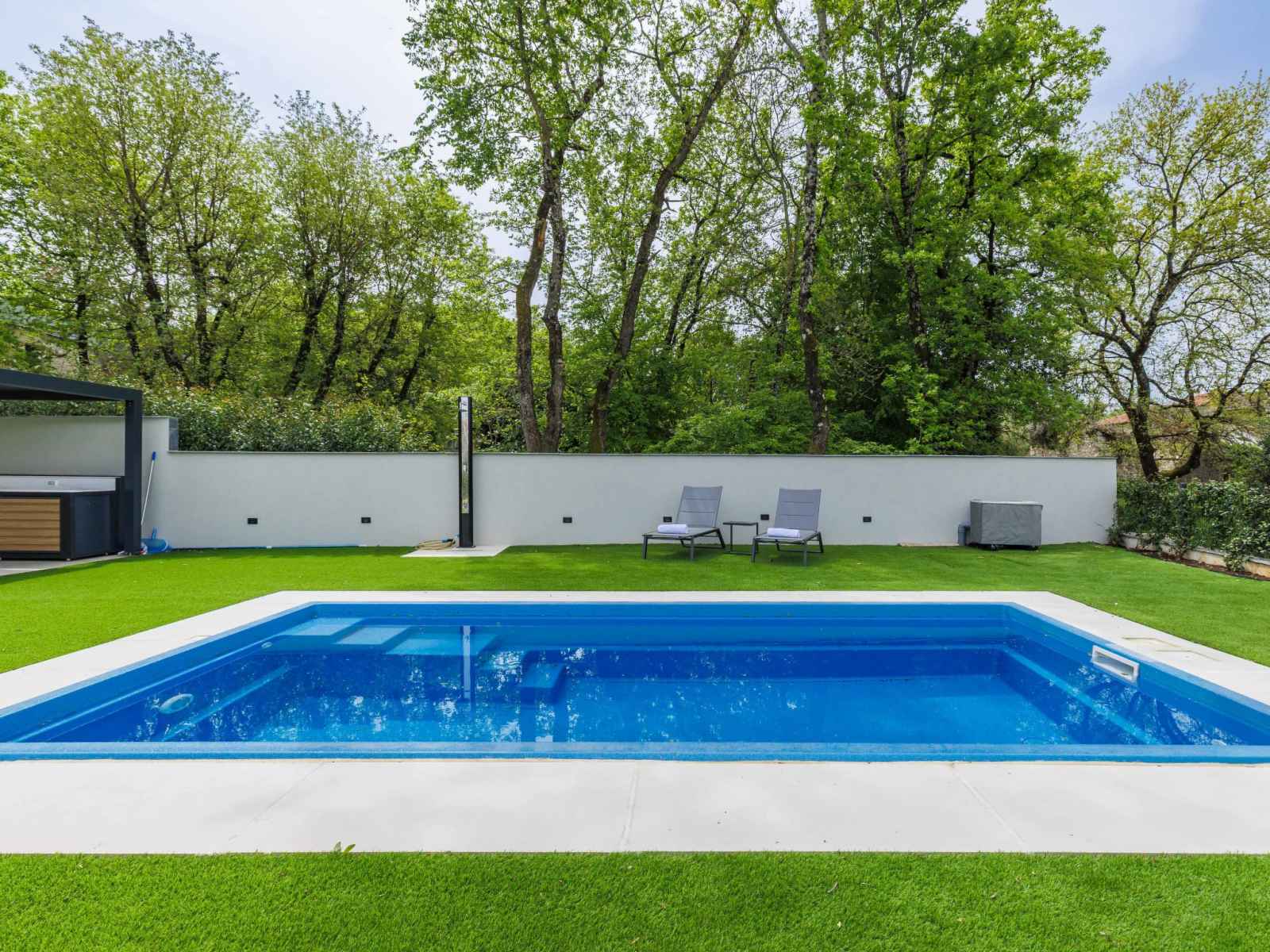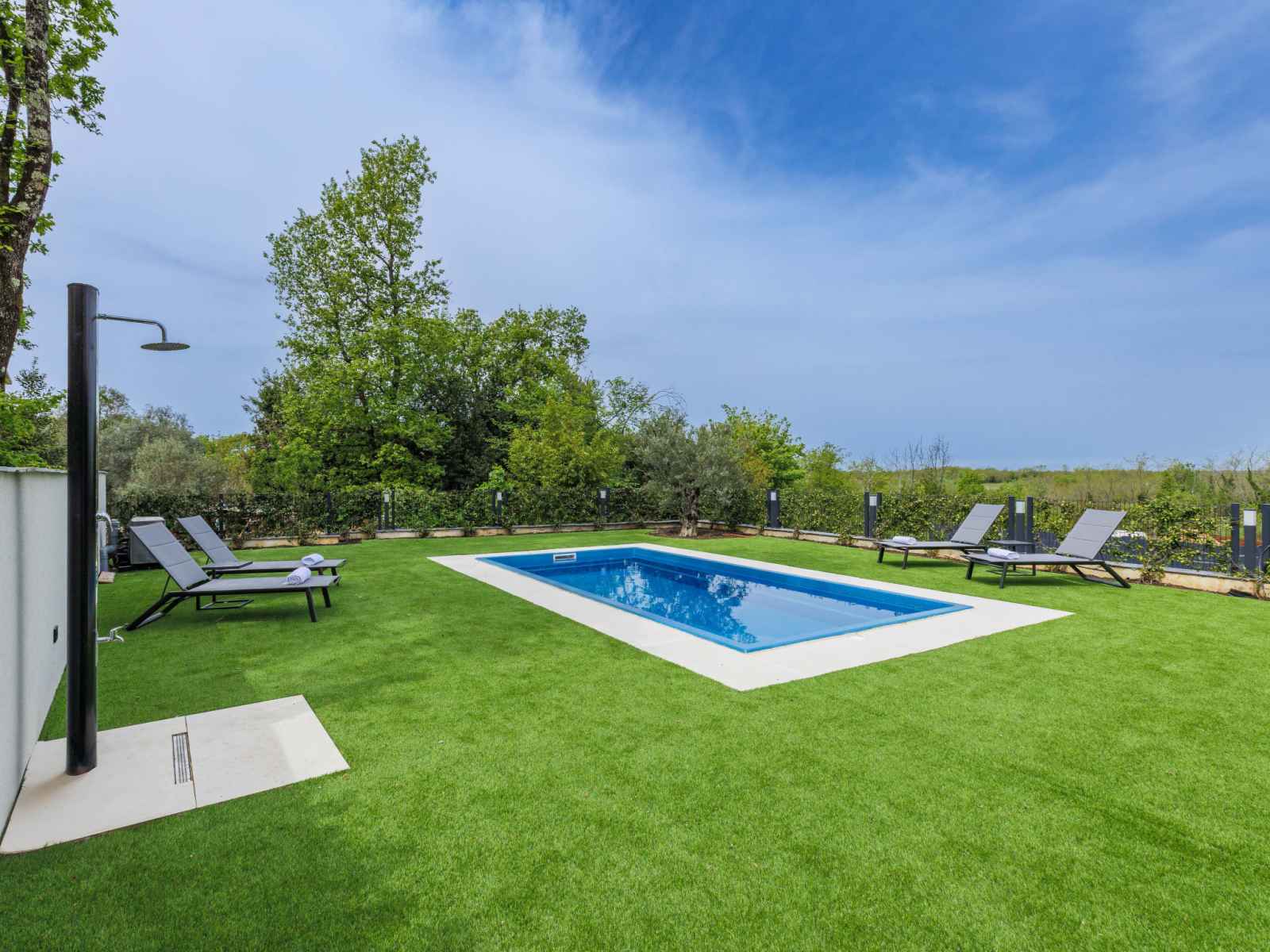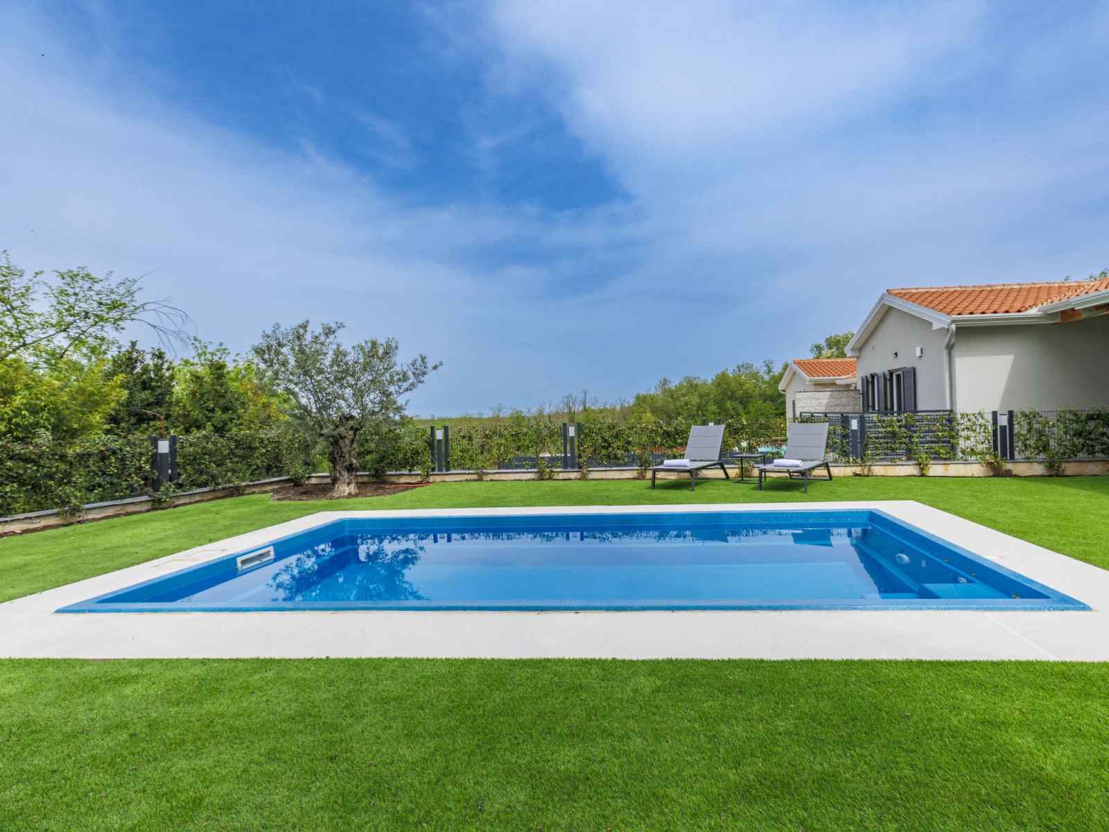 Maison individuelle "villa zoia", année de construction 2024. dans le hameau de frleti, à 9 km du centre d'umag, situation tranquille, ensoleillée, à 4 km de la mer, dans une impasse, dans la verdure. a usage privé: terrain 200 m2 (clôturé), piscine rectangulaire, chauffée (6 x 3 m, profondeur 145 cm, disponibilité saisonnière: 01.mai. -