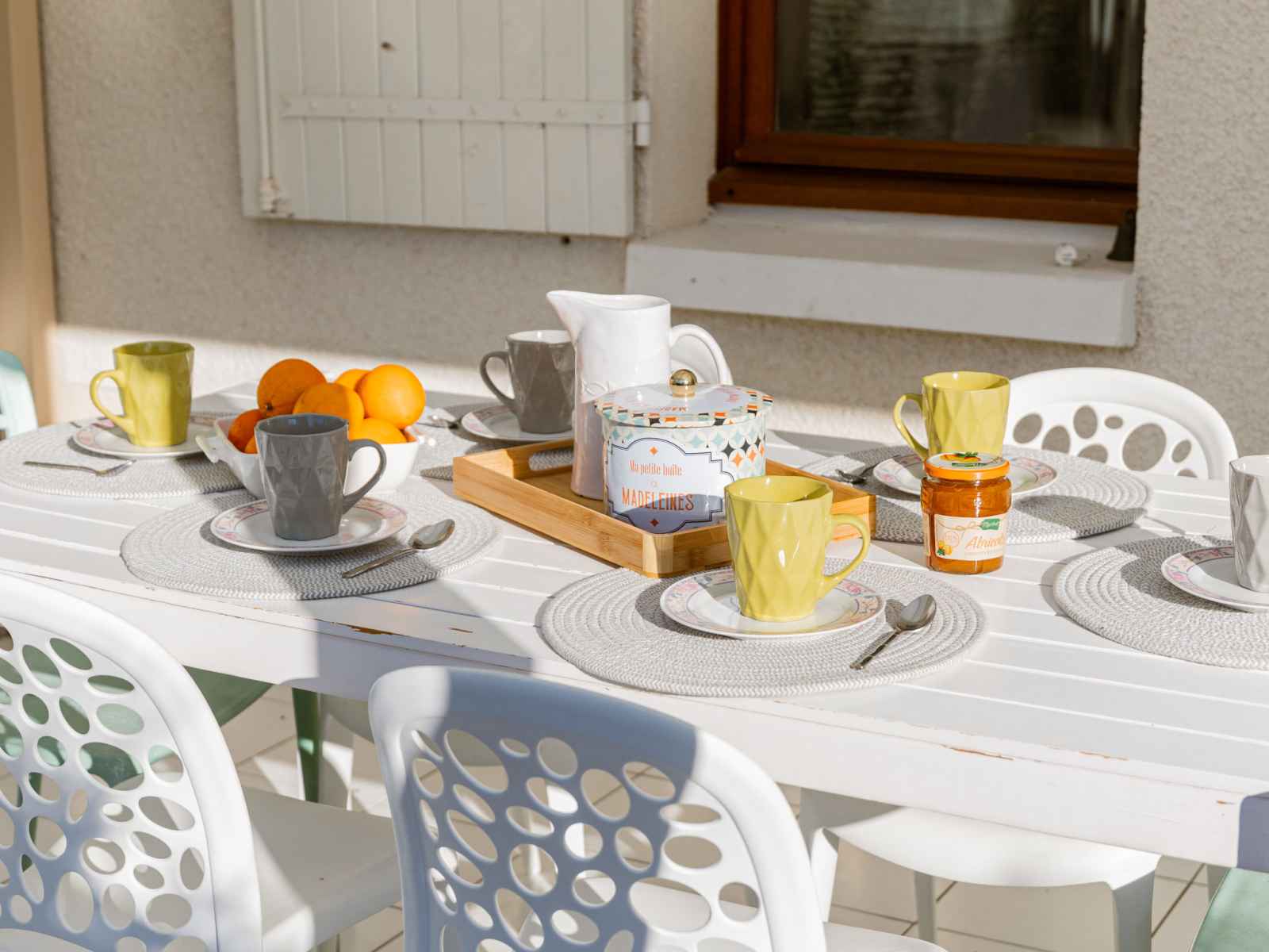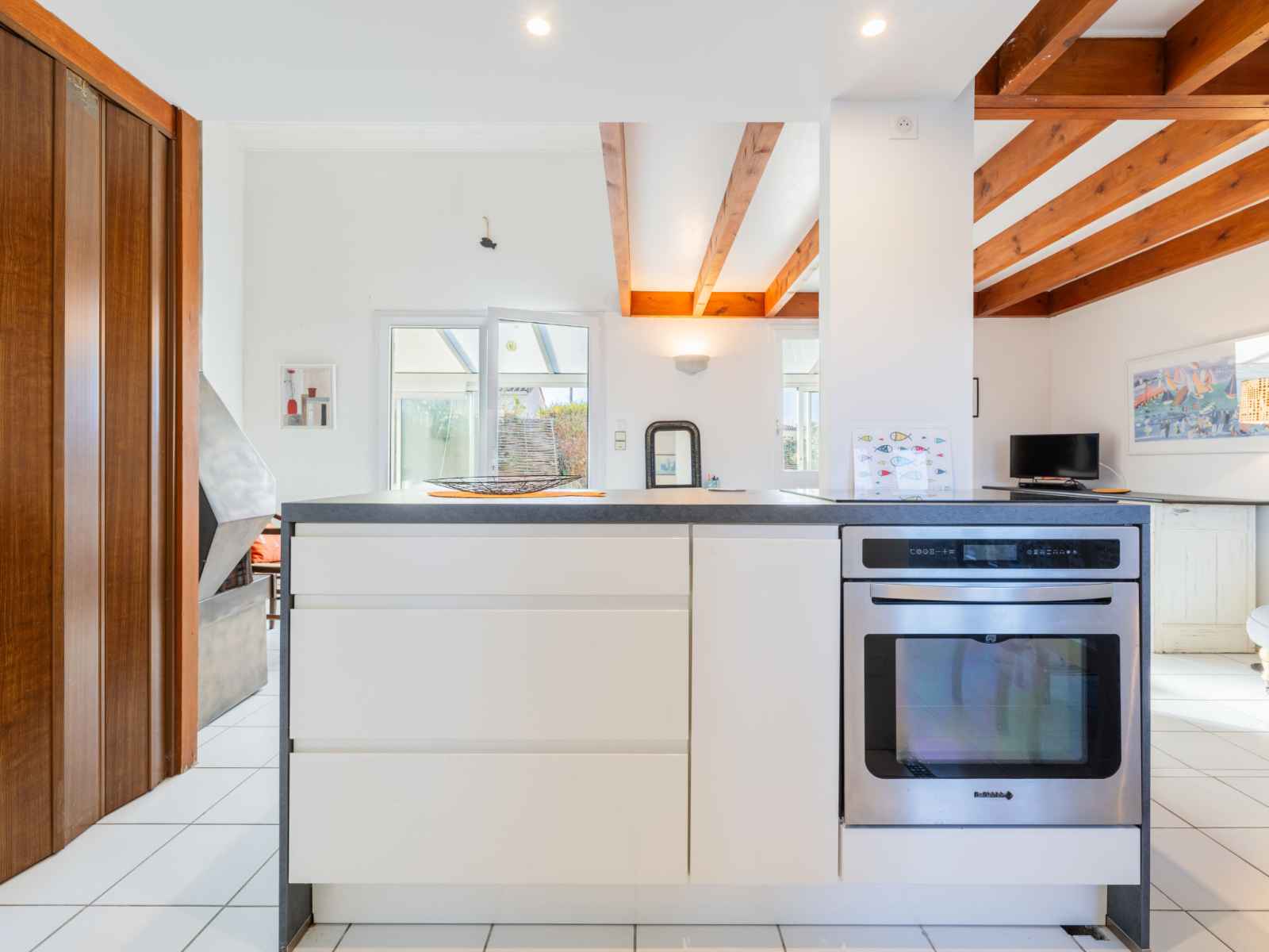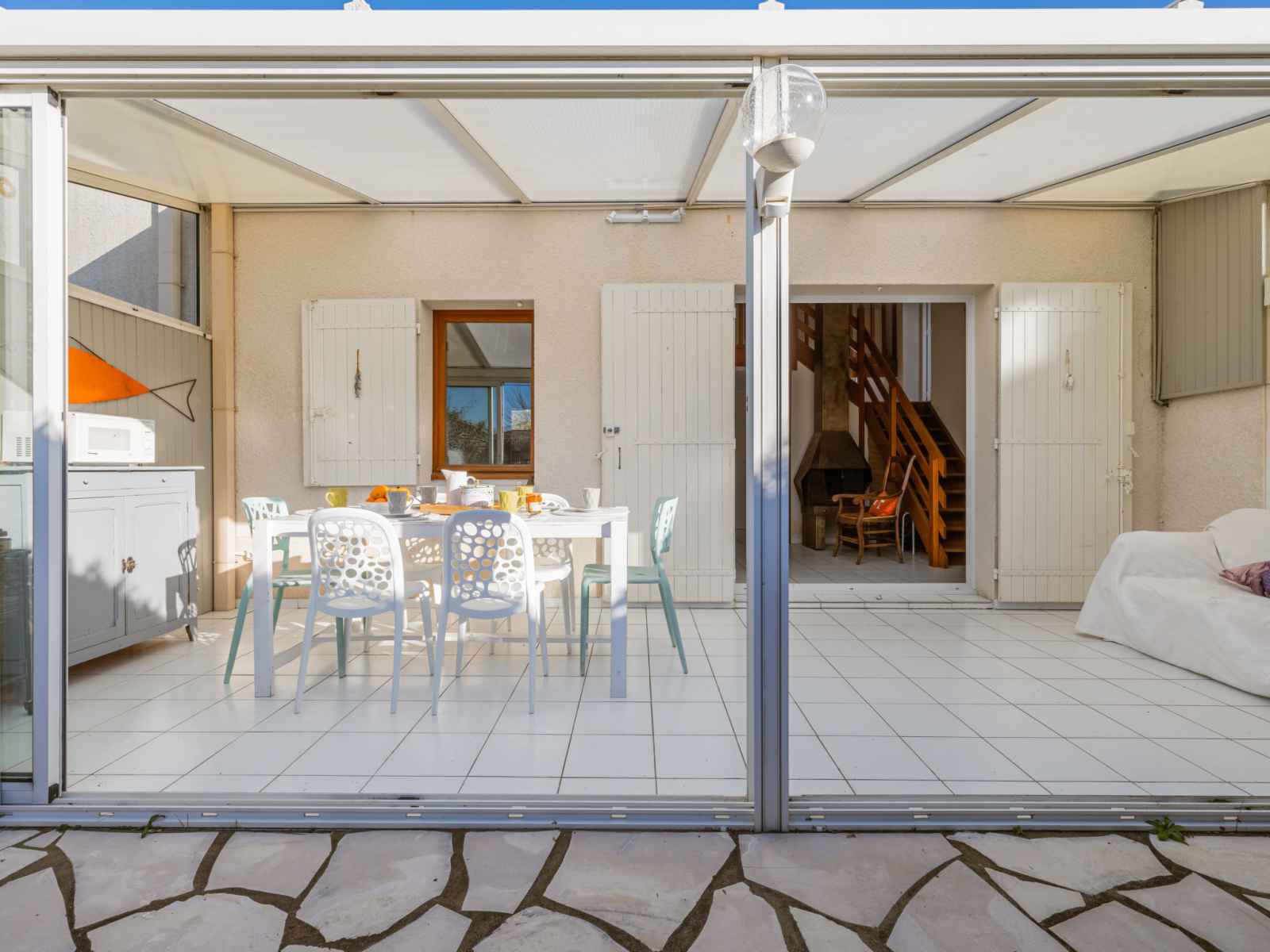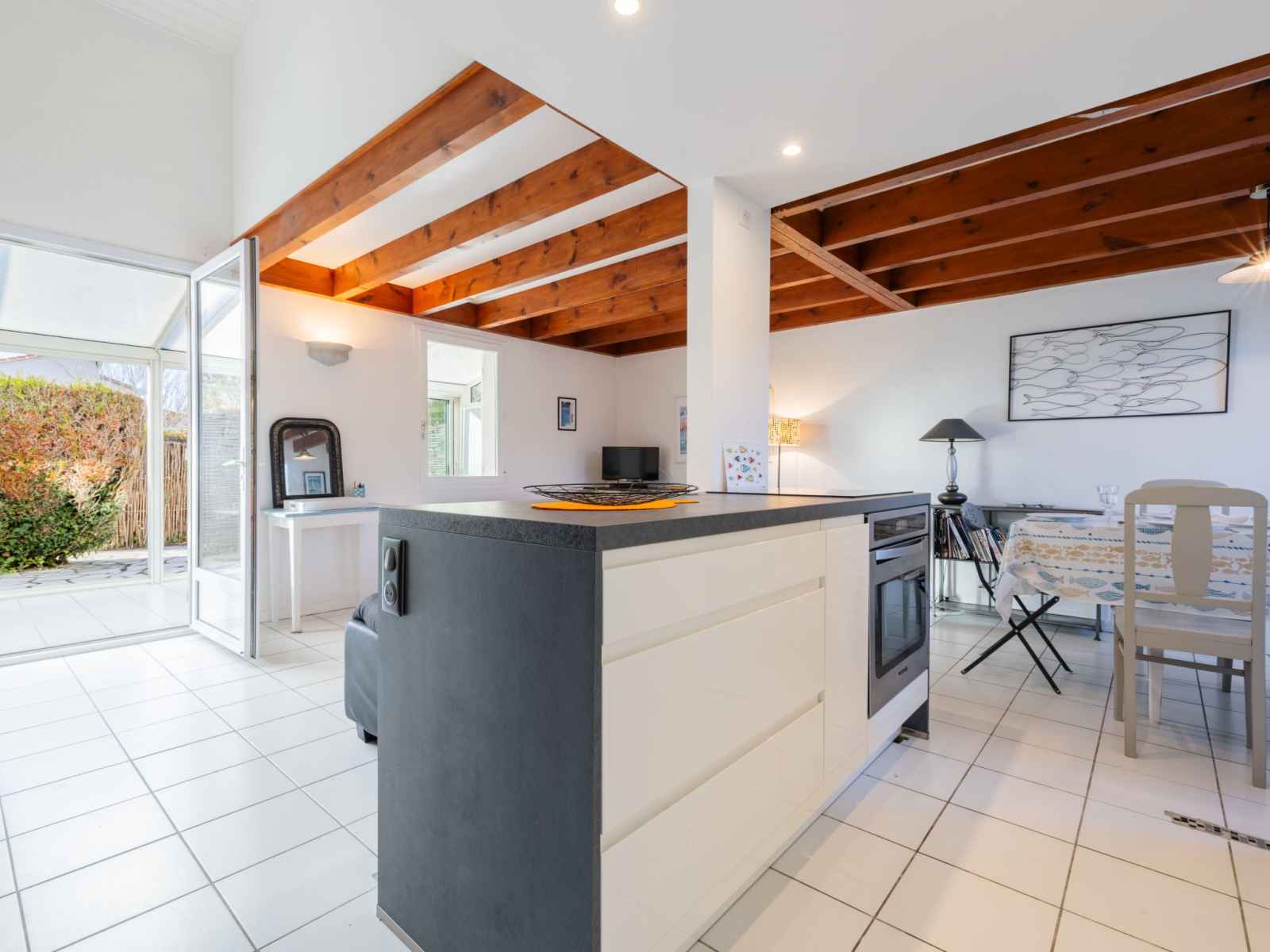 Maison mitoyenne 4 pièces 70 m2 sur 2 niveaux, rez-de-chaussée surélevé, situation sud. séjour/salle à manger avec véranda avec cheminée (uniquement à titre de décoration), tv (écran plat). sortie sur la terrasse. petite cuisine (four, lave-vaisselle, 3 plaques à induction, grille-pain, bouilloire électrique, micro-ondes,