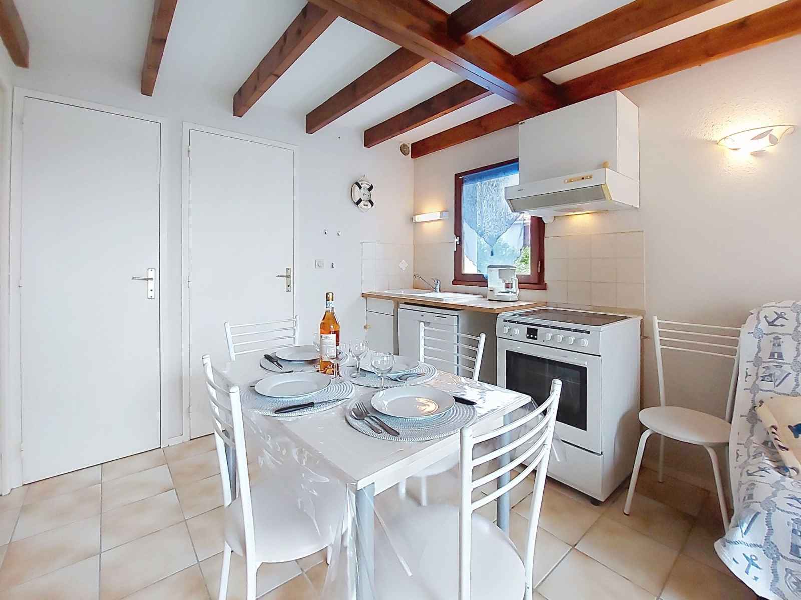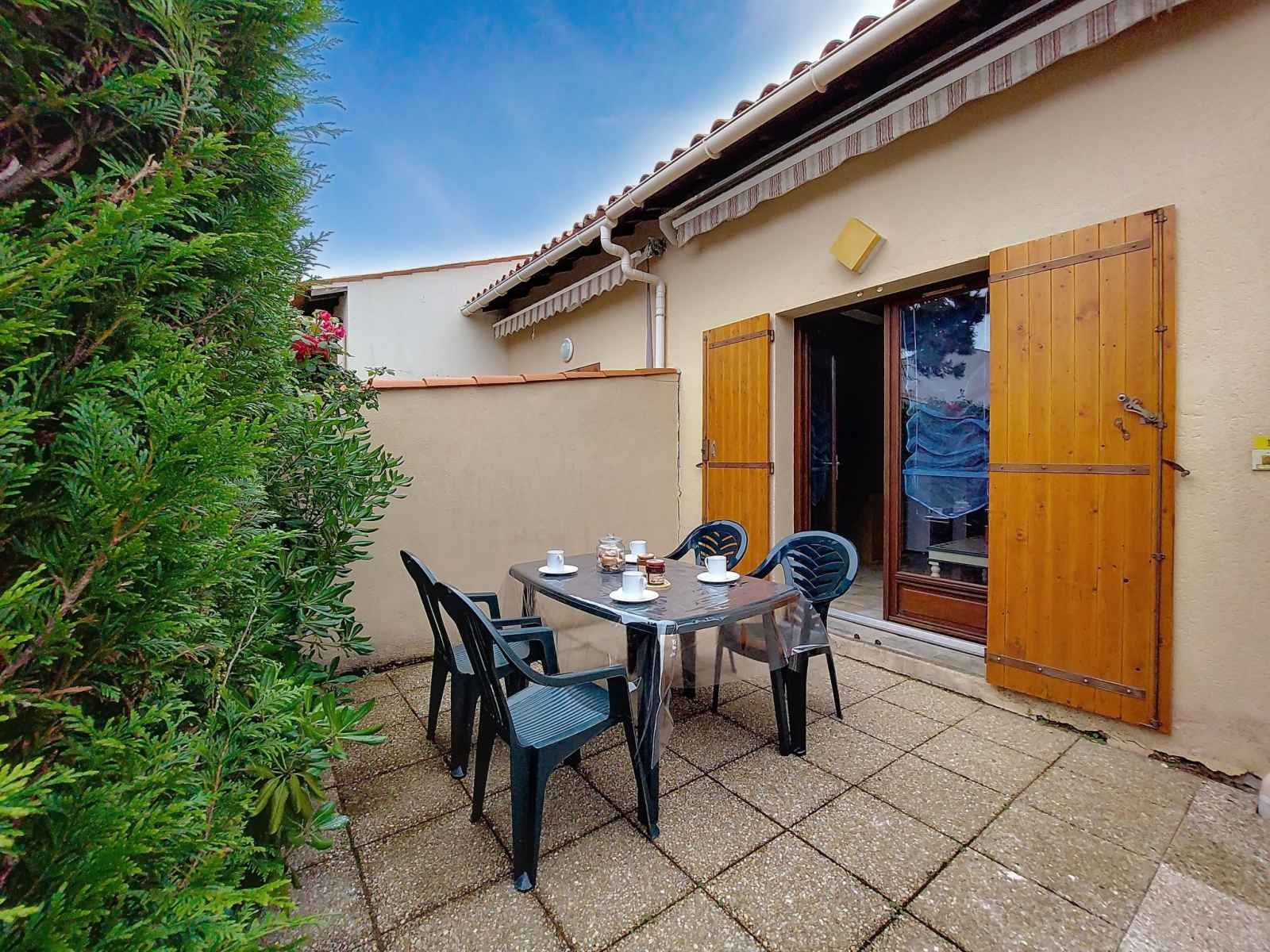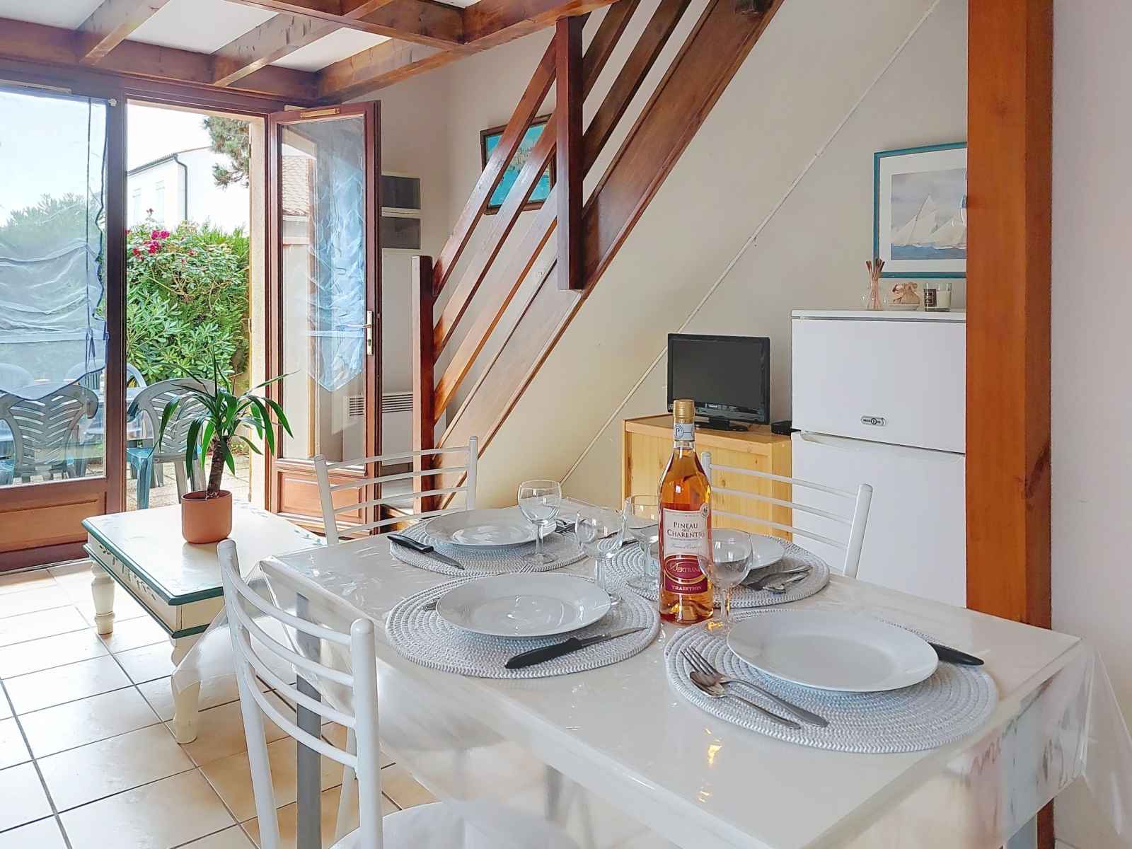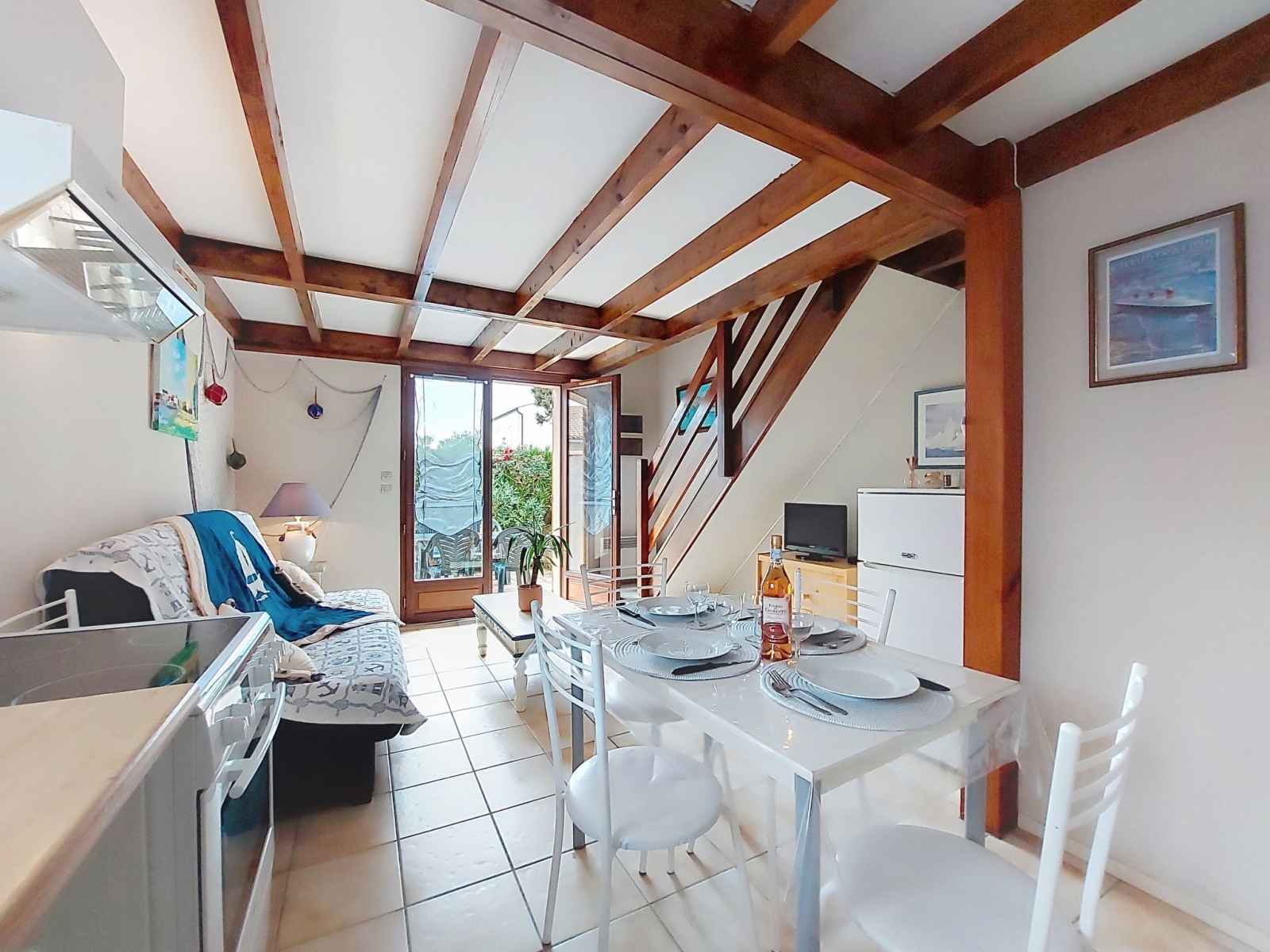 Maison mitoyenne 3 pièces 42 m2 sur 2 niveaux, situation ouest. séjour avec tv (écran plat). sortie sur la terrasse. coin cuisine (four, lave-vaisselle, 4 plaques à induction, congélateur, cafetière électrique). douche, wc séparé. chauffage électrique. À l'étage supérieur: 1 chambre avec 1 grand-lit (1 x 140 cm, longueur 190 cm), tv
