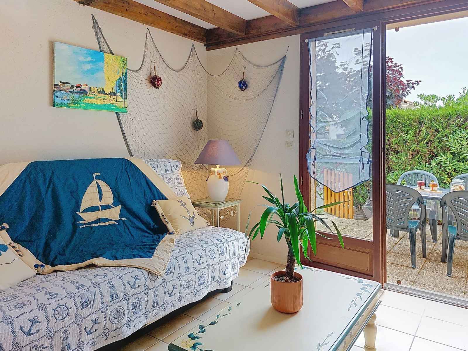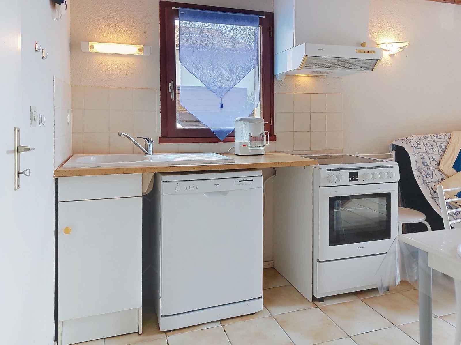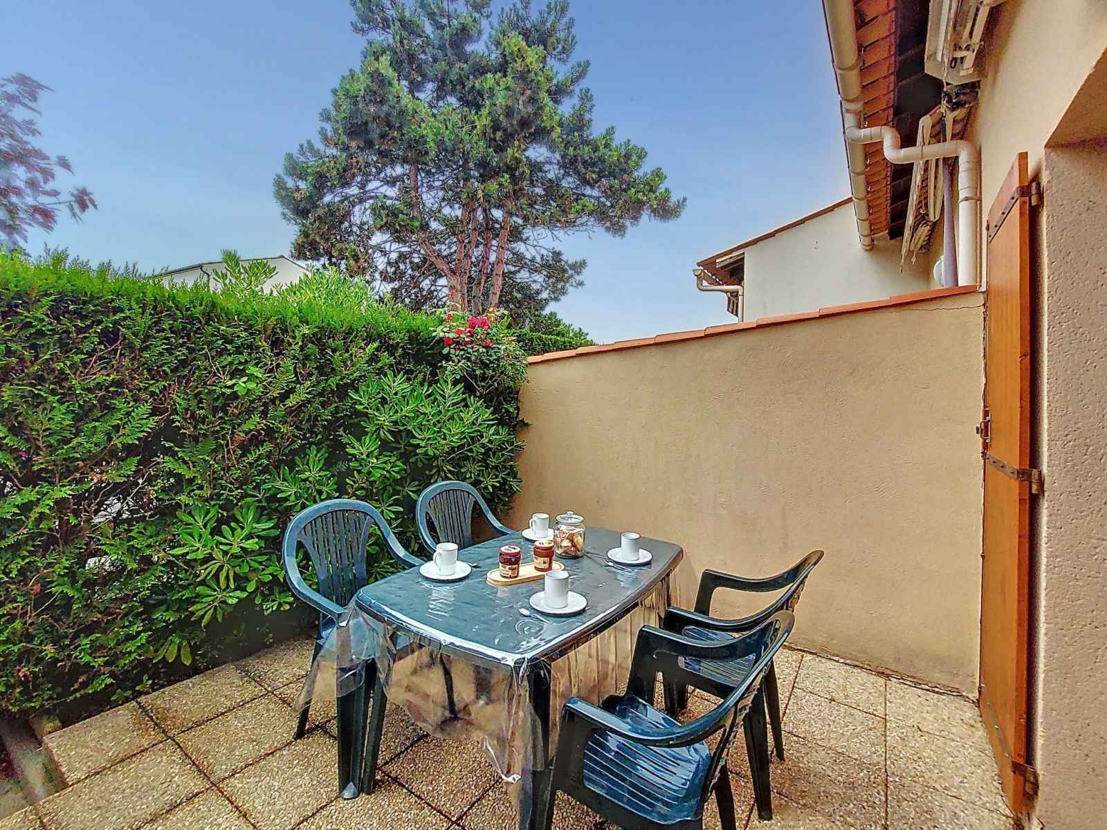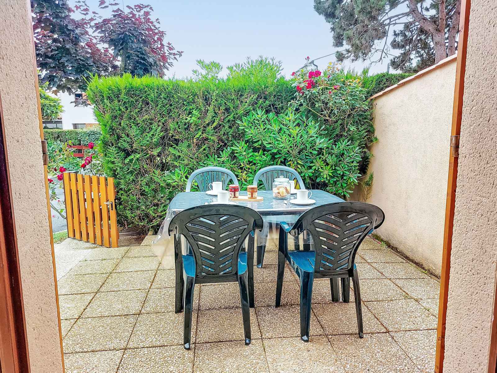Maison mitoyenne 3 pièces 42 m2 sur 2 niveaux, situation ouest. séjour avec tv (écran plat). sortie sur la terrasse. coin cuisine (four, lave-vaisselle, 4 plaques à induction, congélateur, cafetière électrique). douche, wc séparé. chauffage électrique. À l'étage supérieur: 1 chambre avec 1 grand-lit (1 x 140 cm, longueur 190 cm), tv